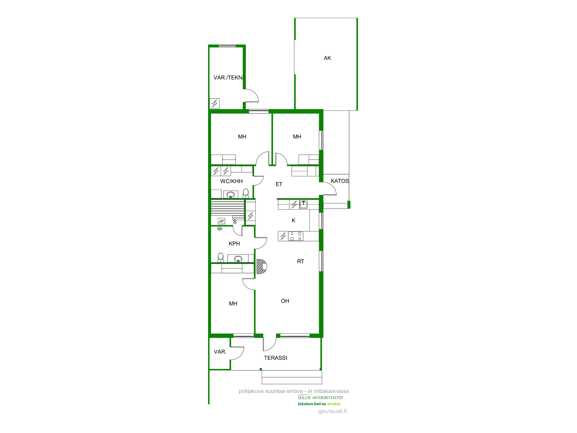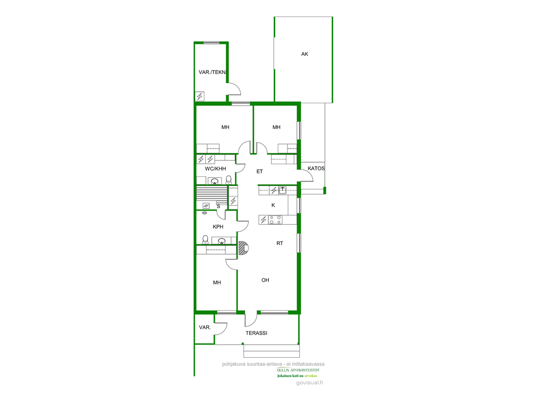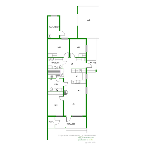 Varusteet: kaapistot, sälekaihtimet/rullaverhot, verhotangot, kiinteät valaisimet, ilmalämpöpumppu, huoneistokohtainen ilmanvaihtokone