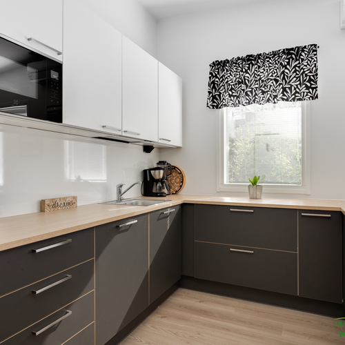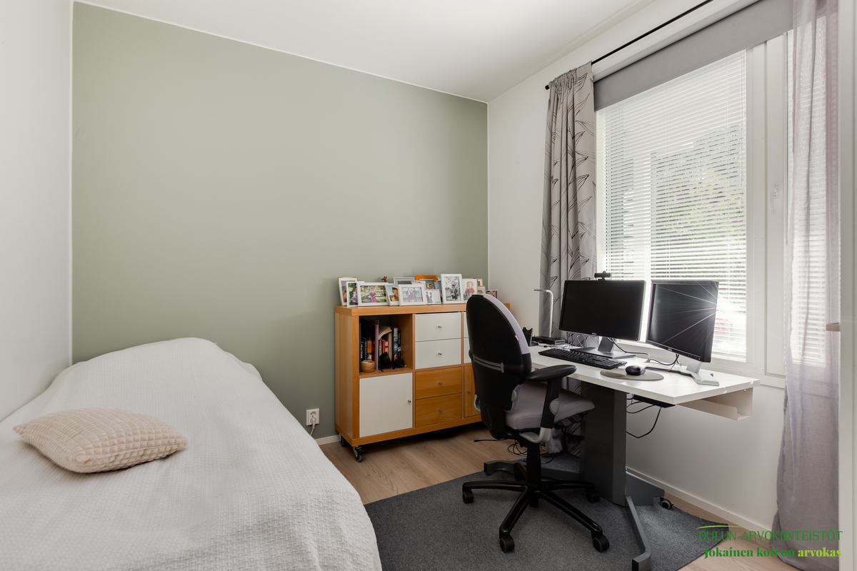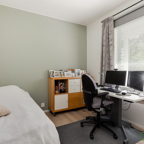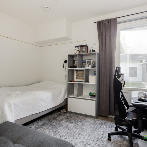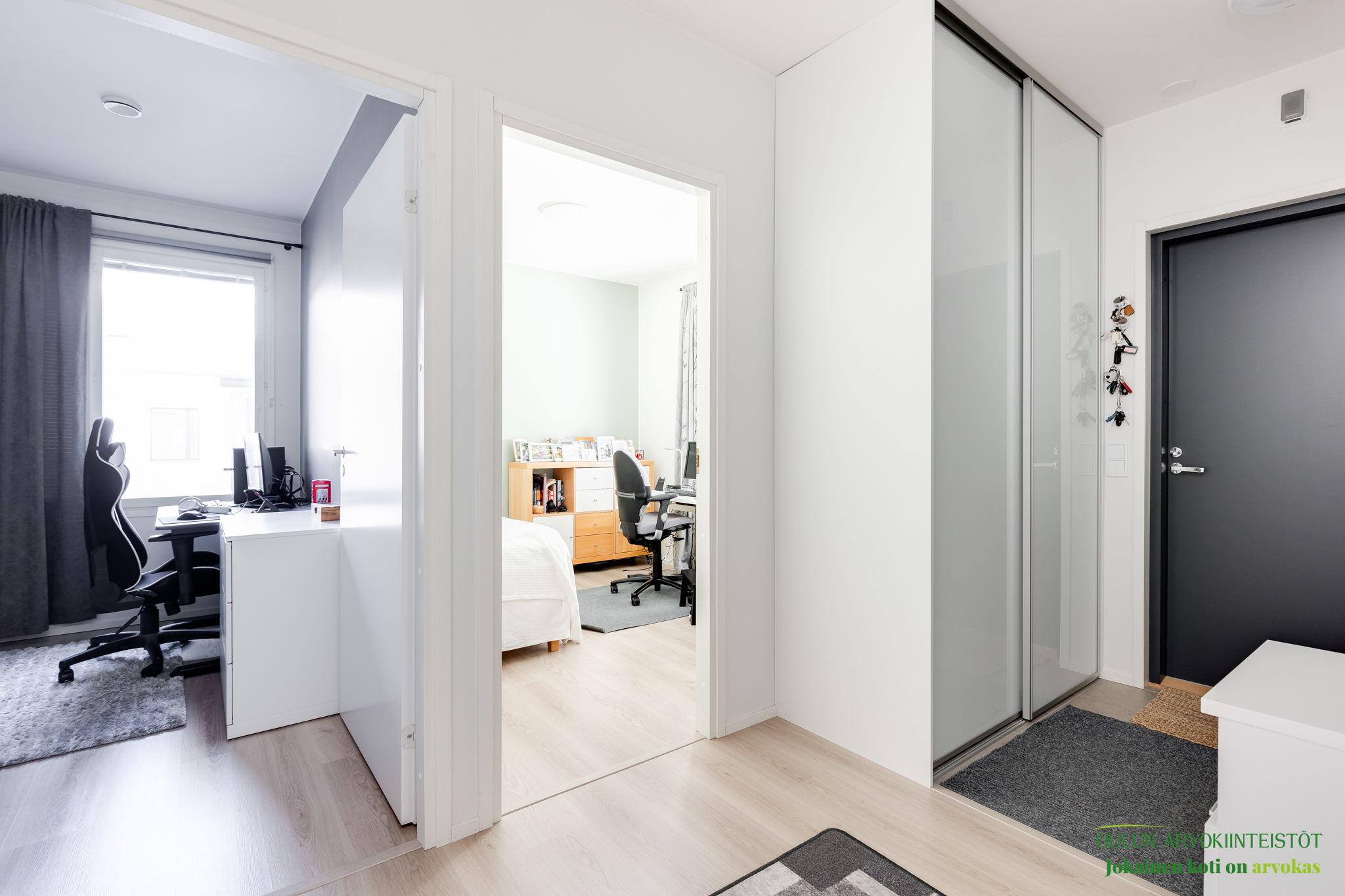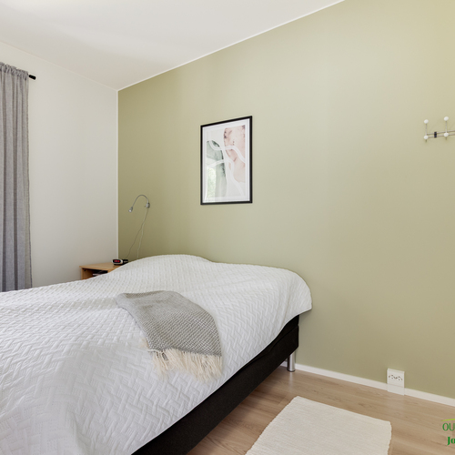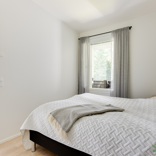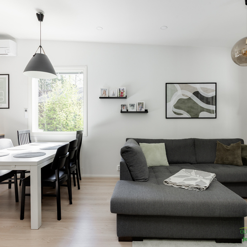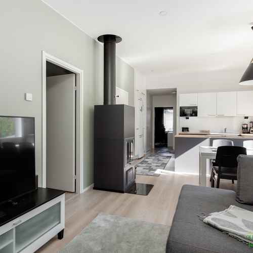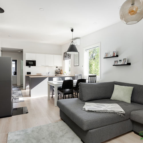 Keittiö on varusteltu nykyaikaisin integroiduin kodinkonein ja keittotasotuuletin pitää ilman raikkaana ruoanlaiton aikana. Olohuoneessa tunnelmaa tuo varaavatakka, joka on omiaan syysiltojen lämmikkeeksi. Kolme makuuhuonetta mahdollistavat tilaratkaisuja eri elämäntilanteisiin.