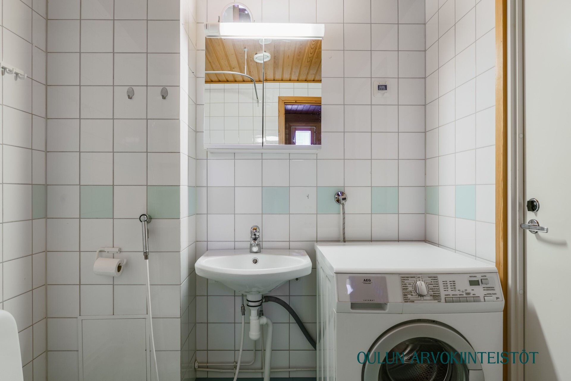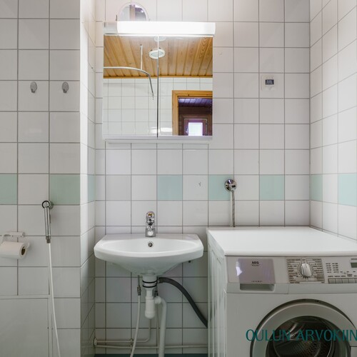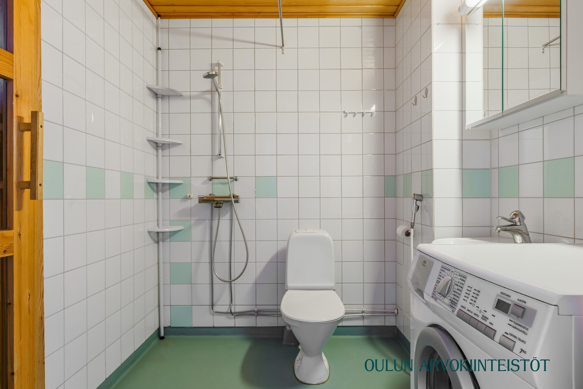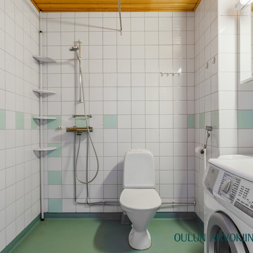 Varusteet: pesukoneliitäntä, wc-istuin, suihku, peilikaappi, kiinteät valaisimet