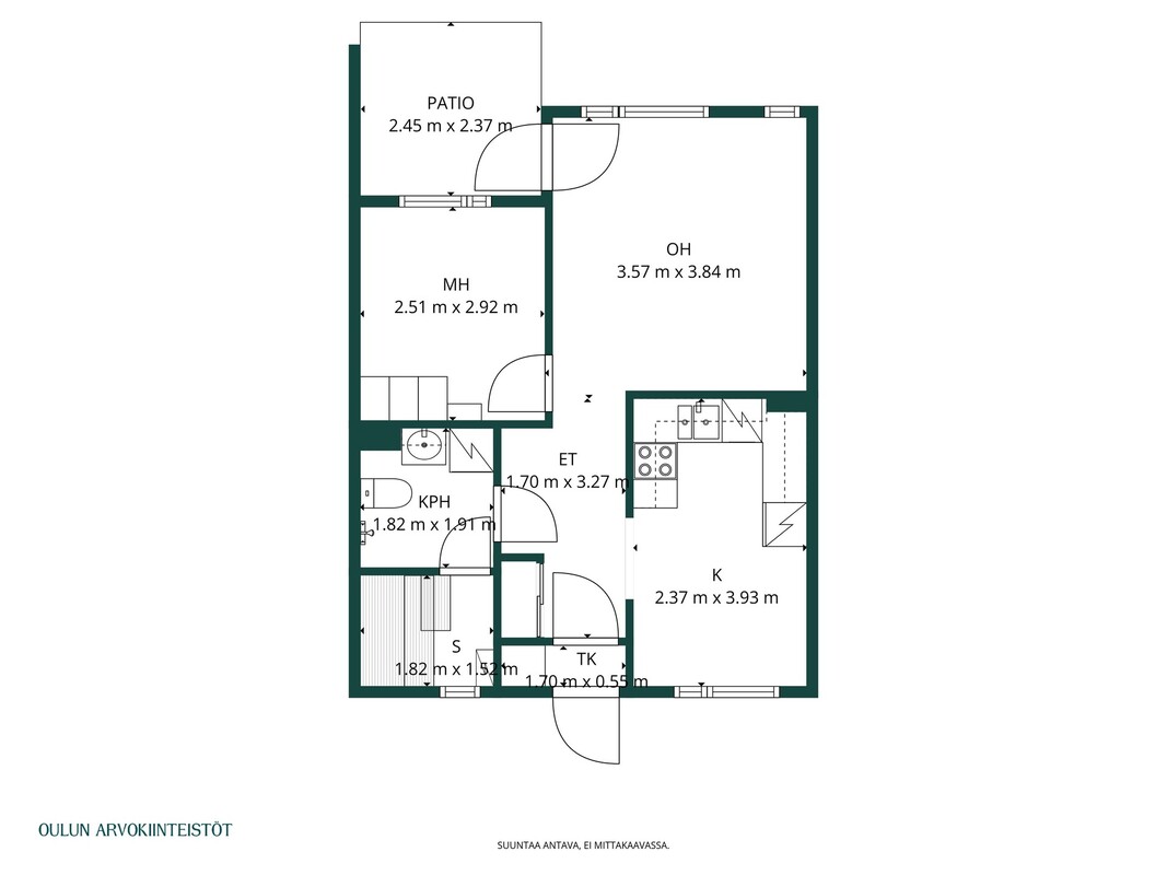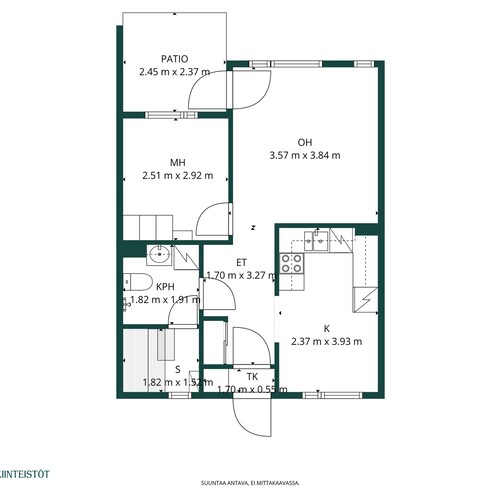 Huoneistossa on toimiva pohjaratkaisu: olohuone, keittiö, makuuhuone ja oma sauna. Olohuoneesta on kulku etelään suuntautuvalle terassille, jossa voit nauttia auringosta omassa rauhassa. Keittiöstä löytyy tarpeellinen varustelu, ja makuuhuone on selkeä ja helposti sisustettava. Kylpyhuoneessa on suihku ja pesukoneliitäntä.