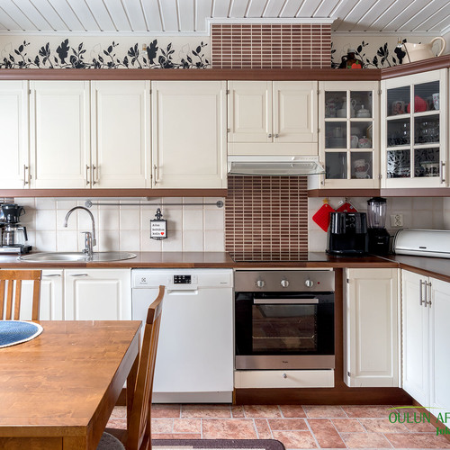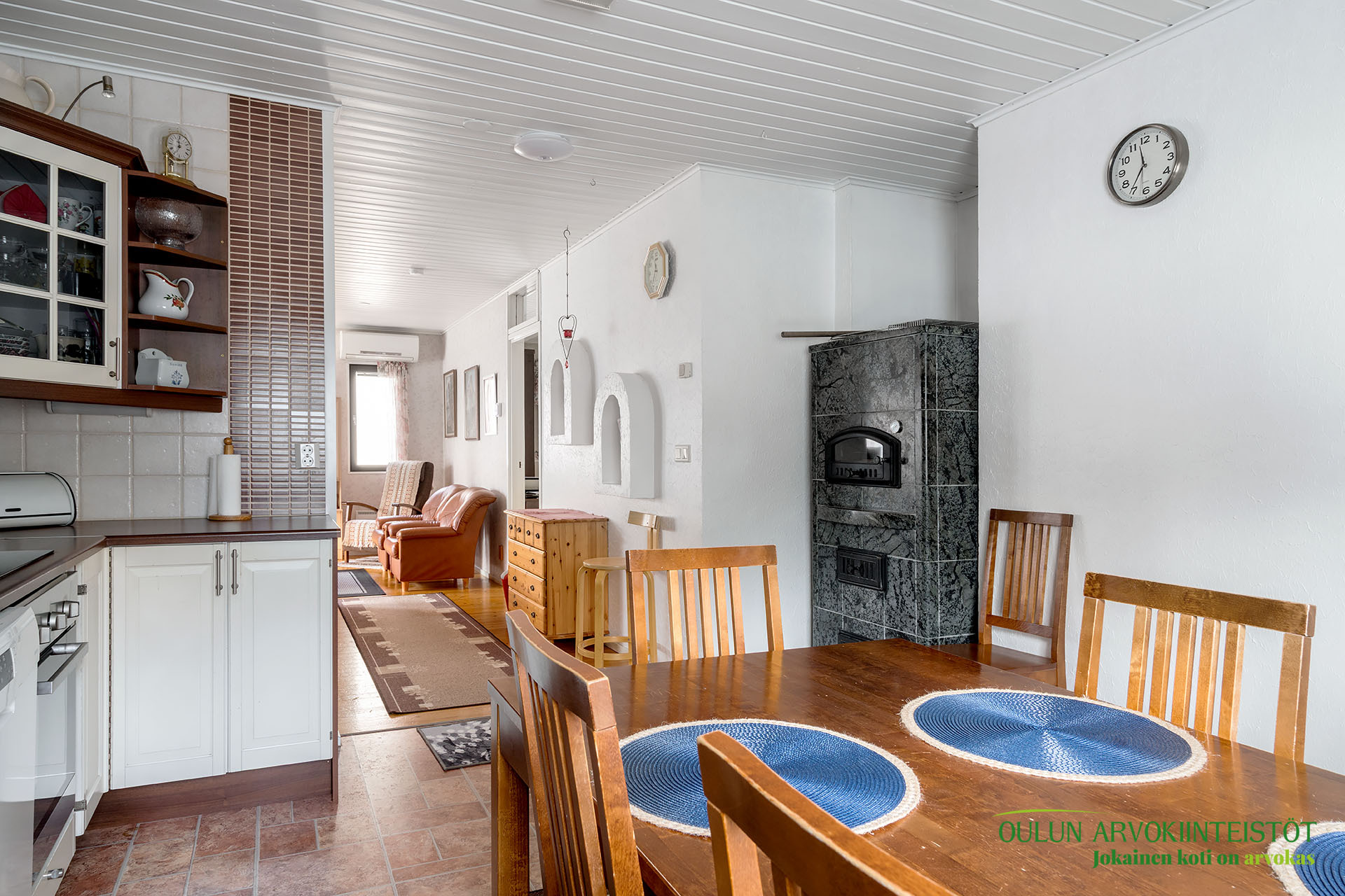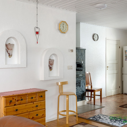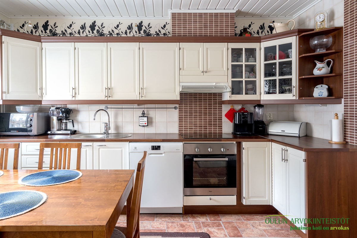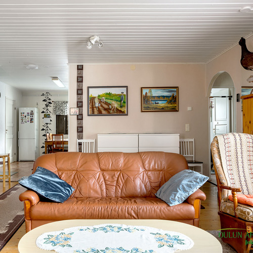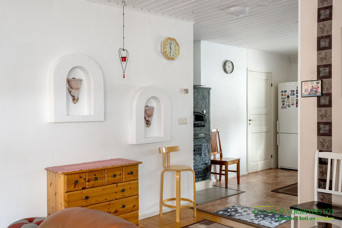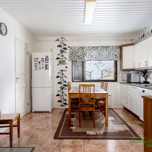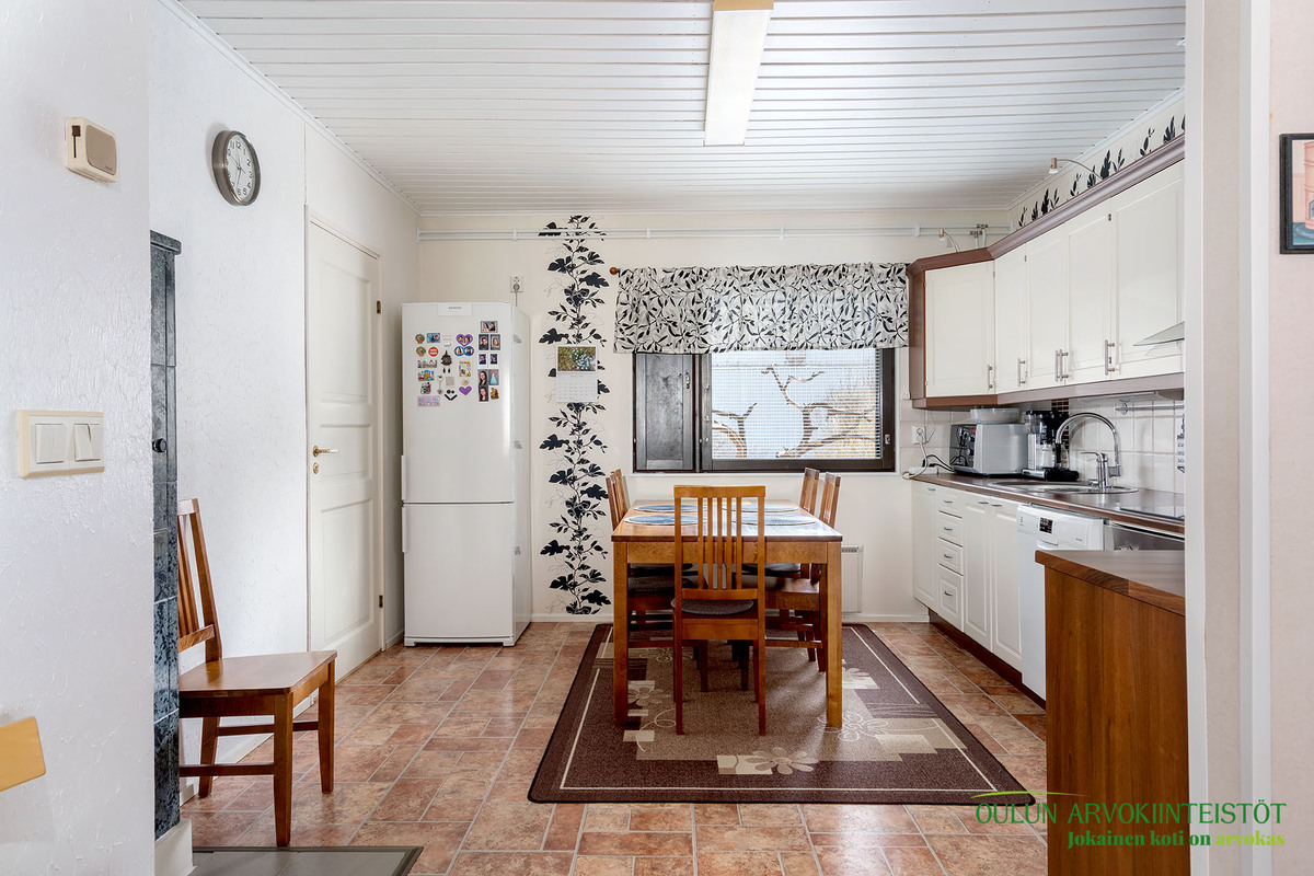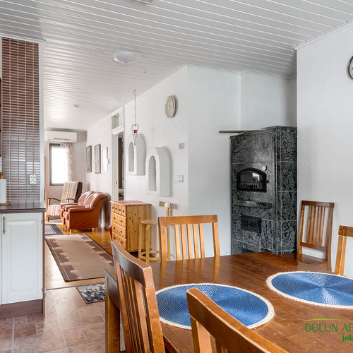 Mukavan kokoisesta olohuoneesta pääset suoraan kodin sydämeen, eli keittiöön. Täällä on mukavasti kaappitilaa ja nykyaikaiset kodinkoneet. Lisäksi lämpöä tuo vuolukiven varaava leivinuuni mikä tuo säästöä lämmityskustannuksissa!