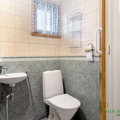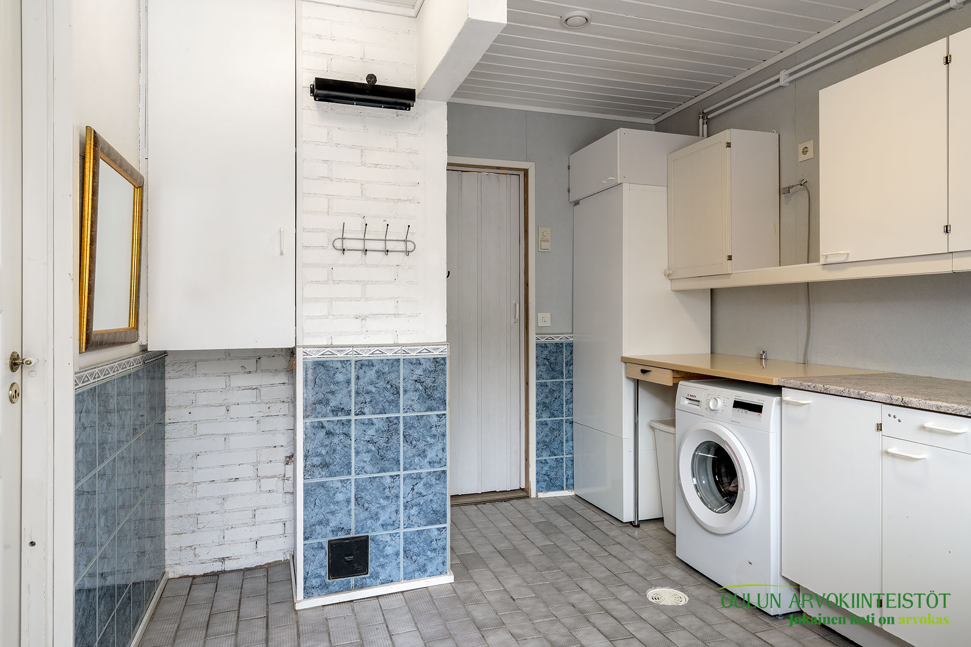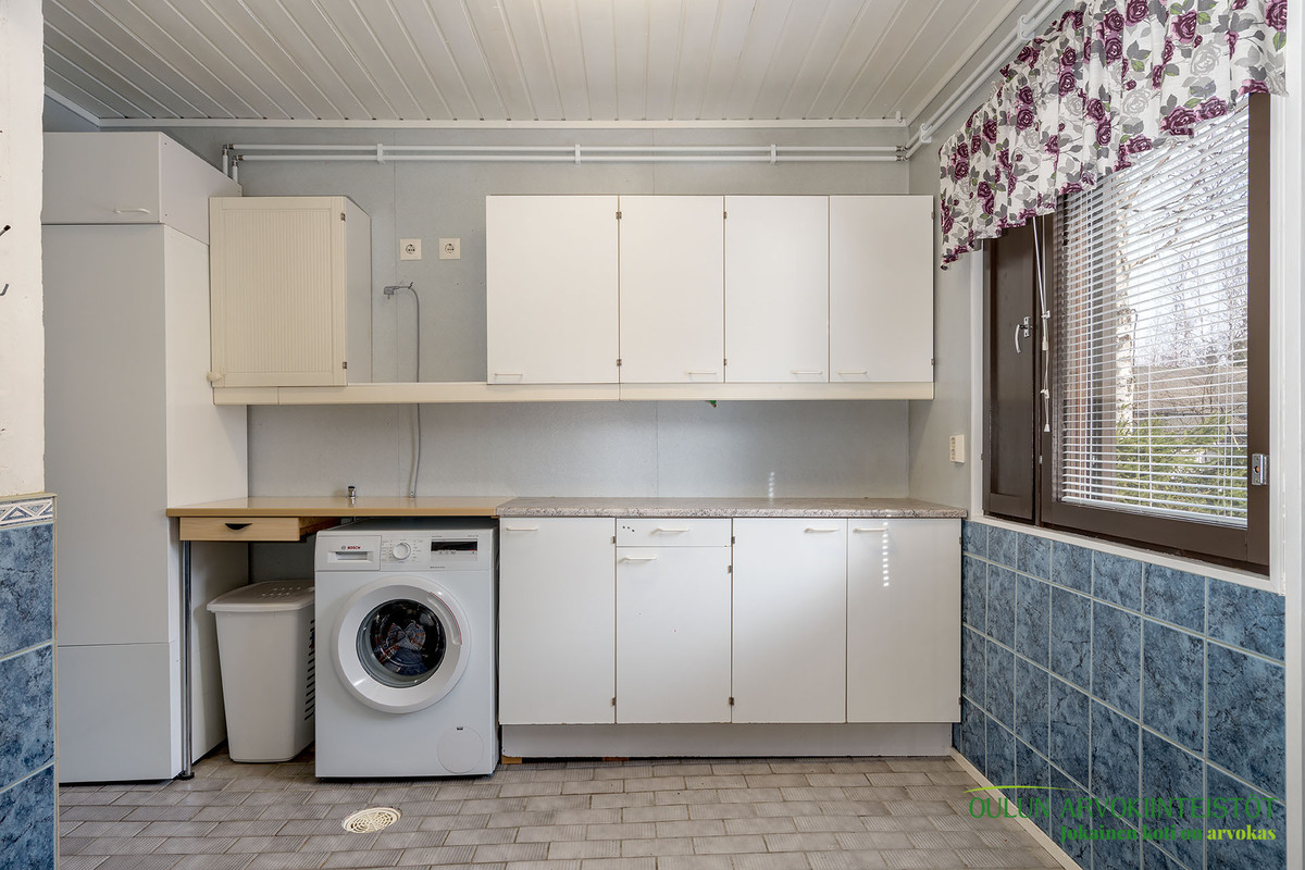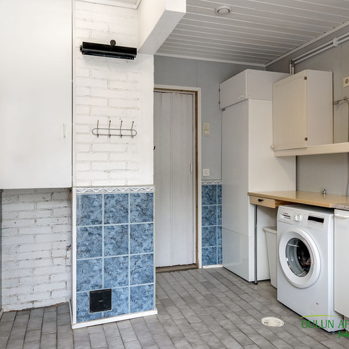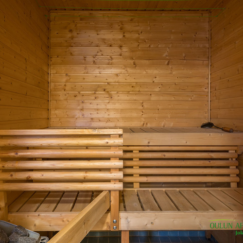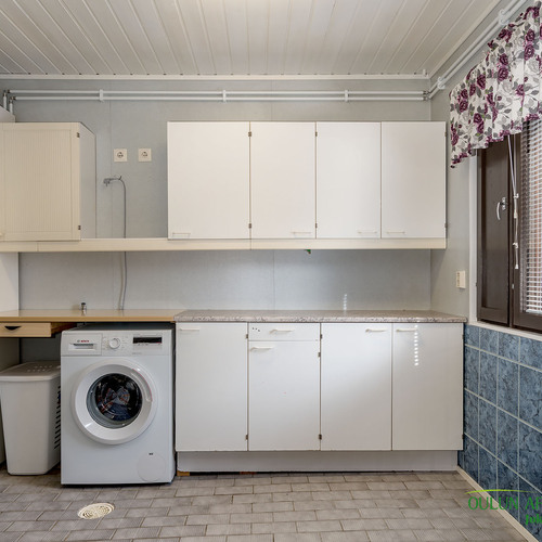 Sopivan kokoisessa kodinhoitohuoneessa pyykkihuolto sujuu vaivattomasti ja helposti. Kodinhoitohuoneen, sekä kylpyhuoneen ja saunan ratkaisut ovat toimivat ja järkevät. Täältä pääset mukavasti saunan löylyjen jälkeen suoraan ulos vilvoittelemaan.
