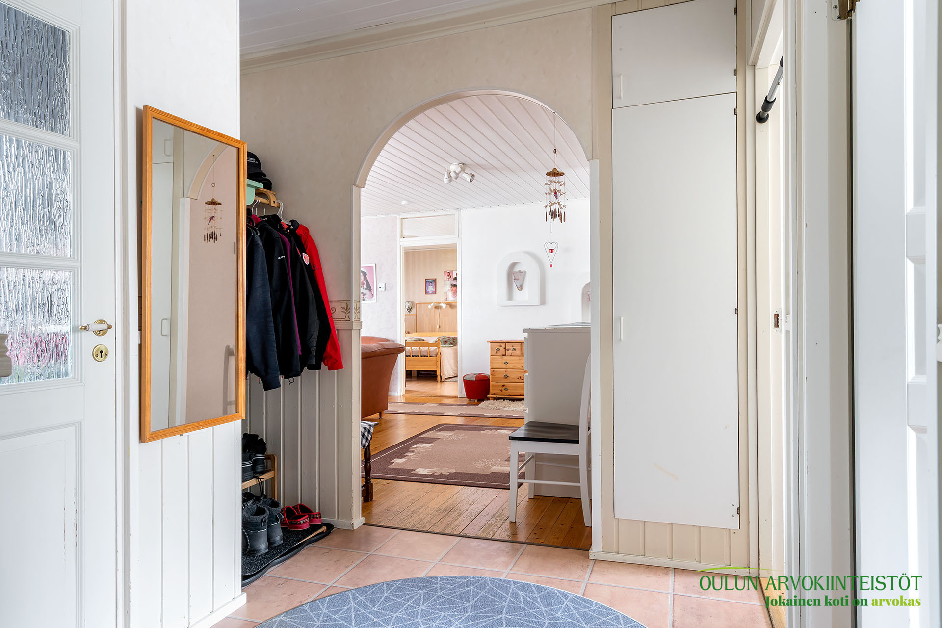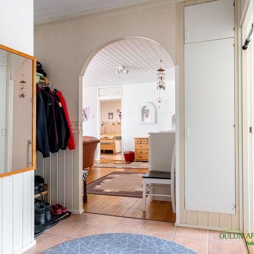 Eteisen aulatila on tilankäytön kannalta erittäin käytännöllinen. Sisään astuessasi huomaat heti viihtyisän ilmapiirin.