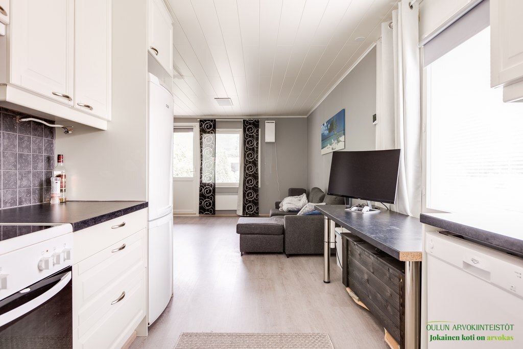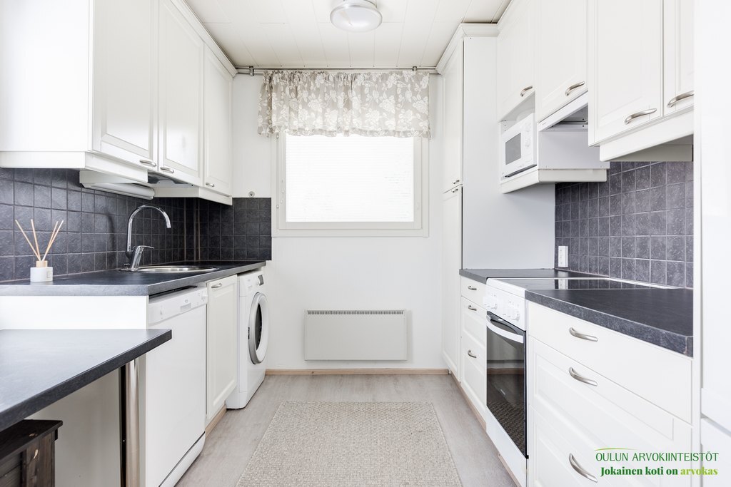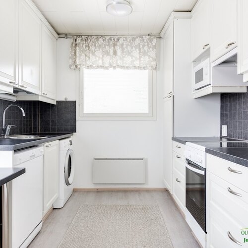 Remontoitu. Keittiössä pyykinpesukone.