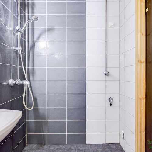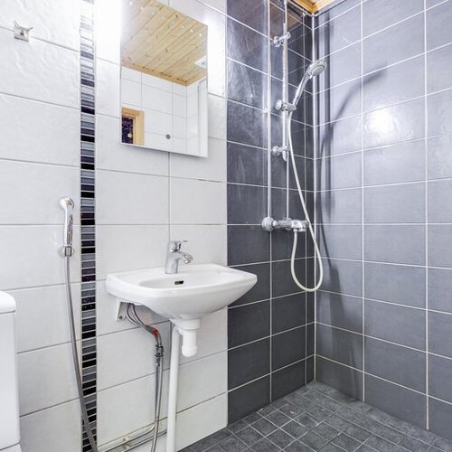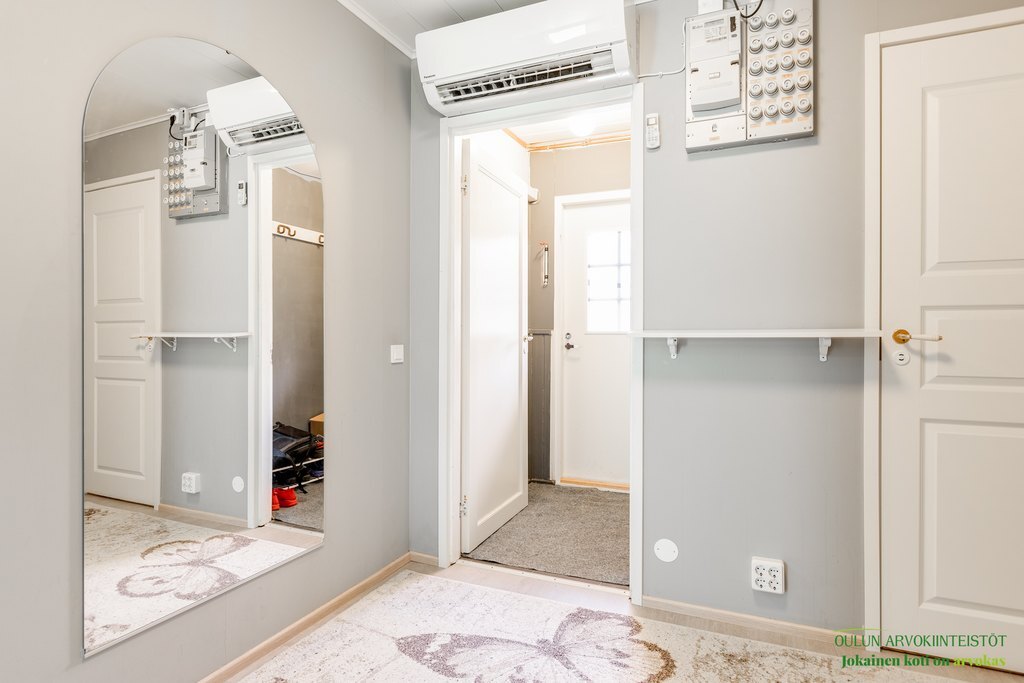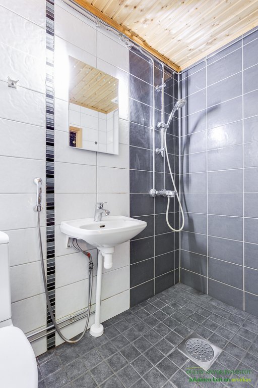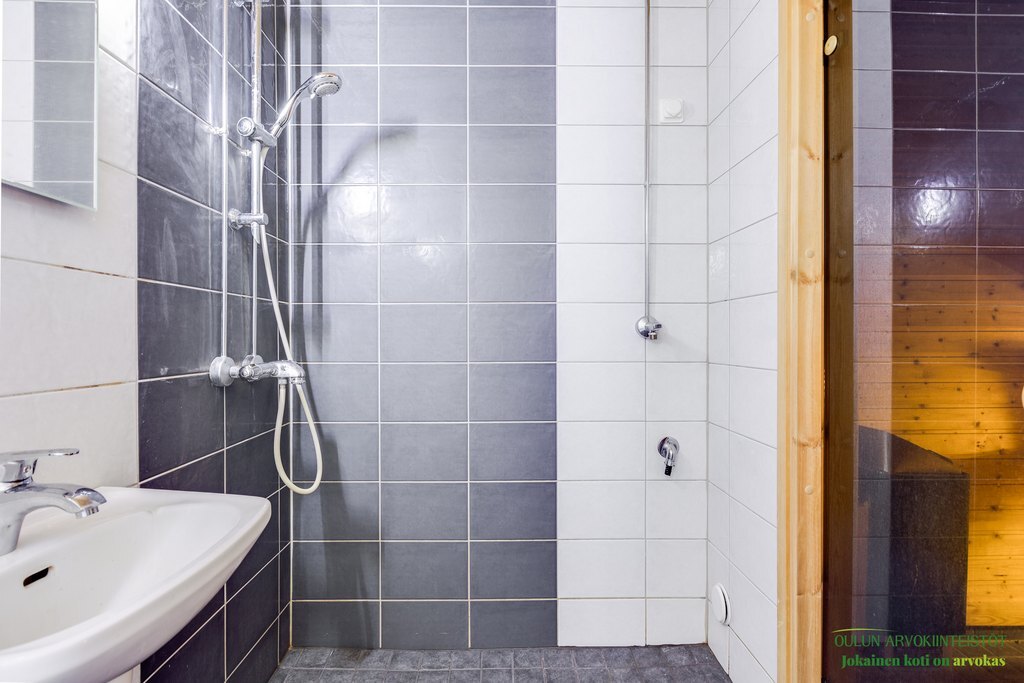 Varusteet: pesukoneliitäntä, lattialämmitys, wc-istuin, suihku, peili, kylpyhuonekaapisto