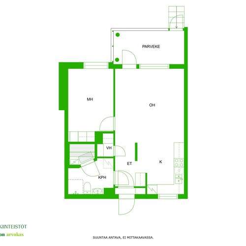 Varusteet: kaapistot, sälekaihtimet/rullaverhot, kiinteät valaisimet, huoneistokohtainen ilmanvaihtokone