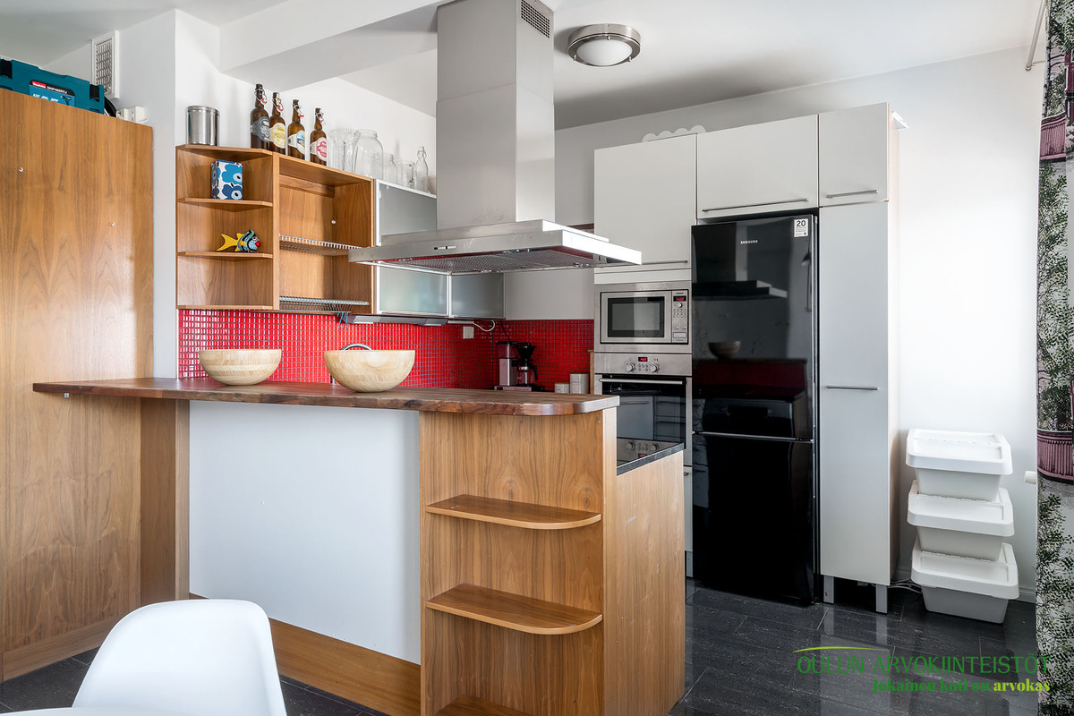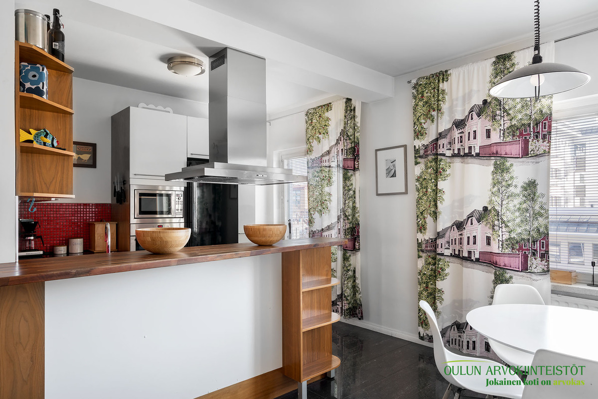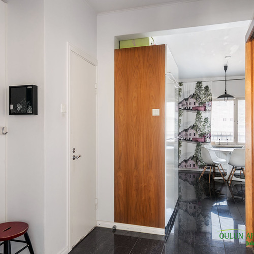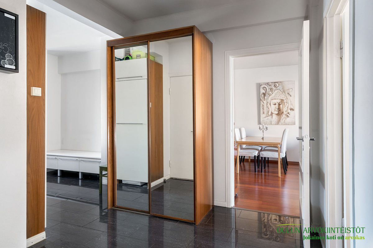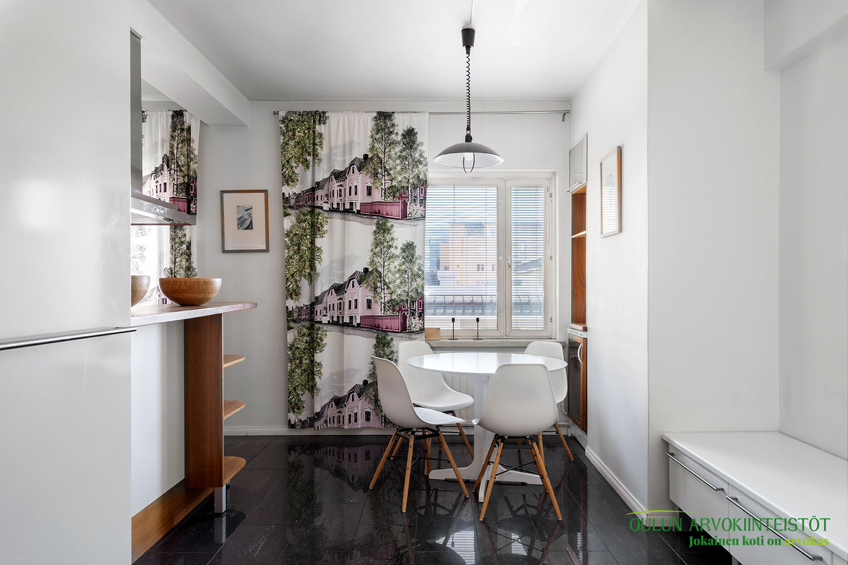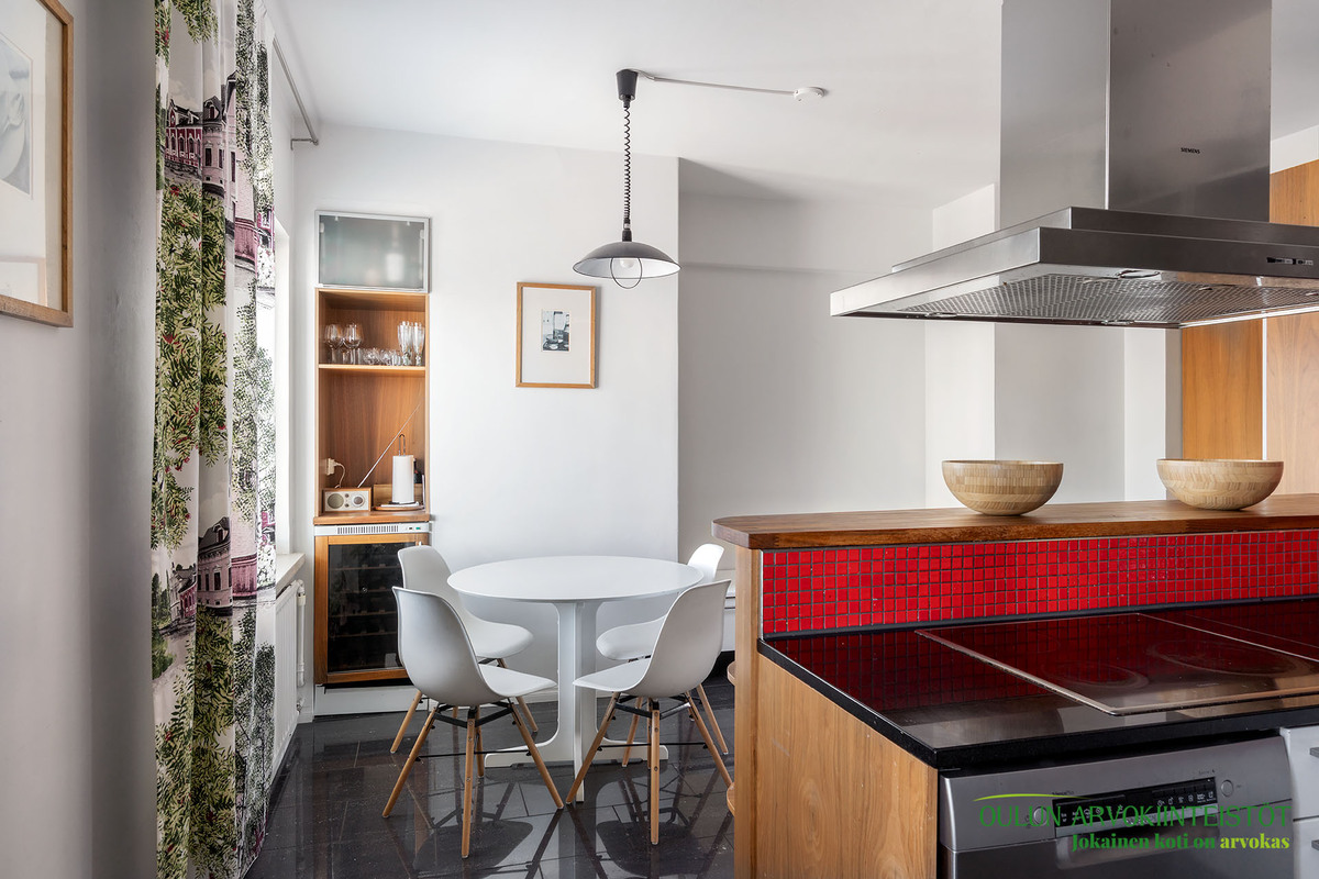 Tämän kodin avaraan eteisaulaan astuttaessa katse kiinnittyy kauniiseen, käytännölliseen sekä kulutusta kestävään laattalattiaan, joka johtaa keittiöön saakka. Luonnonvalo tulvii läpitalon huoneistoon, korostaen kauniisti talon historiaa kunnioittavaa, upeasti käsiteltyä parkettilattiaa. Huoneet huokuvat tilan tuntua ja harmonista rauhaa, sillä neutraalit ja luonnonläheiset sävyt luovat ajattoman tunnelman. Tämä levollinen värimaailma saa rohkean ja piristävän säväyksen keittiön punaisesta välitilalaatasta. Keittiön avaran tilan ansiosta se kutsuu viihtymään. Seurustelu ja kokkailu soljuvat täällä vaivattomasti. Tämä on koti, jossa elämä tuntuu ja maistuu hyvältä.