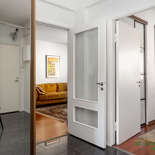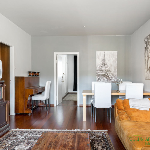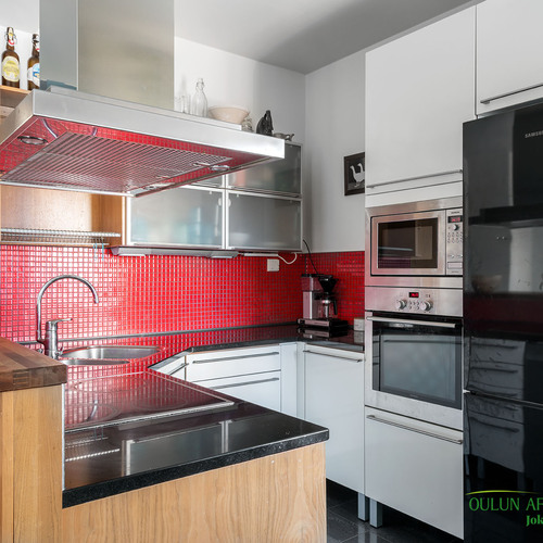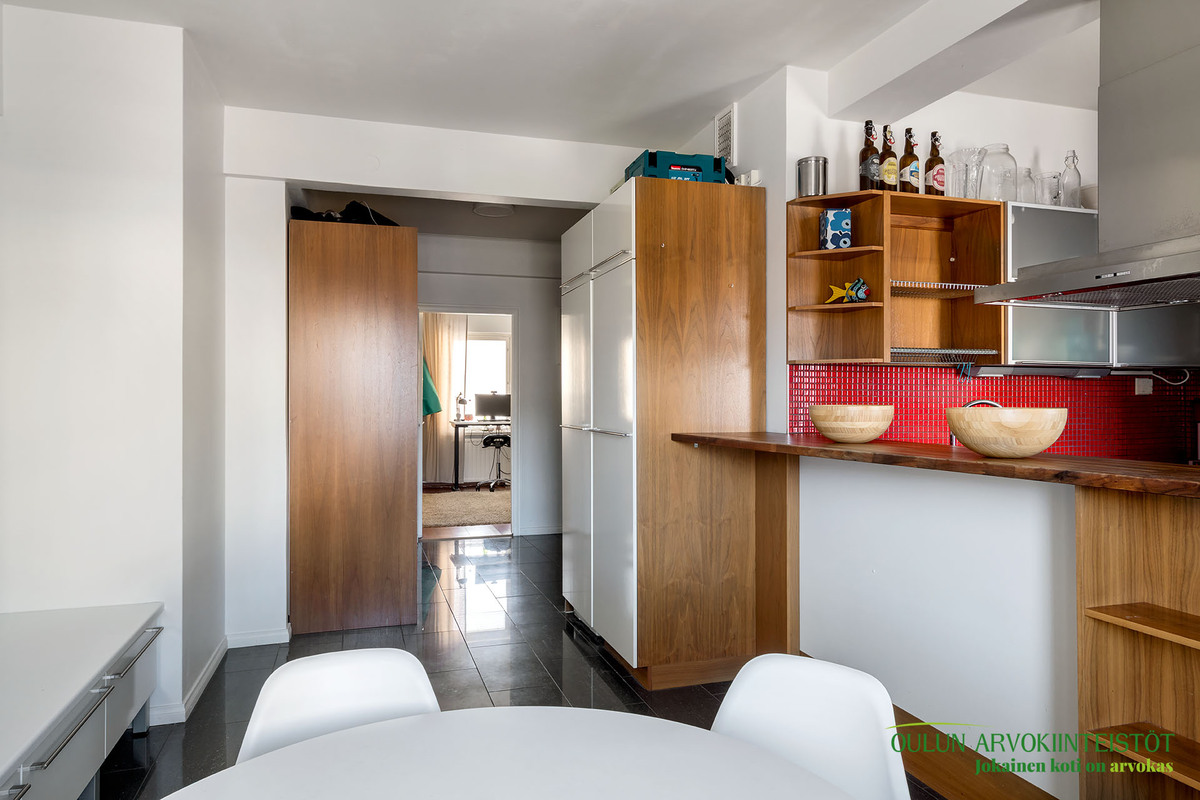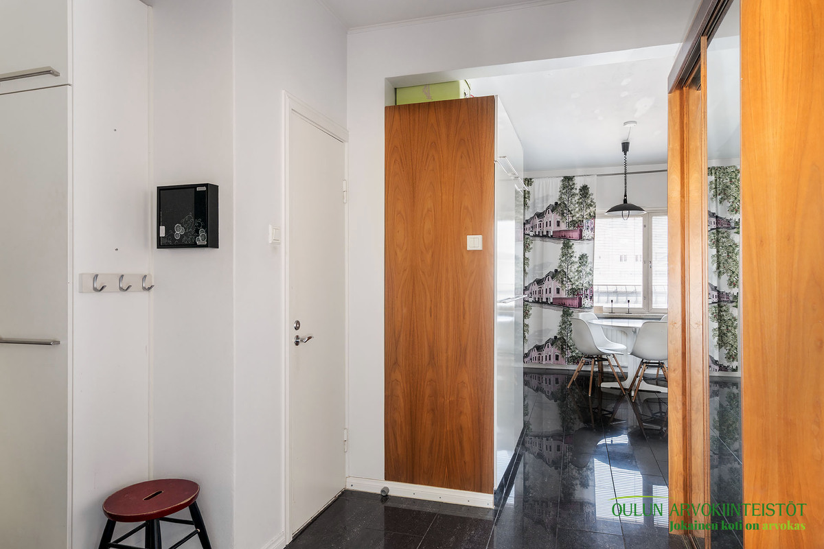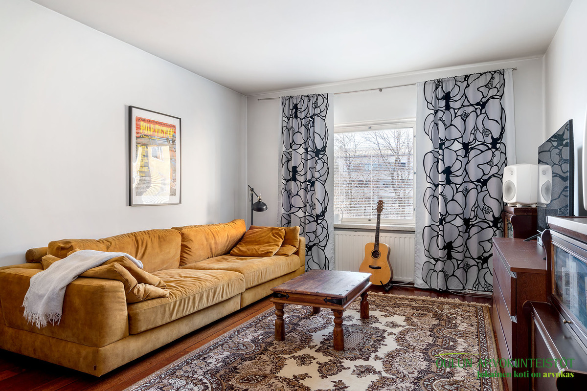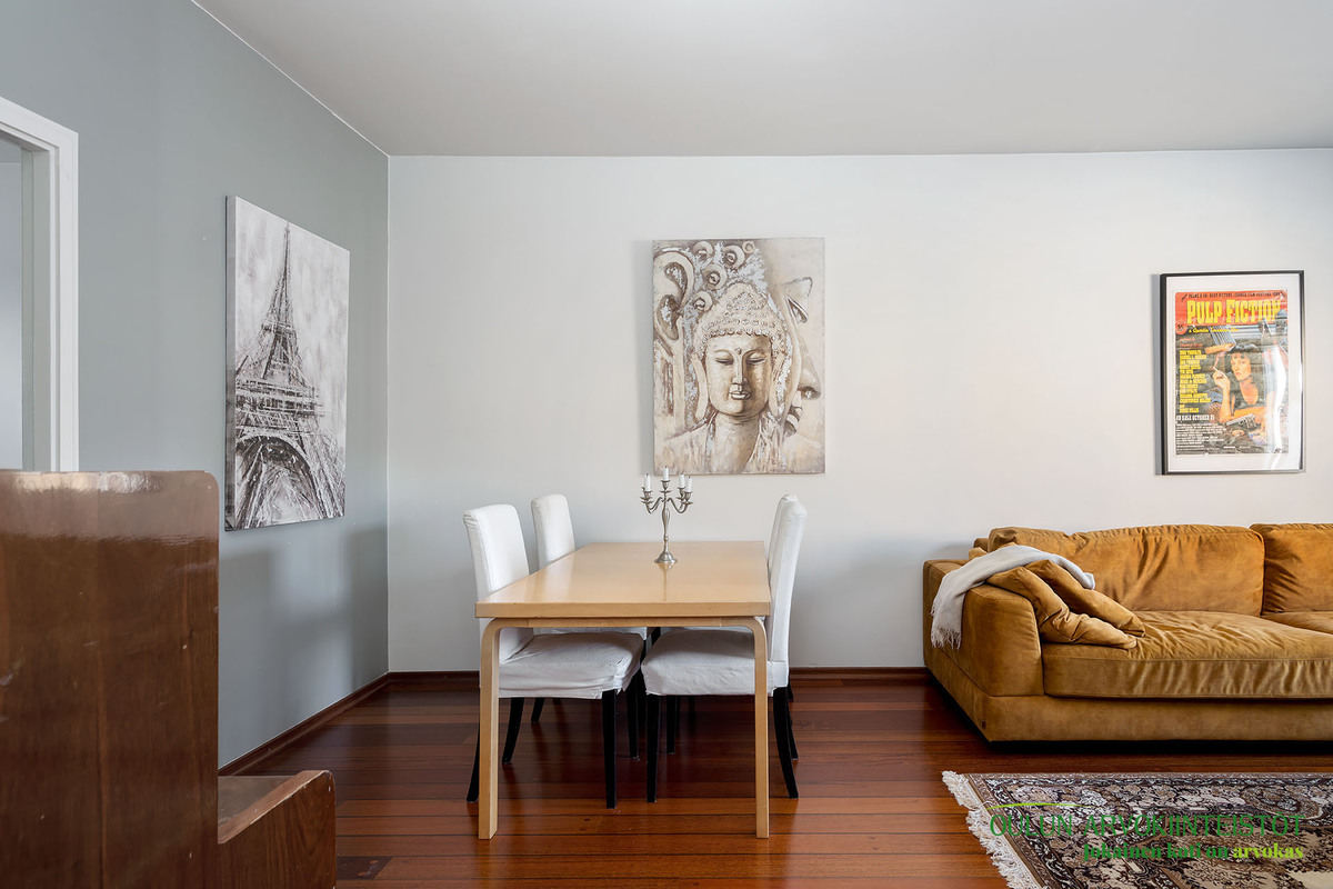 Tämän kodin avaraan eteisaulaan astuttaessa katse kiinnittyy kauniiseen, käytännölliseen sekä kulutusta kestävään laattalattiaan, joka johtaa keittiöön saakka. Luonnonvalo tulvii läpitalon huoneistoon, korostaen kauniisti talon historiaa kunnioittavaa, upeasti käsiteltyä parkettilattiaa. Huoneet huokuvat tilan tuntua ja harmonista rauhaa, sillä neutraalit ja luonnonläheiset sävyt luovat ajattoman tunnelman. Tämä levollinen värimaailma saa rohkean ja piristävän säväyksen keittiön punaisesta välitilalaatasta. Keittiön avaran tilan ansiosta se kutsuu viihtymään. Seurustelu ja kokkailu soljuvat täällä vaivattomasti. Tämä on koti, jossa elämä tuntuu ja maistuu hyvältä.