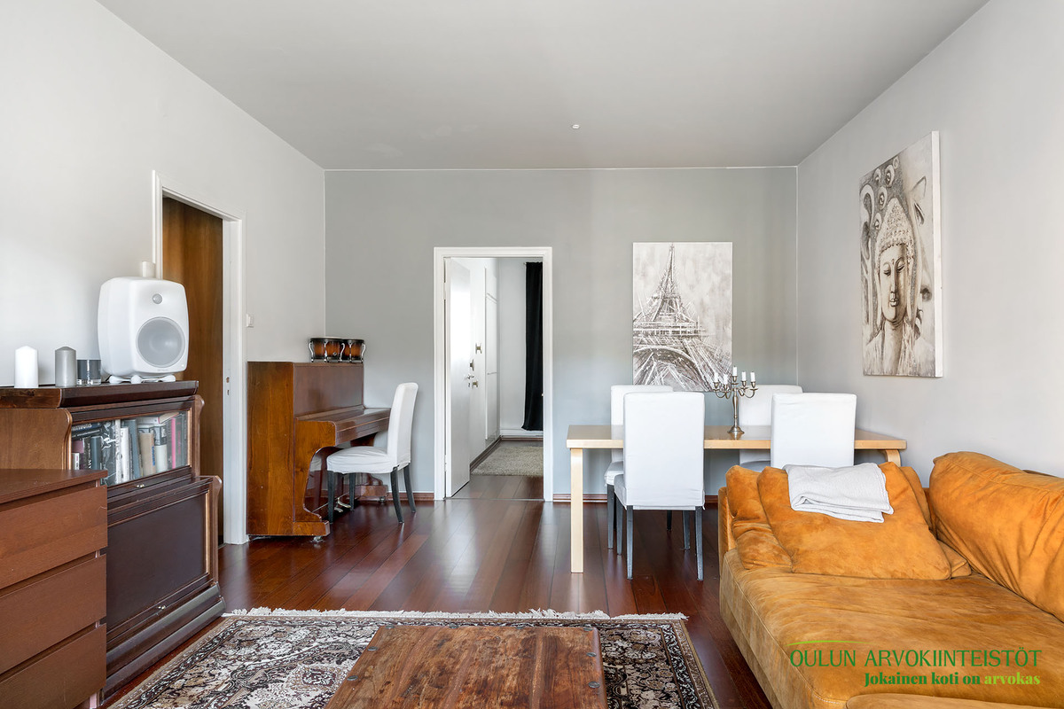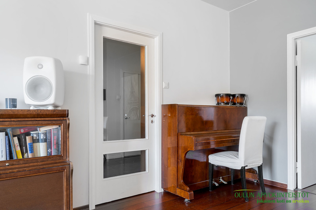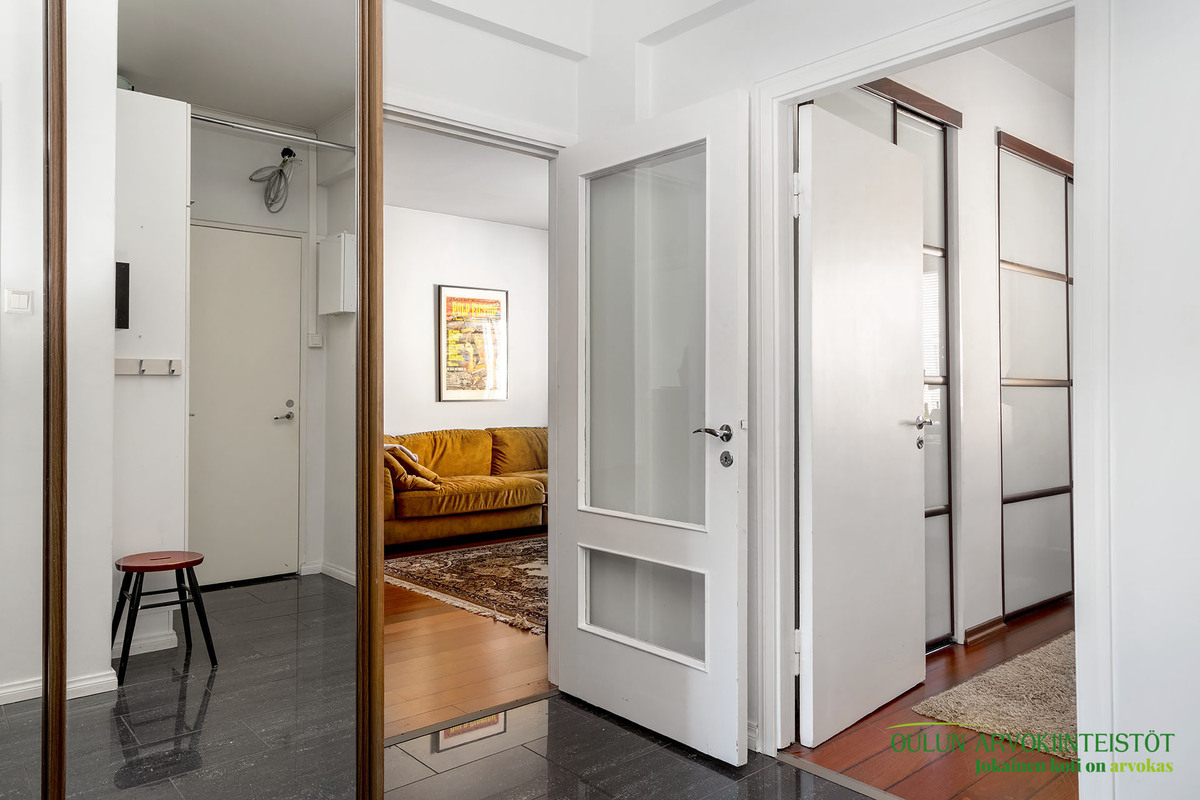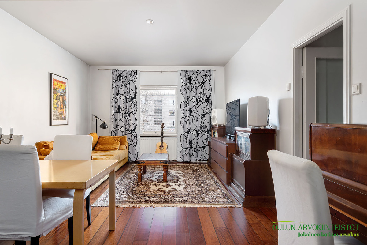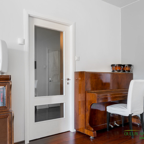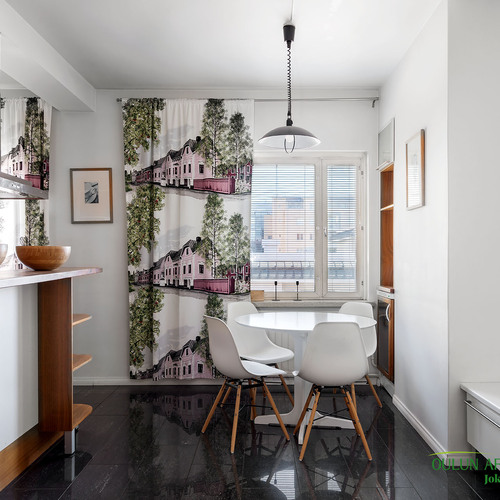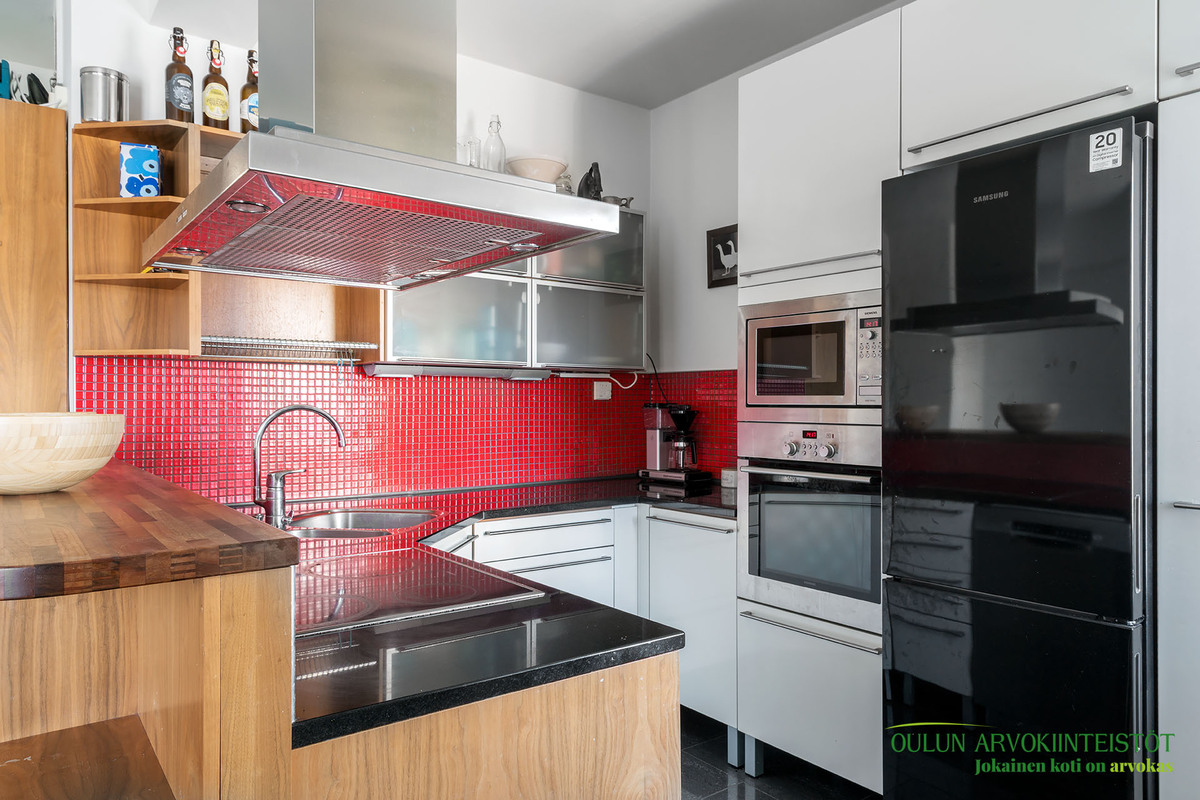 Tämän kodin avaraan eteisaulaan astuttaessa katse kiinnittyy kauniiseen, käytännölliseen sekä kulutusta kestävään laattalattiaan, joka johtaa keittiöön saakka. Luonnonvalo tulvii läpitalon huoneistoon, korostaen kauniisti talon historiaa kunnioittavaa, upeasti käsiteltyä parkettilattiaa. Huoneet huokuvat tilan tuntua ja harmonista rauhaa, sillä neutraalit ja luonnonläheiset sävyt luovat ajattoman tunnelman. Tämä levollinen värimaailma saa rohkean ja piristävän säväyksen keittiön punaisesta välitilalaatasta. Keittiön avaran tilan ansiosta se kutsuu viihtymään. Seurustelu ja kokkailu soljuvat täällä vaivattomasti. Tämä on koti, jossa elämä tuntuu ja maistuu hyvältä.