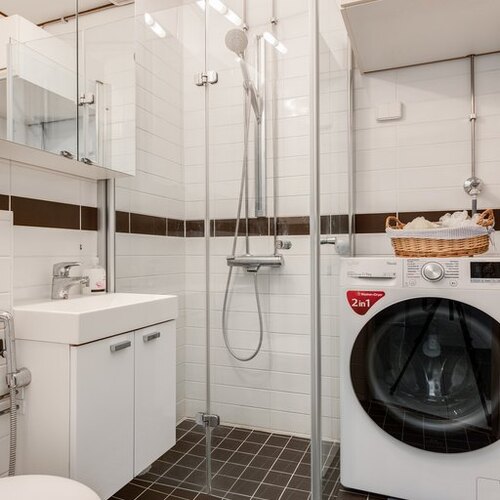 Varusteet: suihkukaappi, pesukoneliitäntä, wc-istuin, suihku, peilikaappi, kylpyhuonekaapisto