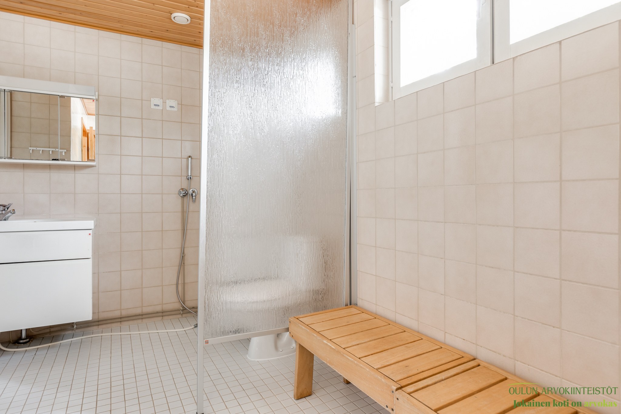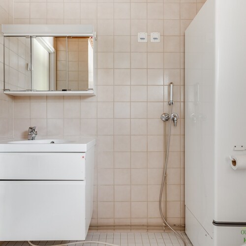 Varusteet: suihkuseinä, pesukoneliitäntä, lattialämmitys, wc-istuin, suihku, peilikaappi, kiinteät valaisimet