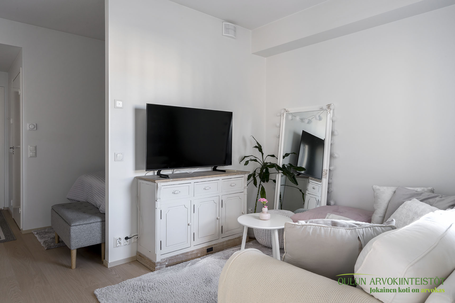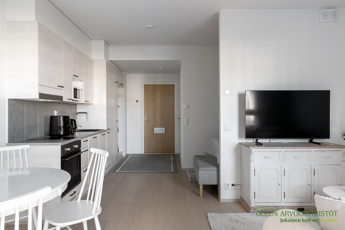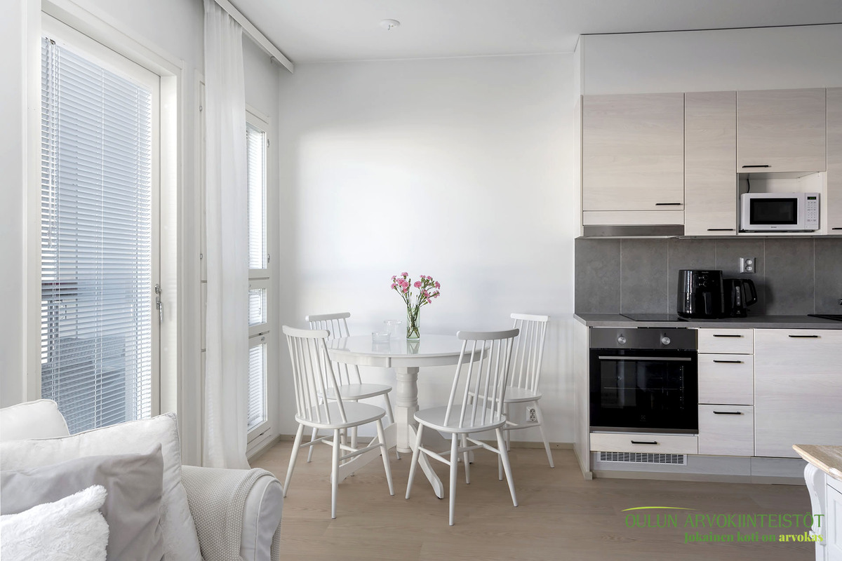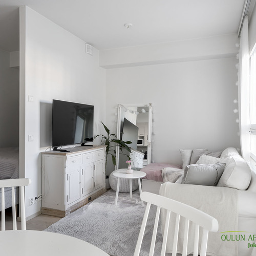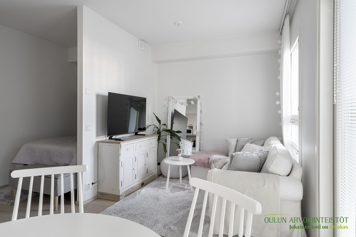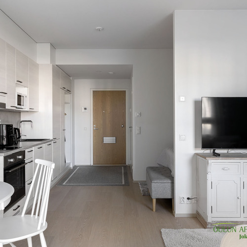 Asunnossa on kivan kokoinen olohuone, joka yhdistyy sulavasti keittiöön. Keittiön vaaleat kaapistot ja integroidut kodinkoneet sekä kestävät tasot tarjoavat käytännöllisyyttä että tyylikkyyttä.