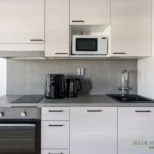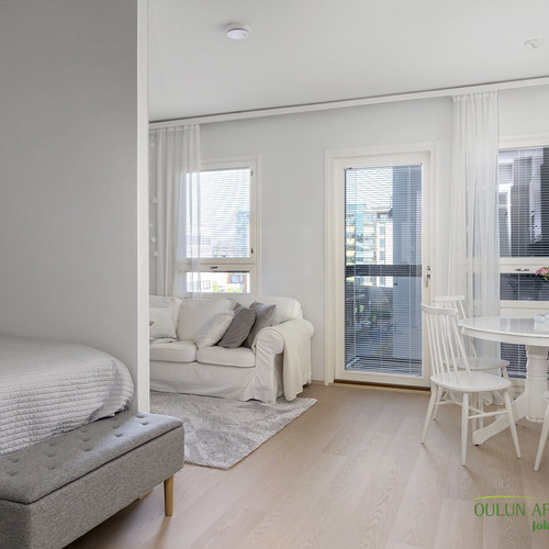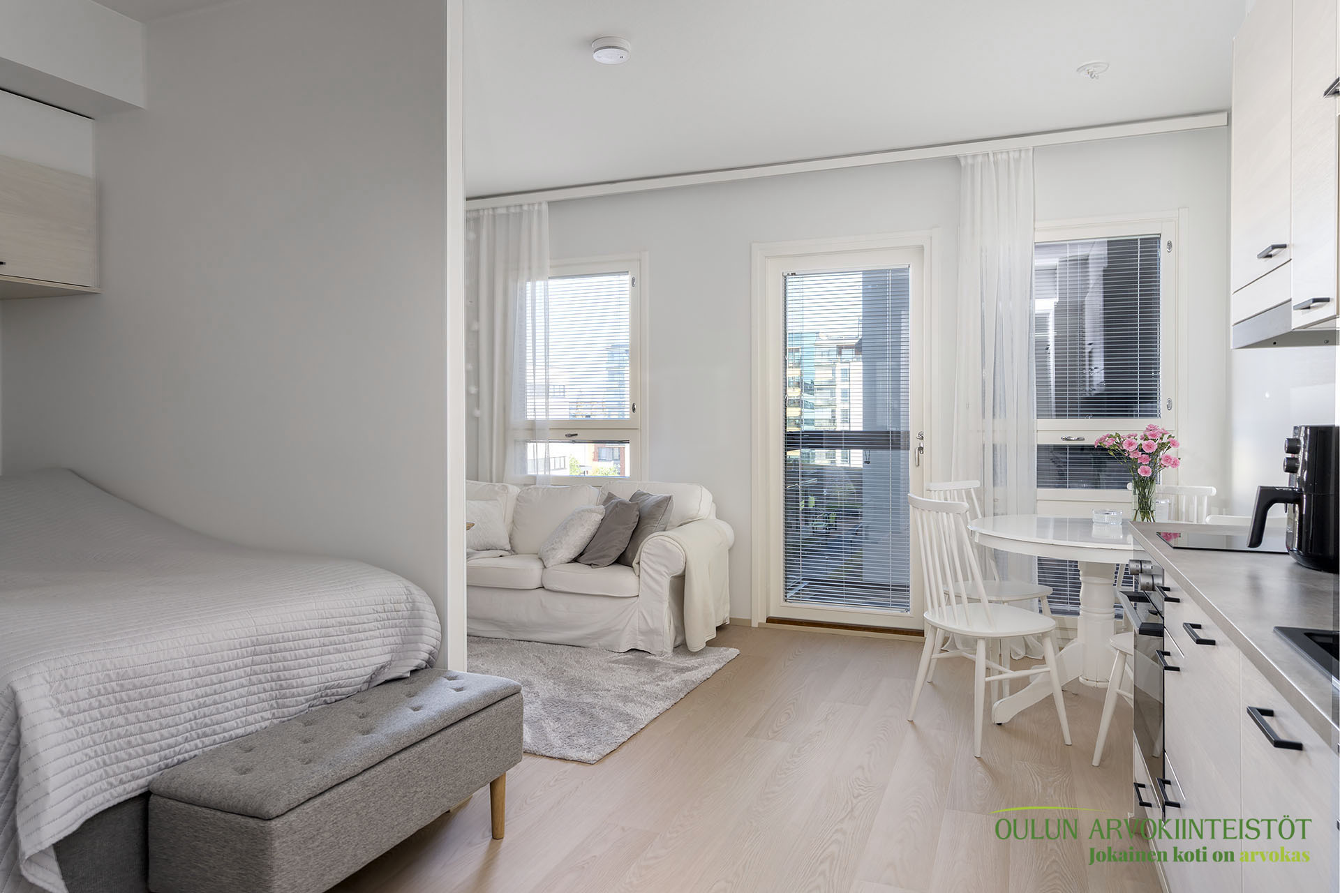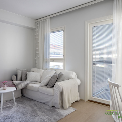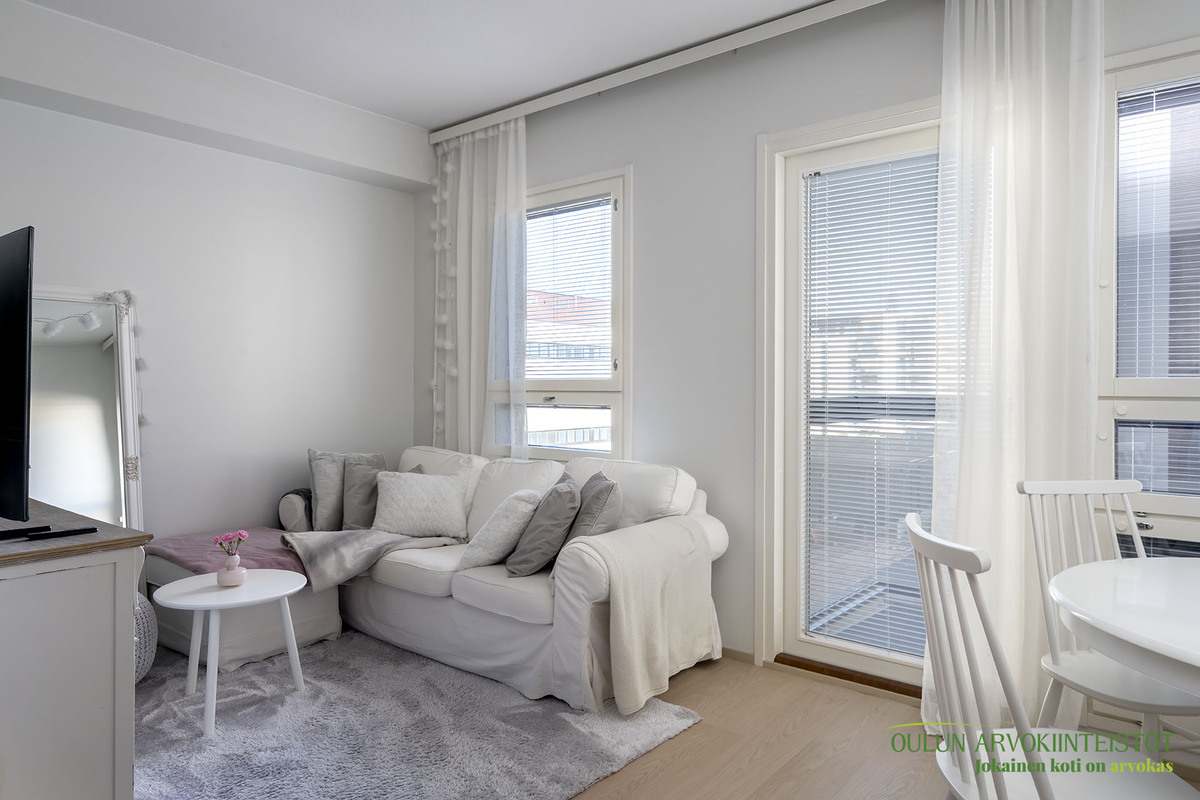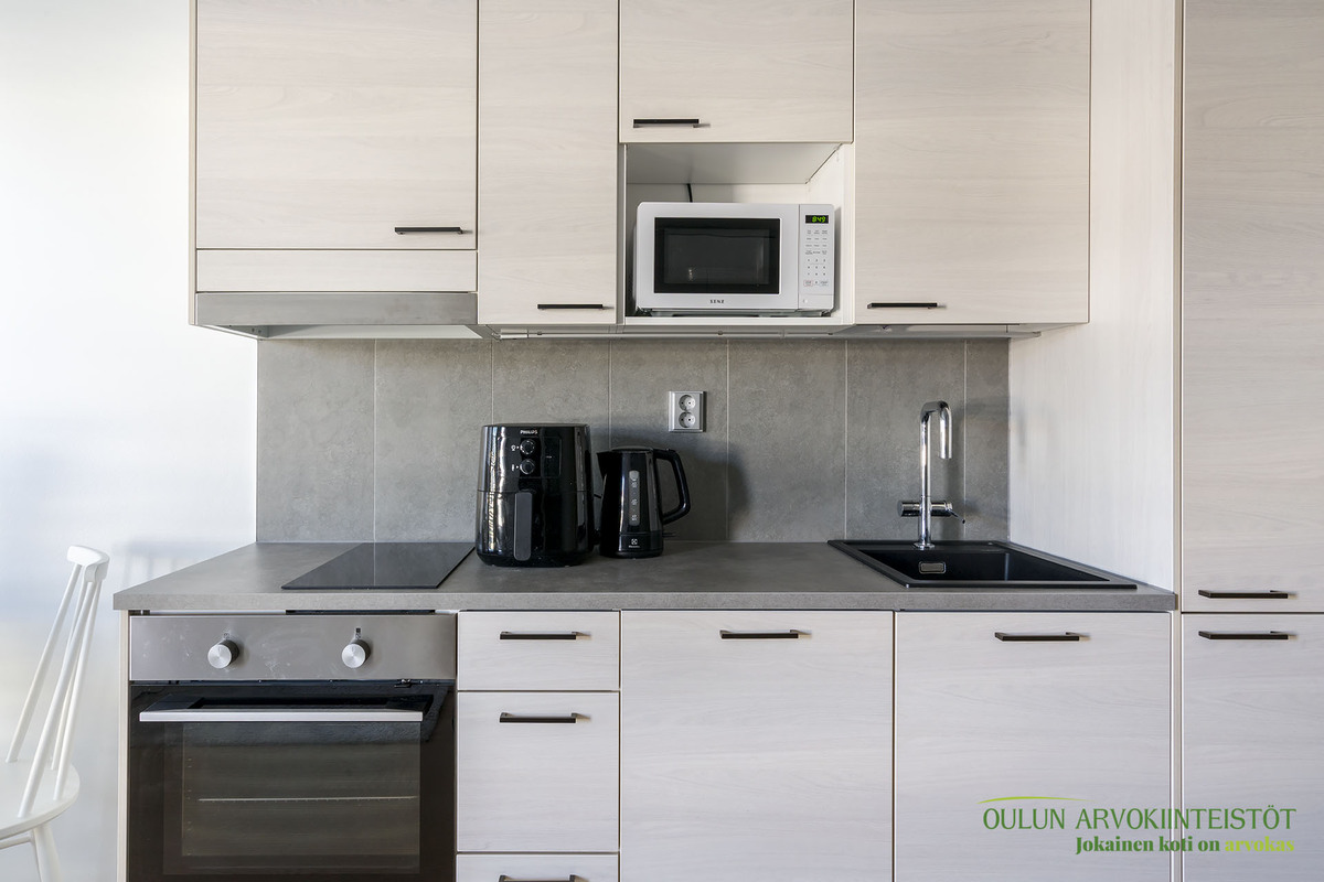 Asunnossa on kivan kokoinen olohuone, joka yhdistyy sulavasti keittiöön. Keittiön vaaleat kaapistot ja integroidut kodinkoneet sekä kestävät tasot tarjoavat käytännöllisyyttä että tyylikkyyttä.