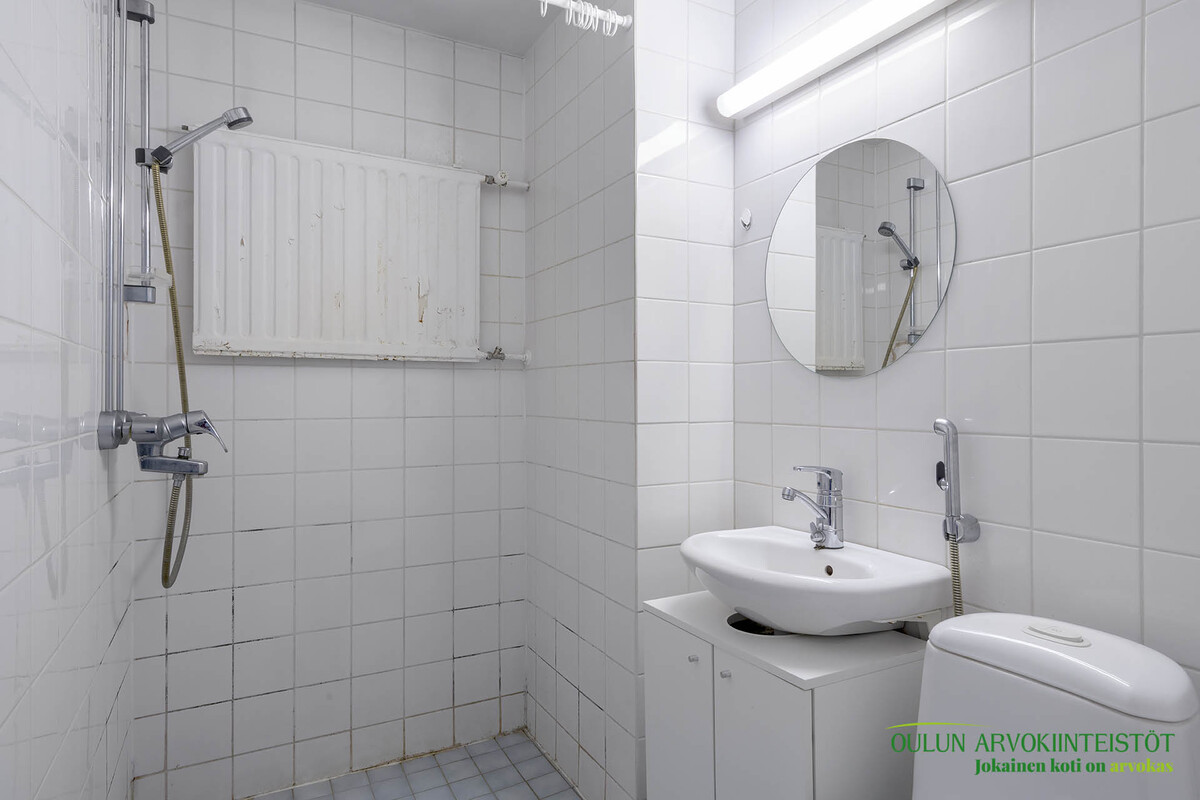 Varusteet: wc-istuin, suihku, peili, kiinteät valaisimet, kylpyhuonekaapisto