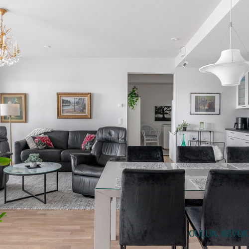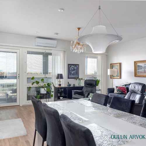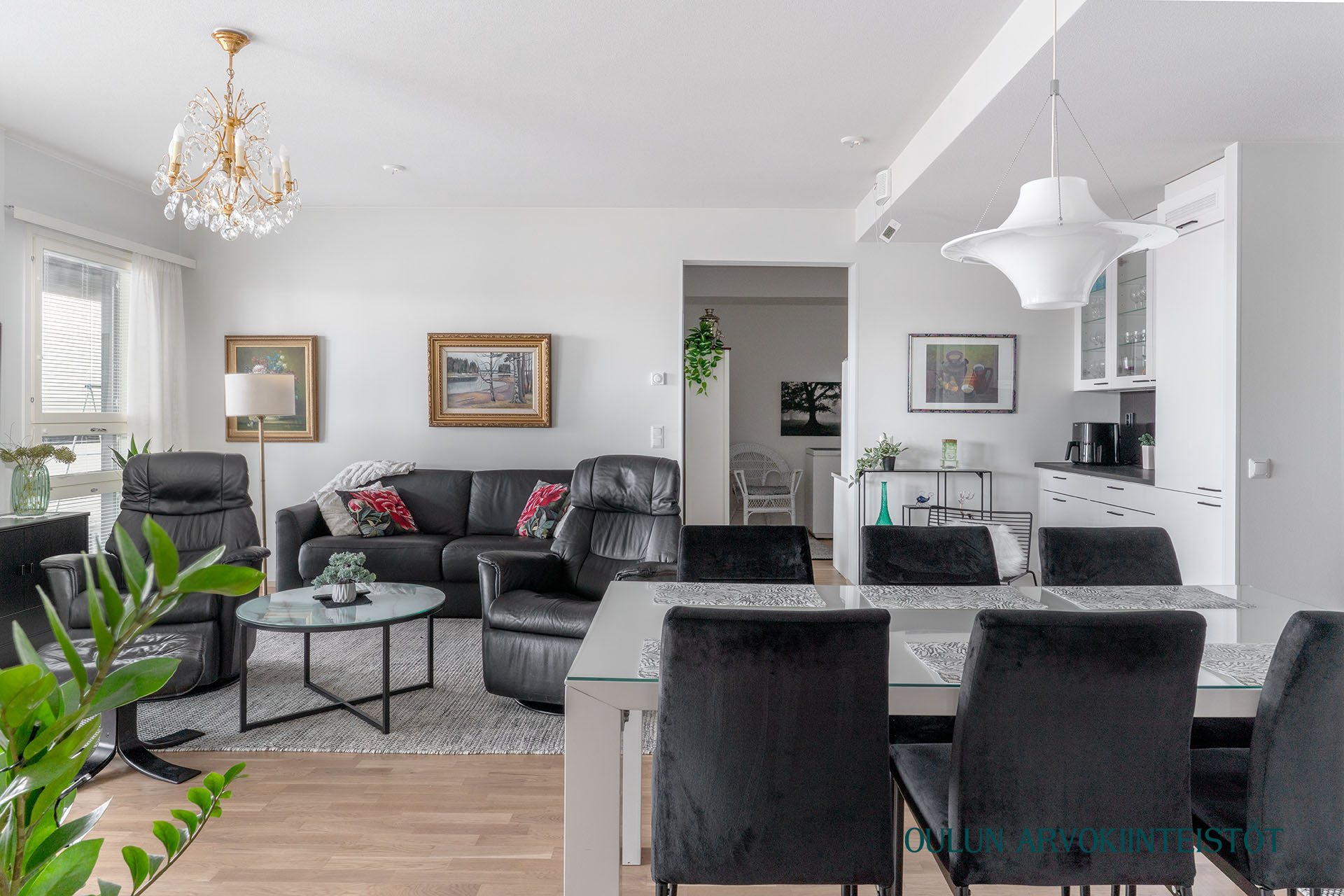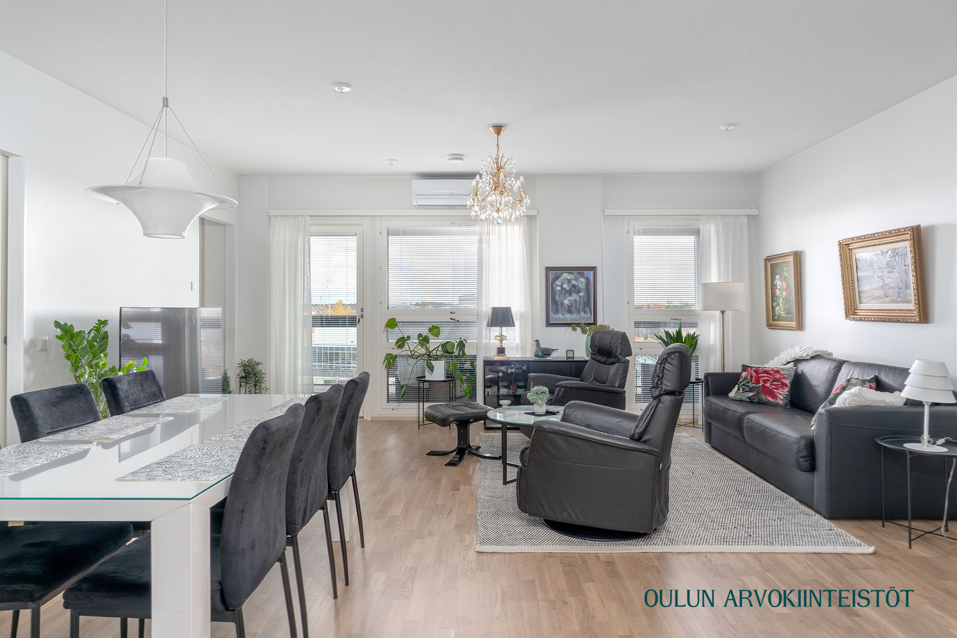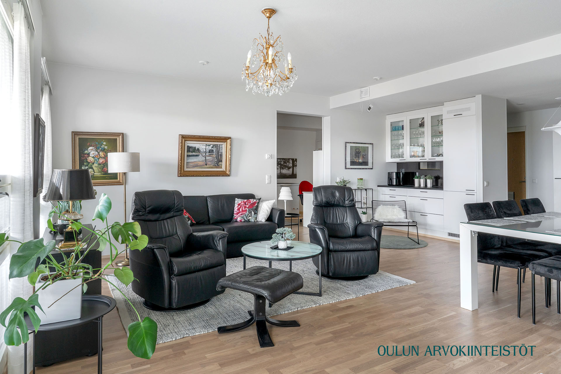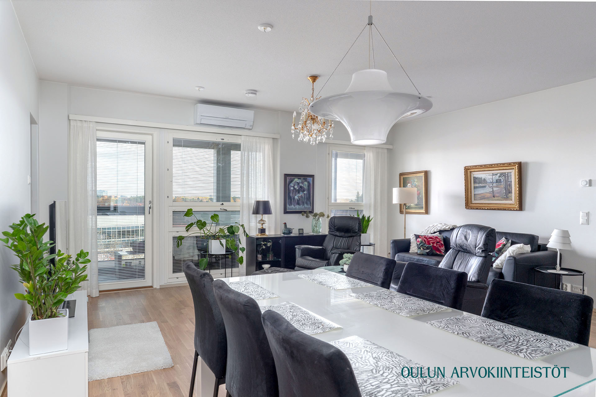 Asunnon 90,50 neliötä muodostuvat kahden huoneiston yhdistelmästä, jonka ansiosta tilaratkaisut ovat tavallista väljemmät ja toimivammat. Seitsemännen kerroksen koti on kauttaaltaan moderni ja tyylikkäästi viimeistelty. Asunto on pidetty erittäin hyvässä kunnossa ja siihen on asennettu 2 ilmalämpöpumppua lisäämään asumismukavuutta. Suuri lasitettu parveke avautuu Madetojan salin suuntaan ja tarjoaa runsaasti tilaa oleskelulle. Parvekkeelle on kulku sekä olohuoneesta että makuuhuoneesta. Keittiö ja olohuone muodostavat yhtenäisen ja viihtyisän kokonaisuuden, ja keittiöstä löytyy kaksi jääkaappipakastinta sekä runsaasti laskutilaa. Asunnossa on lisäksi oma sauna ja kaksi vaatehuonetta. Tontti on lunastettu omaksi.