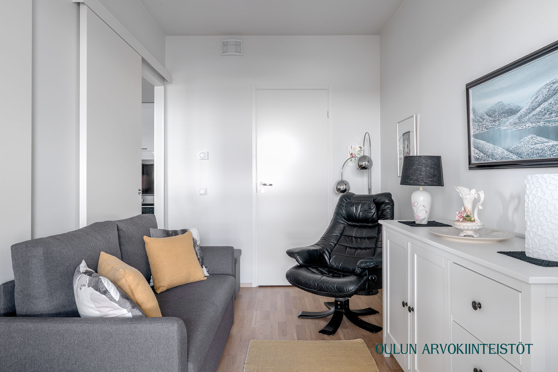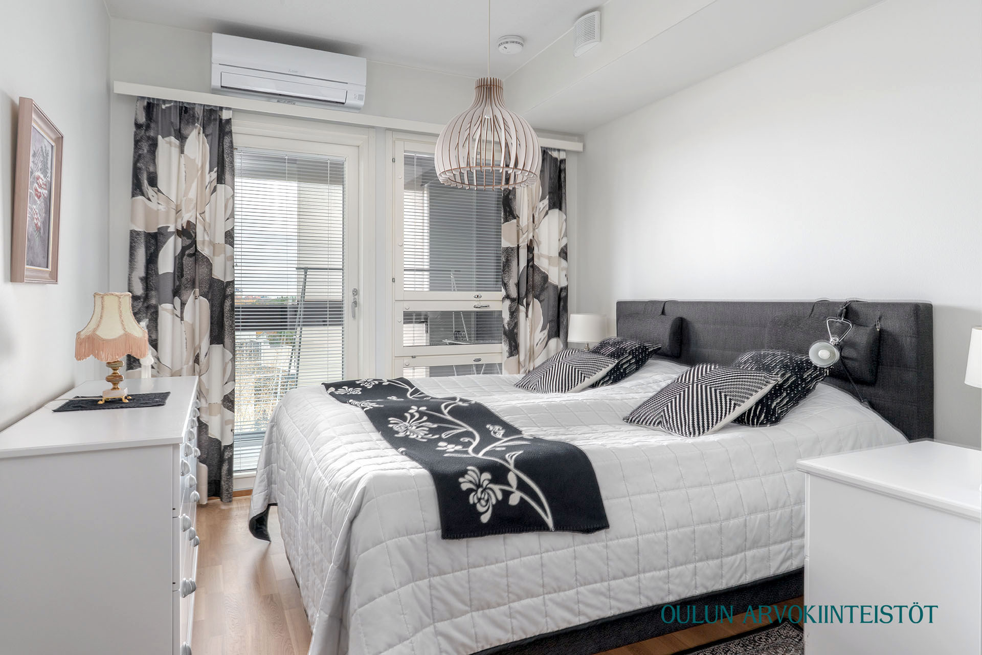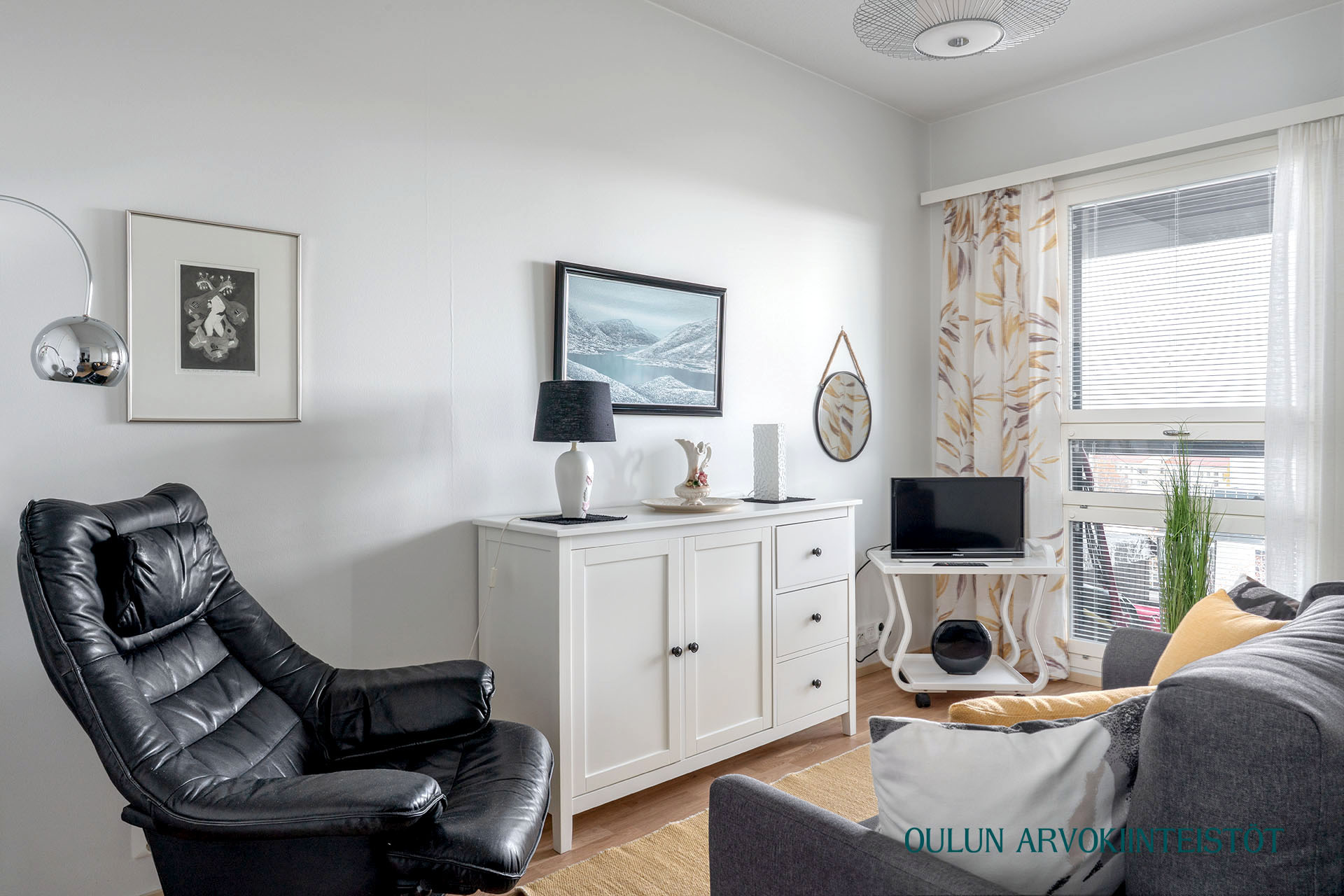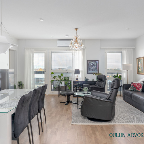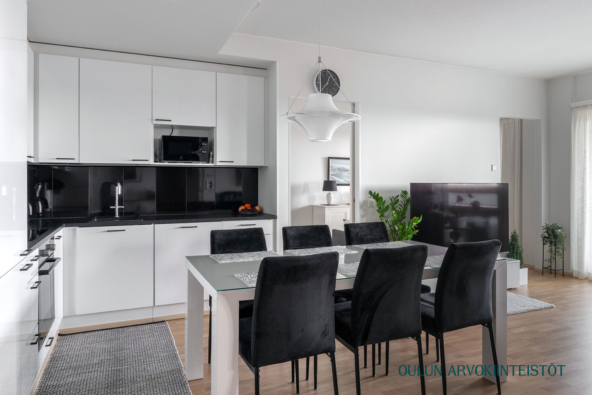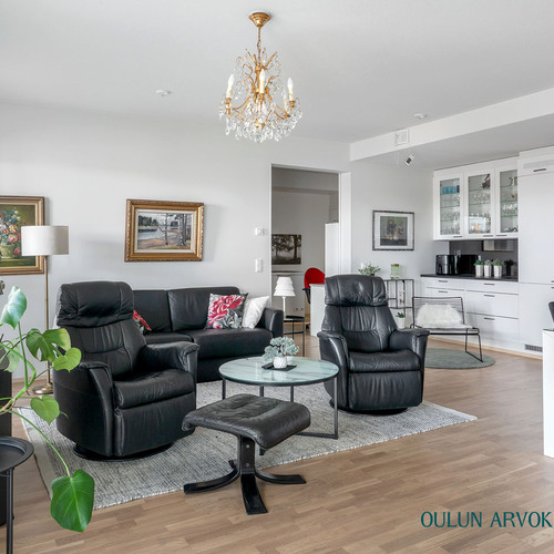 Asunnon 90,50 neliötä muodostuvat kahden huoneiston yhdistelmästä, jonka ansiosta tilaratkaisut ovat tavallista väljemmät ja toimivammat. Seitsemännen kerroksen koti on kauttaaltaan moderni ja tyylikkäästi viimeistelty. Asunto on pidetty erittäin hyvässä kunnossa ja siihen on asennettu 2 ilmalämpöpumppua lisäämään asumismukavuutta. Suuri lasitettu parveke avautuu Madetojan salin suuntaan ja tarjoaa runsaasti tilaa oleskelulle. Parvekkeelle on kulku sekä olohuoneesta että makuuhuoneesta. Keittiö ja olohuone muodostavat yhtenäisen ja viihtyisän kokonaisuuden, ja keittiöstä löytyy kaksi jääkaappipakastinta sekä runsaasti laskutilaa. Asunnossa on lisäksi oma sauna ja kaksi vaatehuonetta. Tontti on lunastettu omaksi.