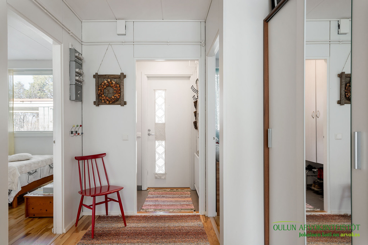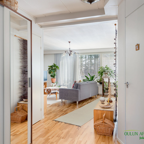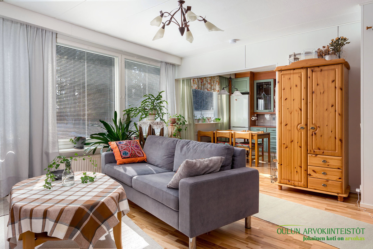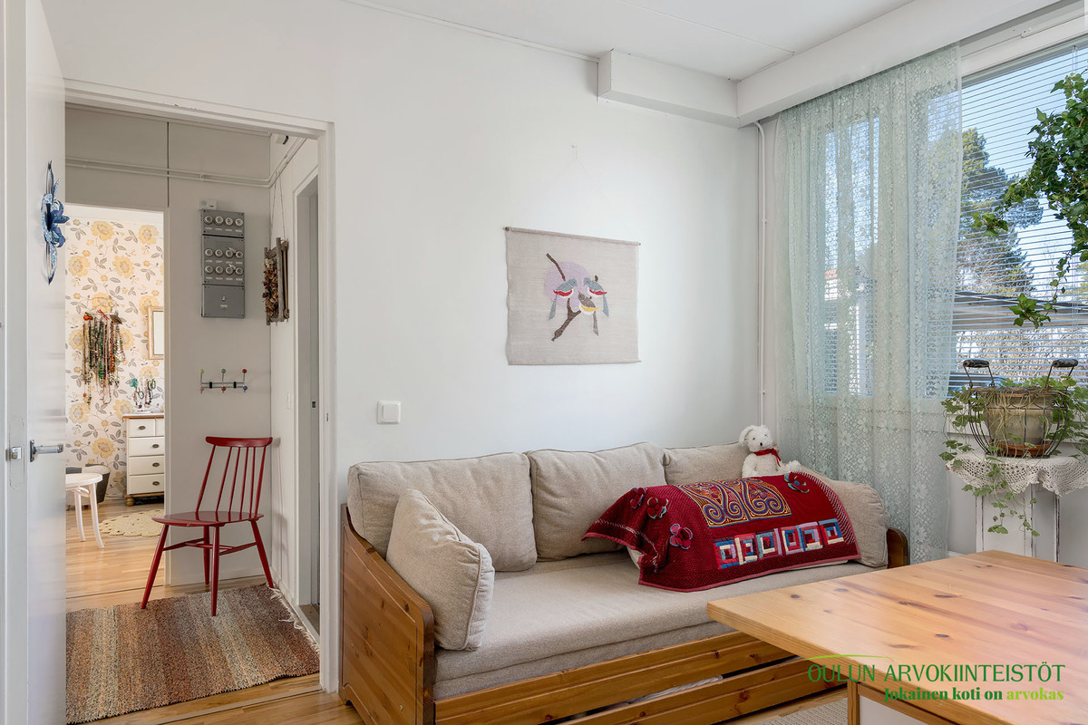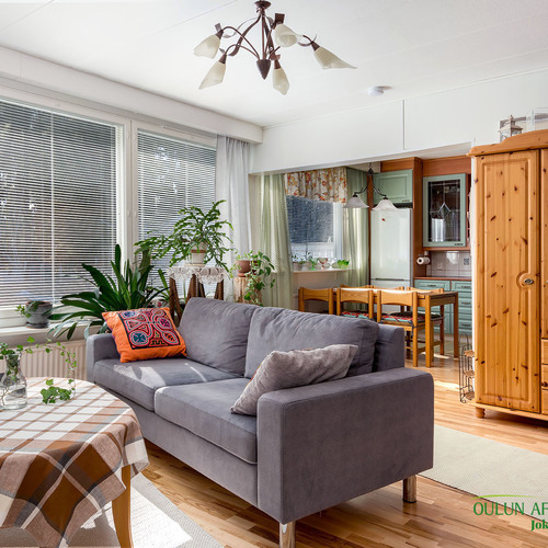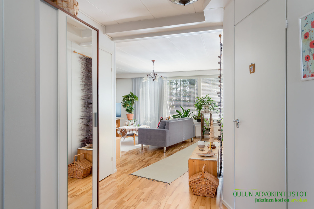 Yksi asunnon parhaista puolista on sen sijainti. Takapiha rajoittuu rauhalliseen puistoon ja lasten leikkipuisto löytyy aivan vierestä. Luonto on täällä koko ajan läsnä – Kiiminkijoki virtaa vain kivenheiton päässä, tarjoten mahdollisuuden lenkkeilyyn, kalastukseen tai kesäisiin eväsretkiin. Kiimingin monipuoliset palvelut – kaupat, koulut, päiväkodit ja kirjasto – ovat kaikki kävelymatkan päässä.
