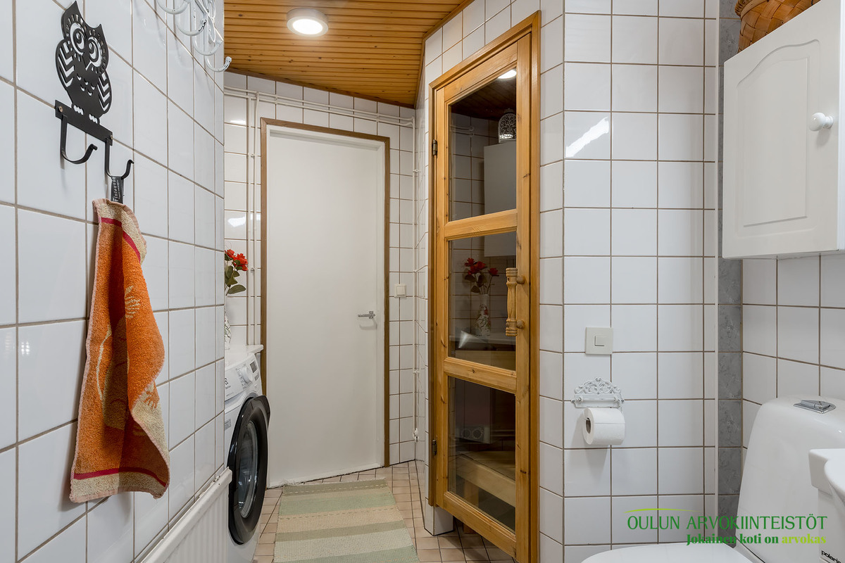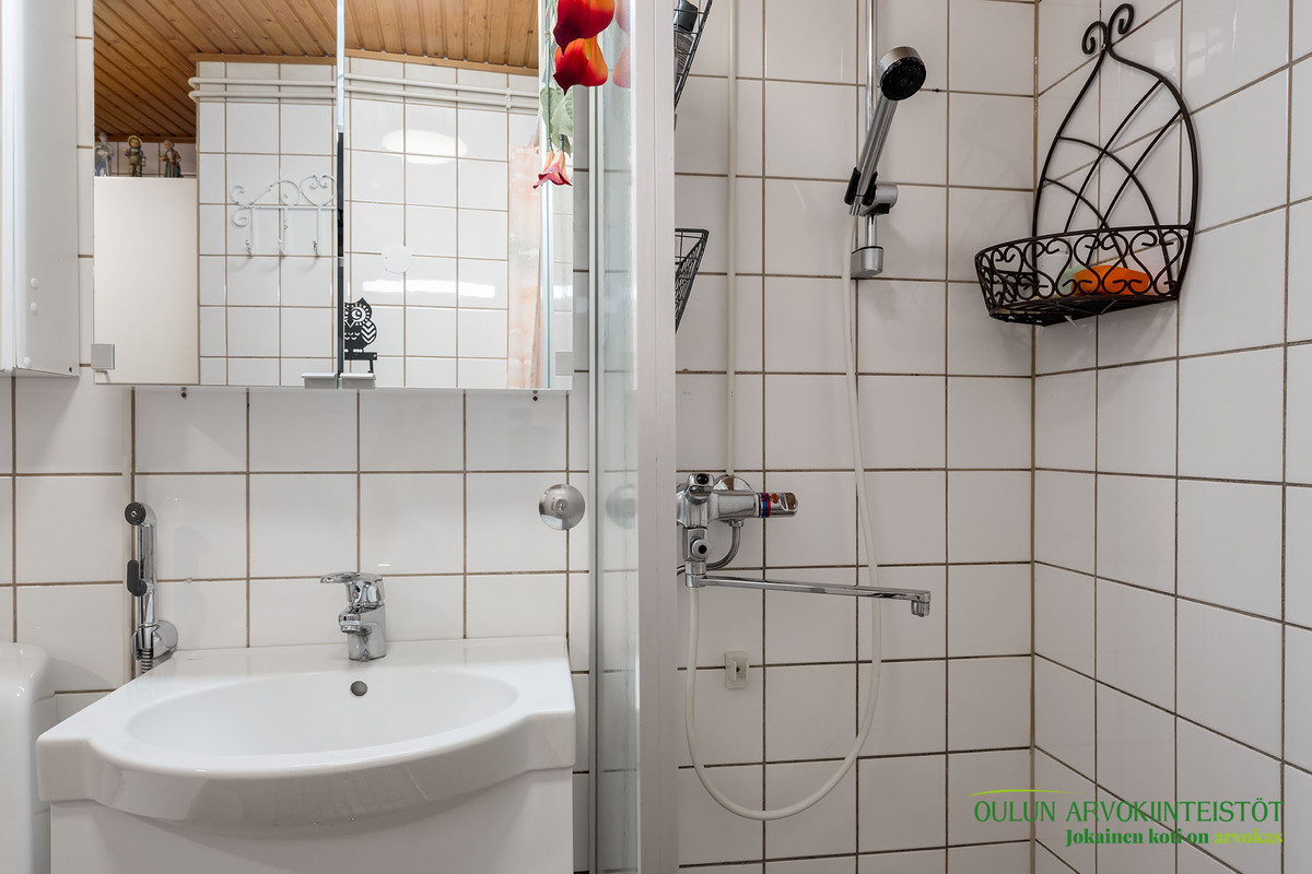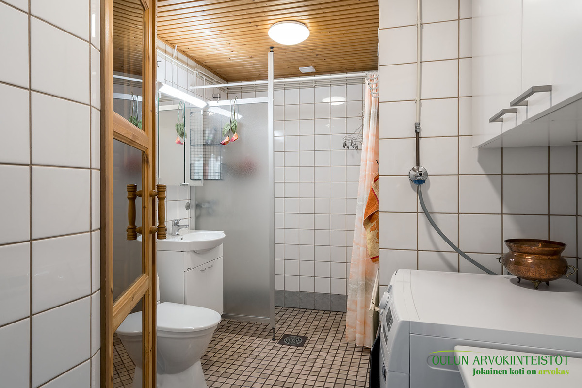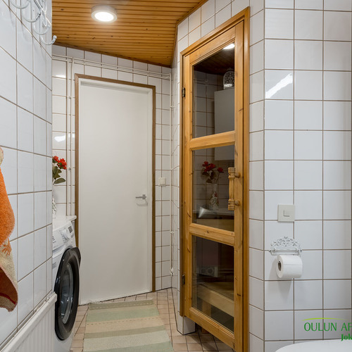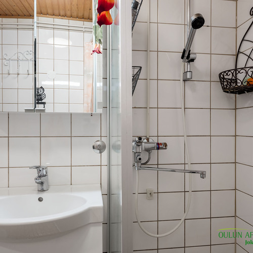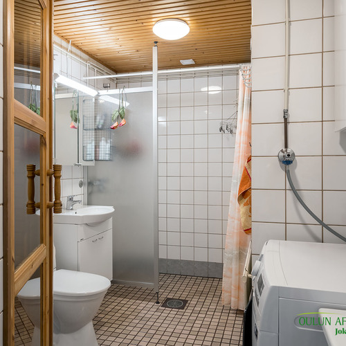 Varusteet: suihkuseinä, pesukoneliitäntä, wc-istuin, suihku, peilikaappi, kiinteät valaisimet