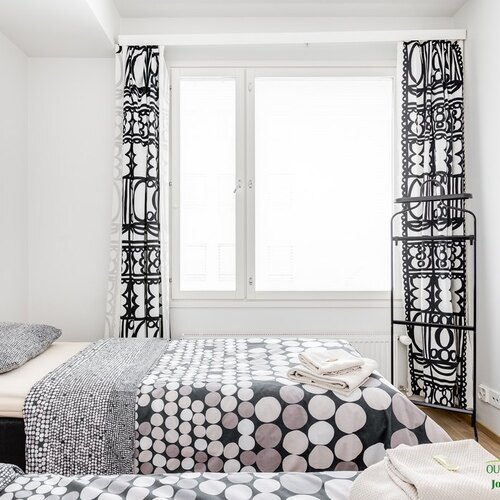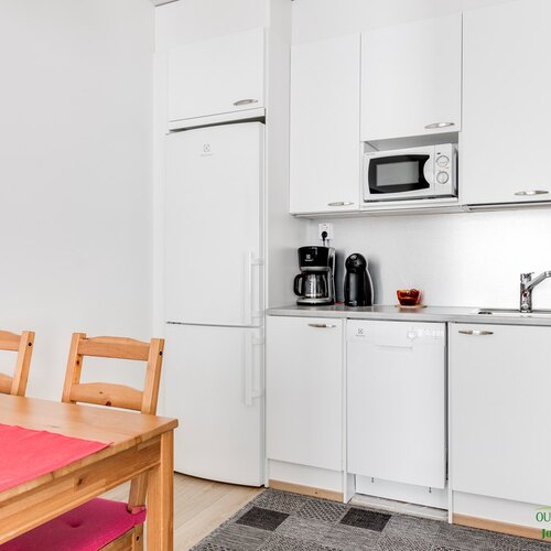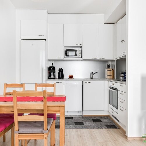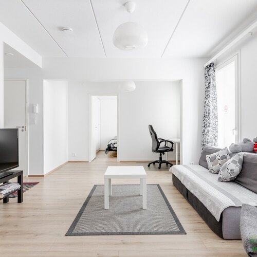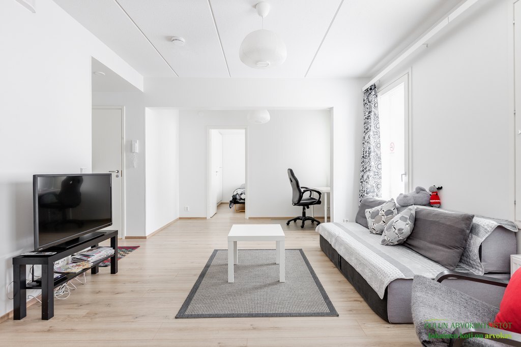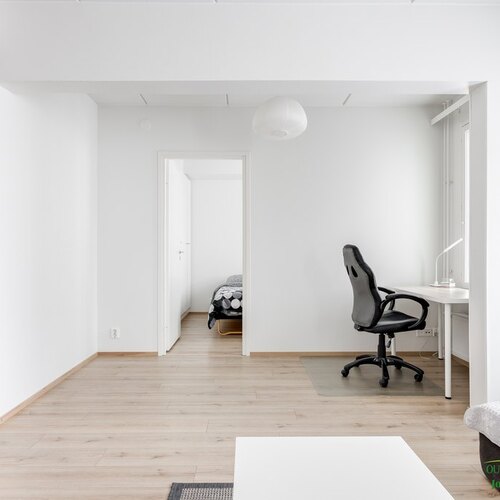 Asunnon keittiö on varustettu laadukkailla kodinkoneilla ja tyylikkäillä pintaratkaisuilla, mikä tekee arjesta sekä juhlasta sujuvaa. Oleskelutilat ovat avarat ja valoisat, suurien ikkunoiden ansiosta, jotka tuovat tilaan runsaasti luonnonvaloa ja luovat viihtyisän tunnelman. Olohuoneen ja makuhuoneen välissä on oivallinen paikka vaikkapa työpöydälle.