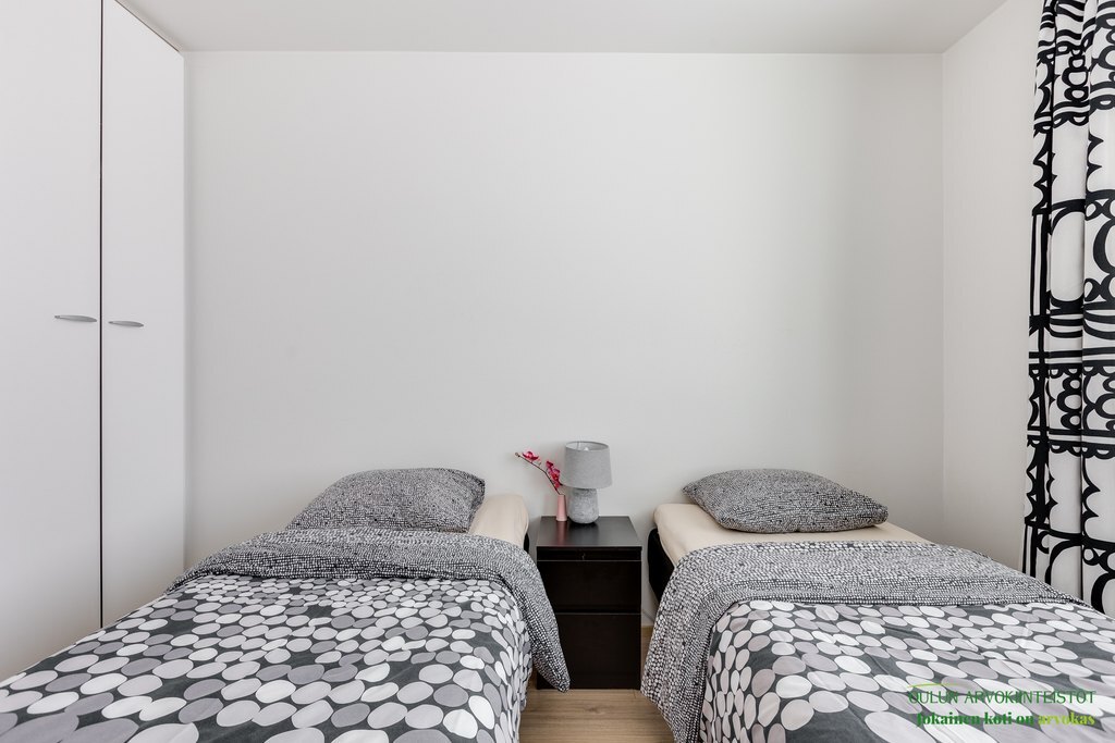 Makuuhuone on rauhallinen, tarjoten hyvät säilytystilat. Kylpyhuoneessa yhdistyvät toiminnallisuus ja moderni design, ja oma sauna tarjoaa rentouttavia hetkiä kiireisen päivän päätteeksi.