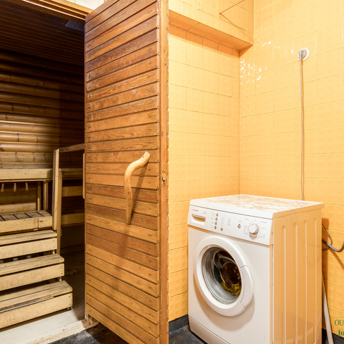 Lisäsiivessä takkahuone, sauna ja toinen kylpyhuone, jonne käynti ulkokautta. Tämä toimii samalla kodinhoitohuoneena.