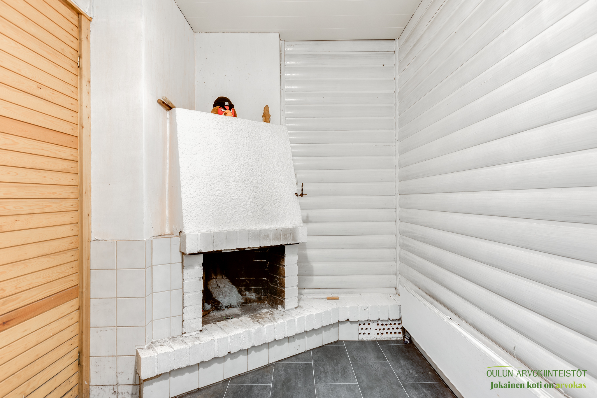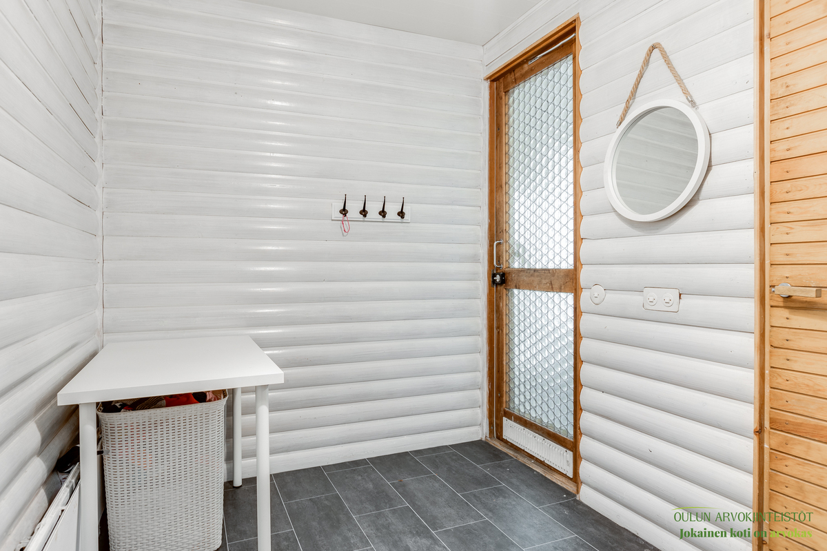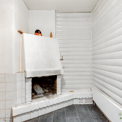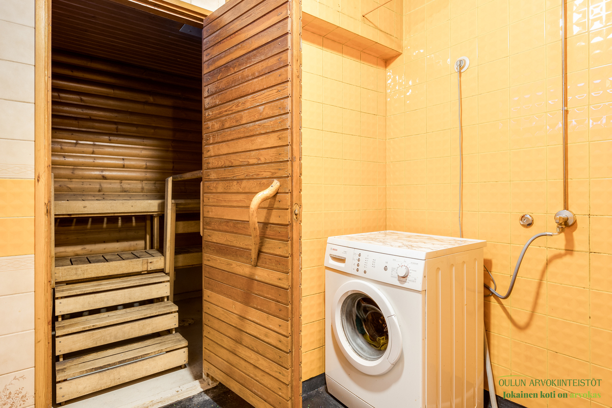 Ulkopuolelta pääset kodin takkahuoneeseen, joka tarjoaa lämpimän ja viihtyisän paikan rentoutua ja nauttia takan lämmöstä. Täältä käynti saunatiloihin ja kylpyhuoneeseen, jotka ovat pidetty alkuperäisessä kunnossa tuoden mukanaan aitoa retrohenkeä. Kylpyhuoneen lattia on kuitenkin päivitetty akryylibetonilla, joka on kätevä ja kestävä materiaali. Puulämmitteinen kiuas antaa pehmeät ja mukavat löylyt, mutta kiireisimmille on myös nopealämmitteinen sähkökiuas. Molemmat kiukaat uusittu 2022. Kodin pyykkihuollolle on myös hyvät tilat kylpyhuoneen ja takkahuoneen yhteydessä.