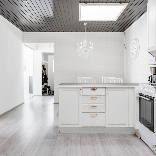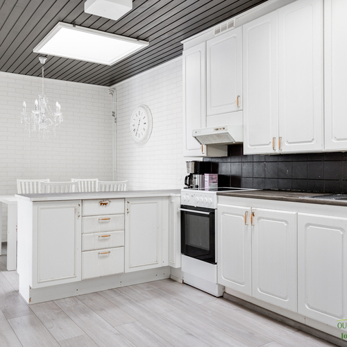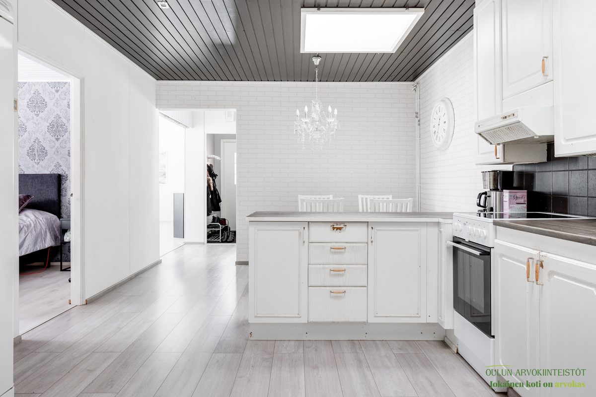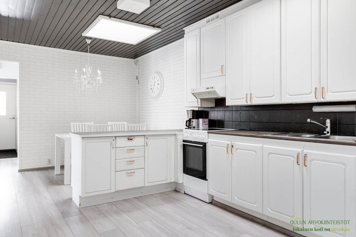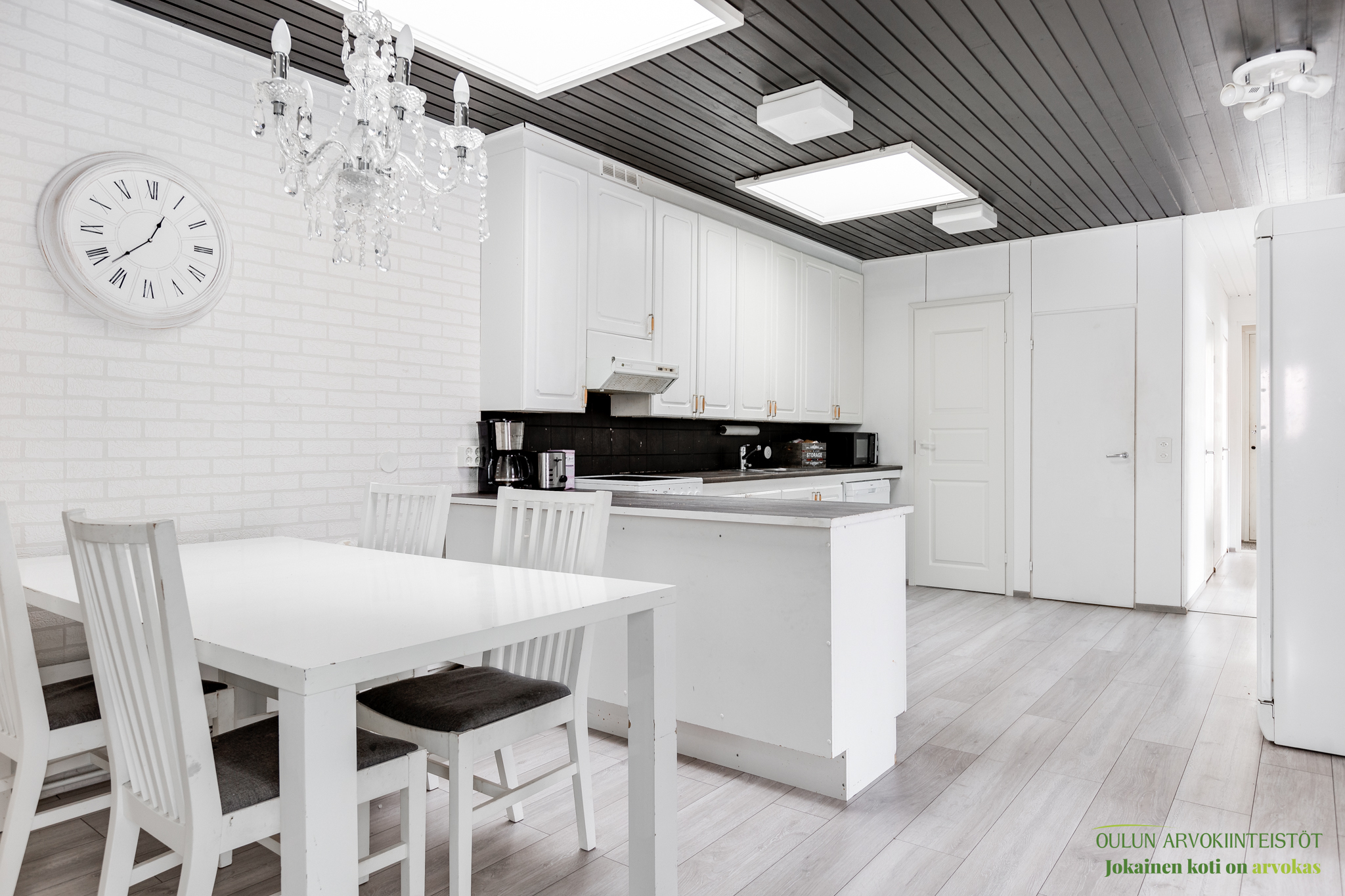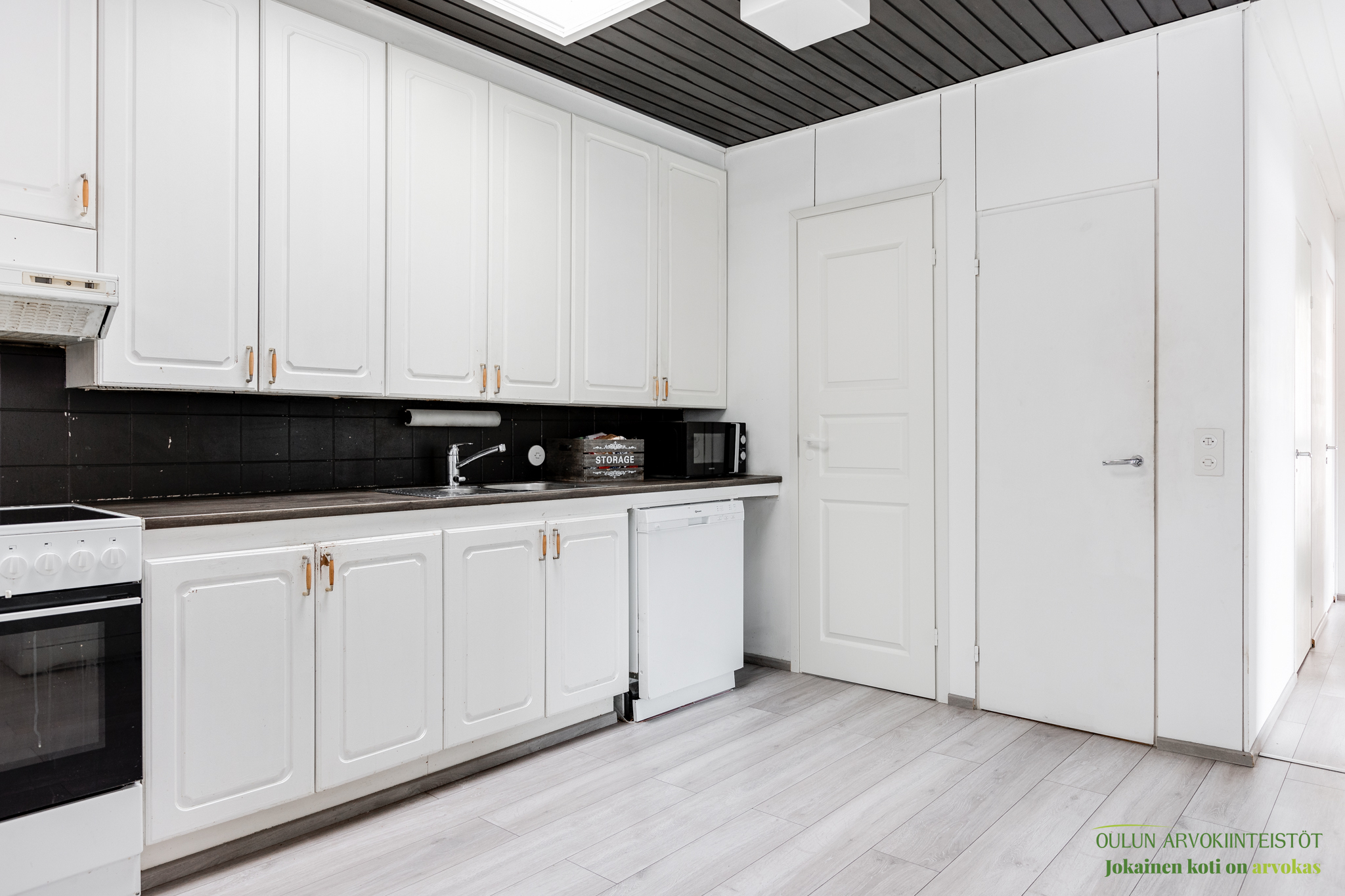Keittiössä kohtaat mielenkiintoisen yhdistelmän vanhaa ja uutta. Keittiön kylmiön vanha metalliovi on poistettu, jonka ansioista keittiössä on enemmän säilytystilaa. Tämä mahdollistaa kätevän järjestelyn ja helpottaa arjen sujumista. Keittiössä on muutoinkin hyvin kaappitilaa ja sopivasti pöytätilaa, mikä tekee kokkailusta tai leipomisesta vaivatonta ja nautinnollista.