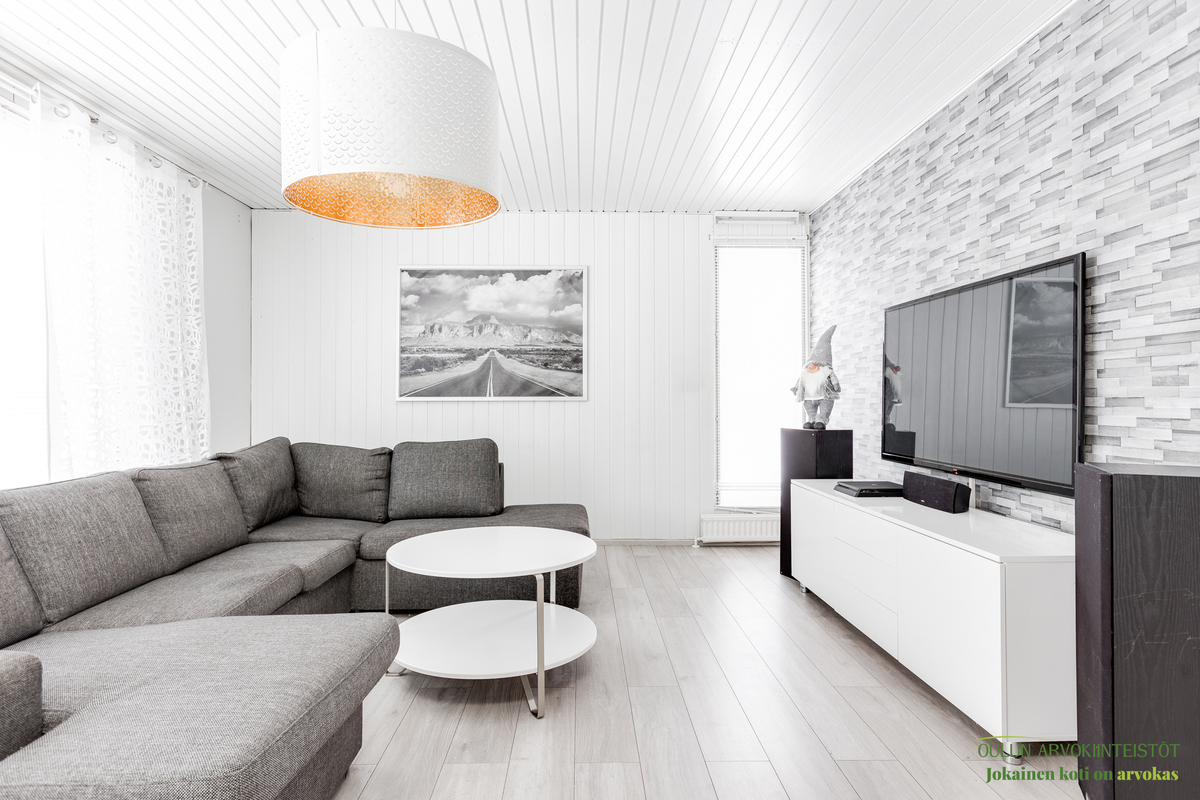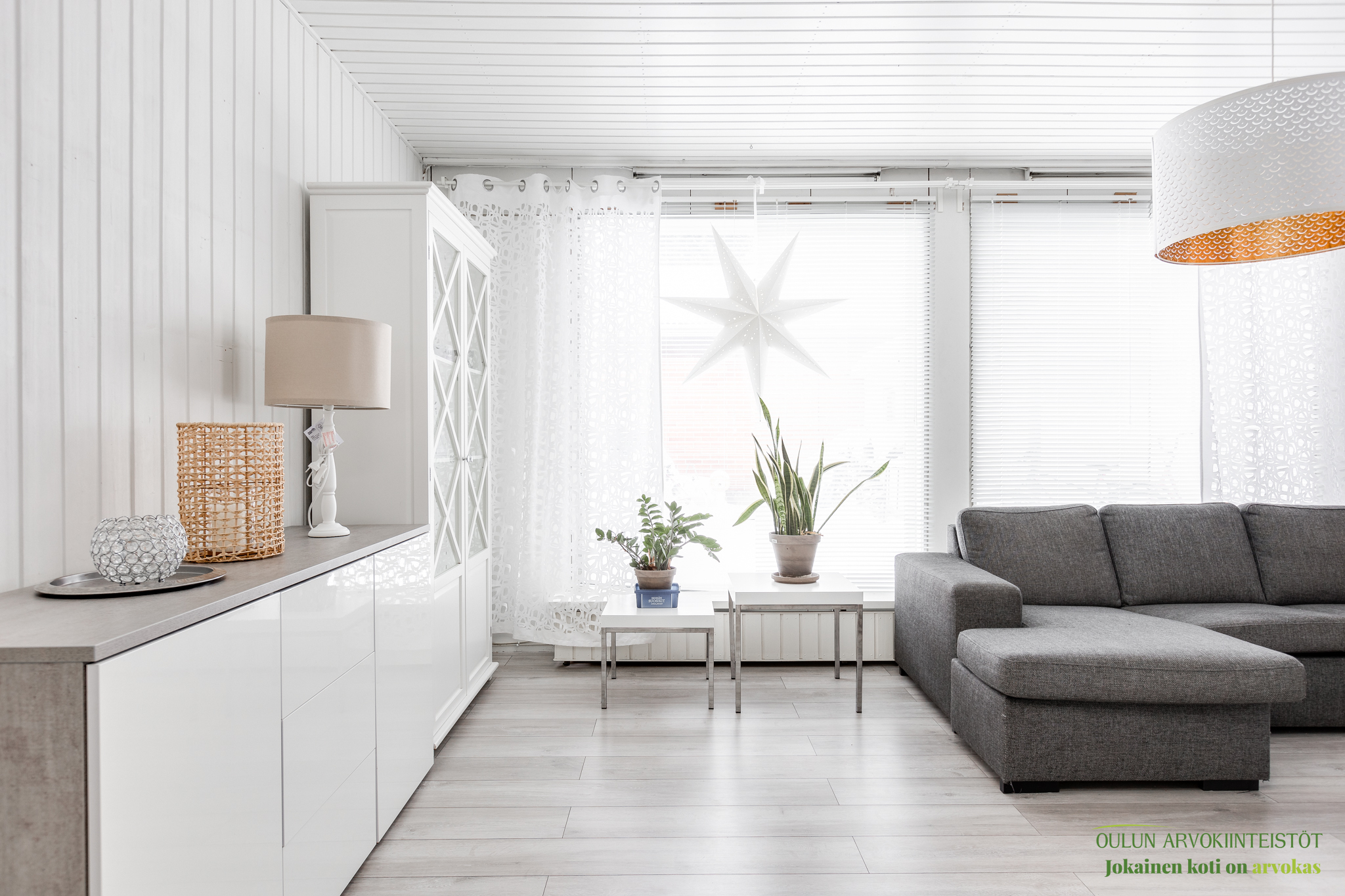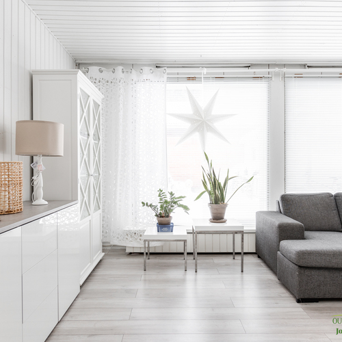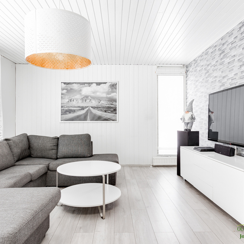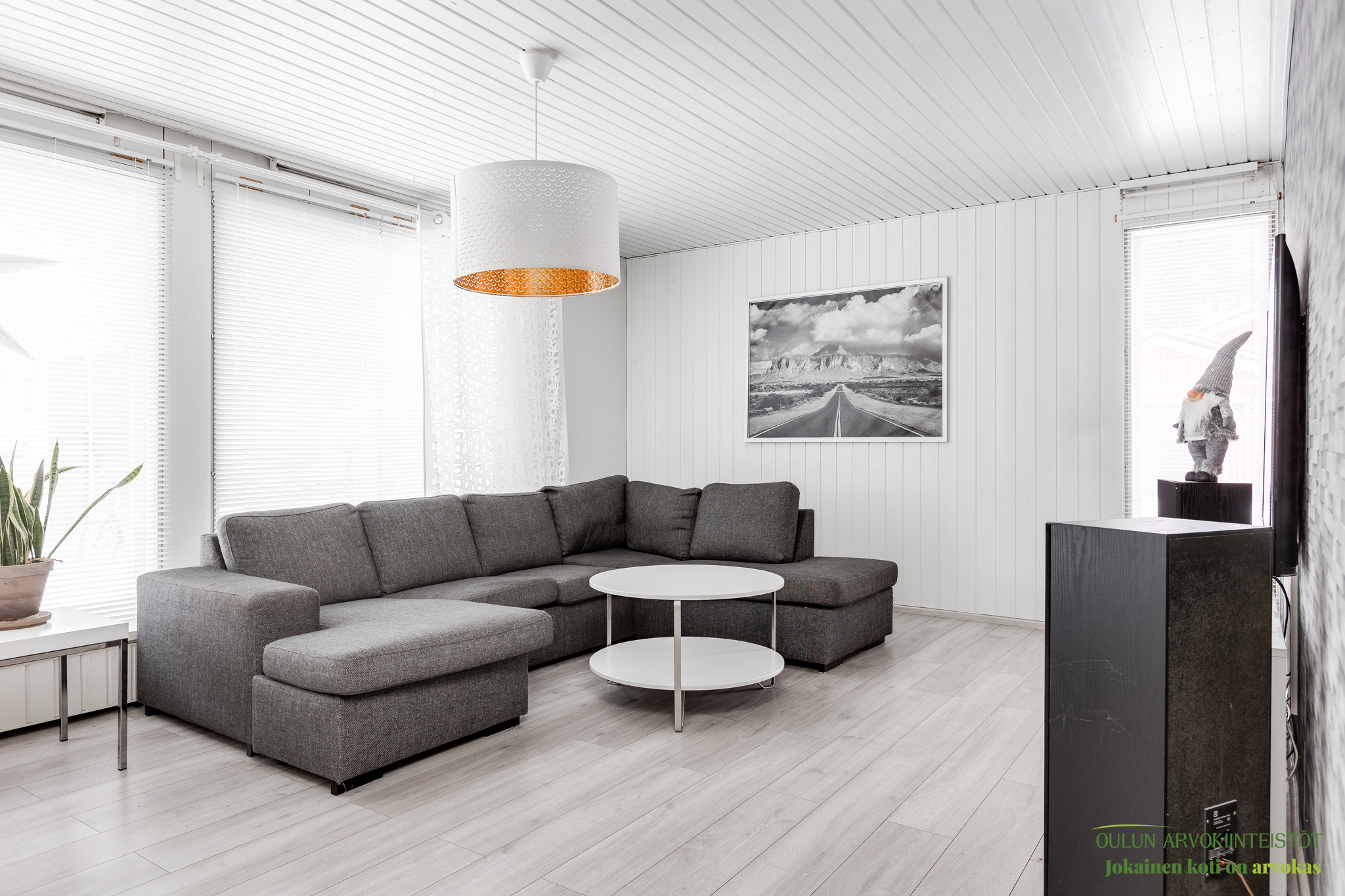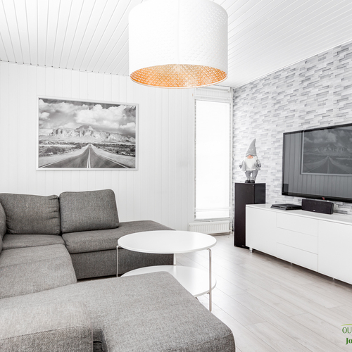 Iso vaalea olohuone täyttyy luonnonvalosta aurinkoisten päivien aikana ja luo avaran ja valoisan tunnelman tarjoten miellyttävän paikan rentoutumiseen ja yhdessäoloon perheen ja ystävien kanssa.
