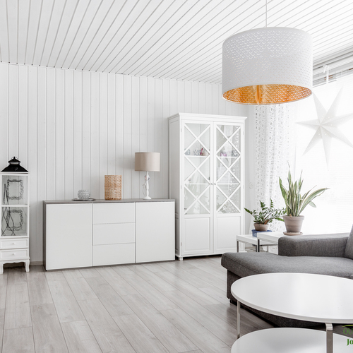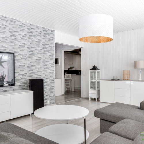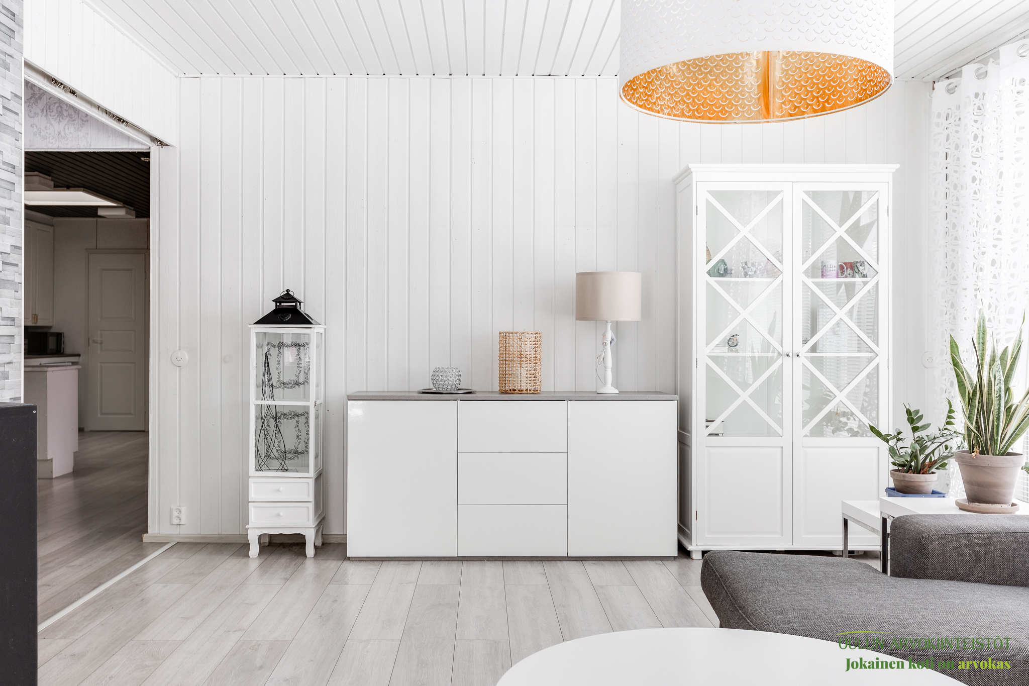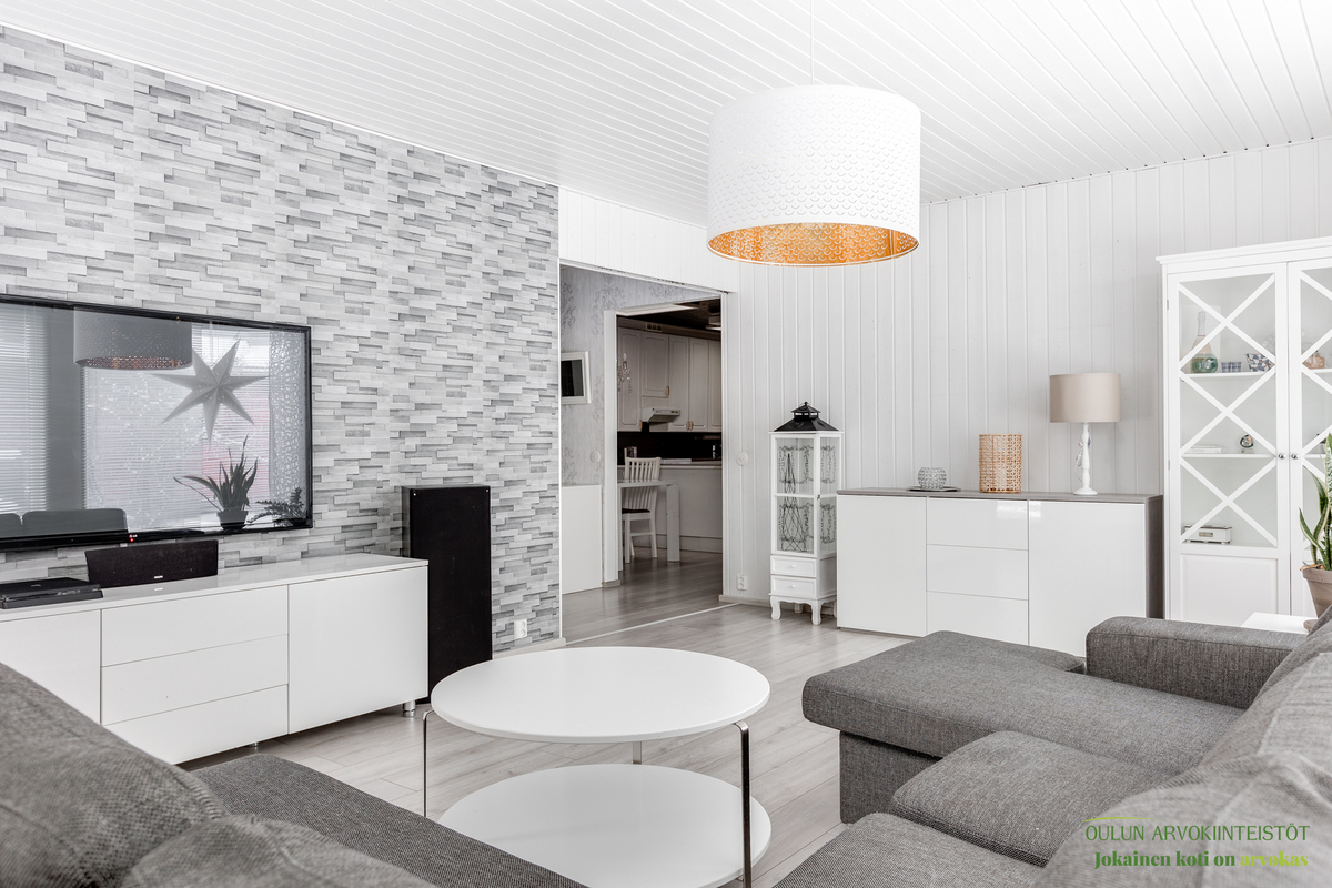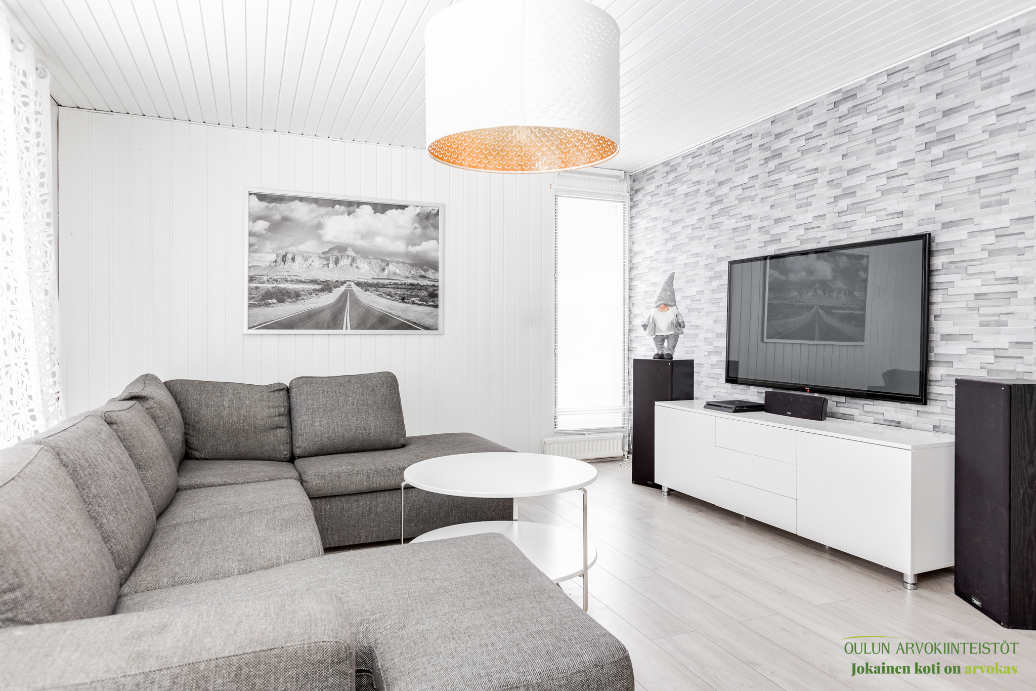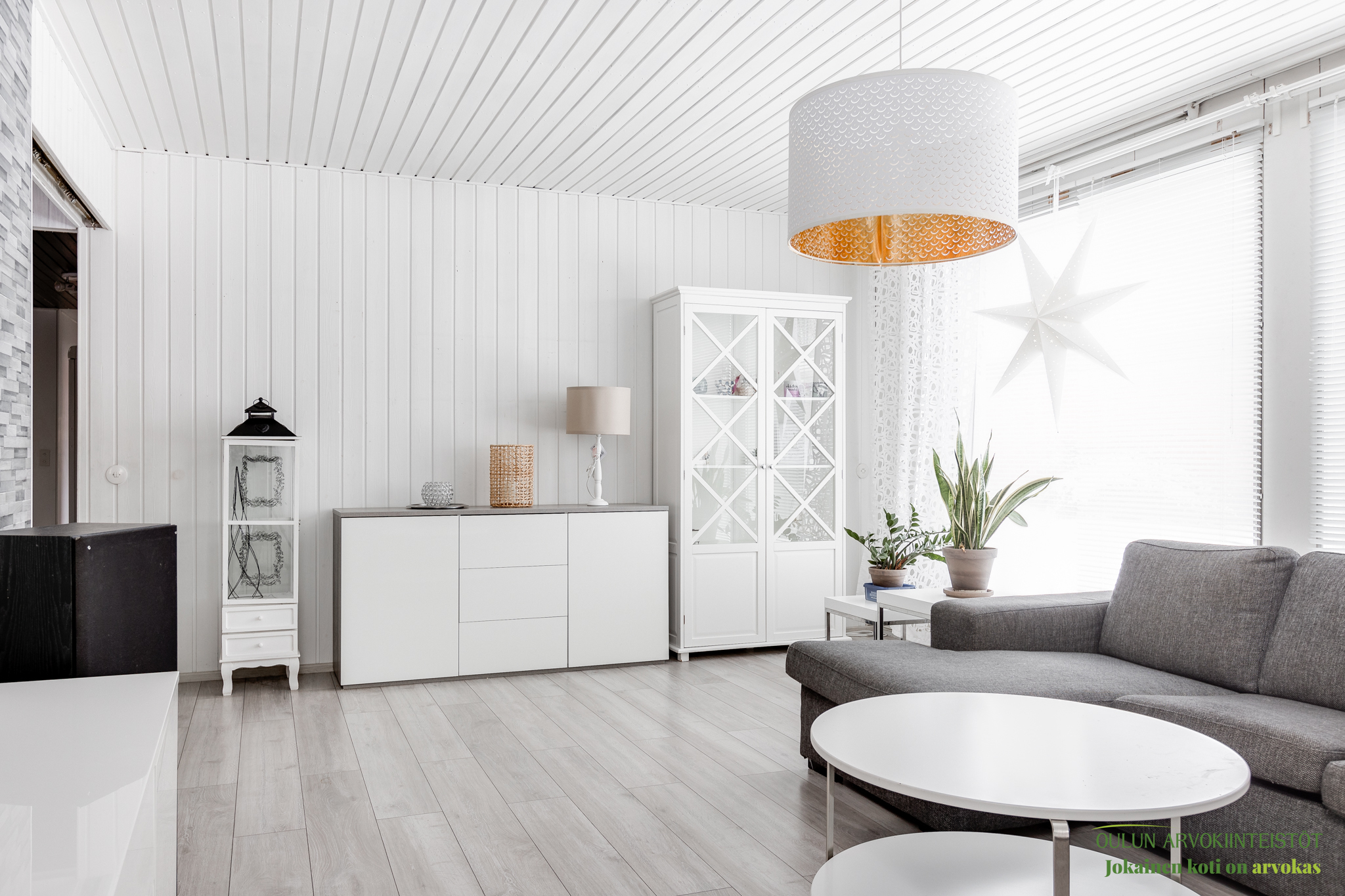 Iso vaalea olohuone täyttyy luonnonvalosta aurinkoisten päivien aikana ja luo avaran ja valoisan tunnelman tarjoten miellyttävän paikan rentoutumiseen ja yhdessäoloon perheen ja ystävien kanssa.