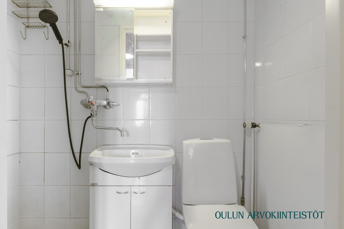 Varusteet: wc-istuin, suihku, peilikaappi, kiinteät valaisimet