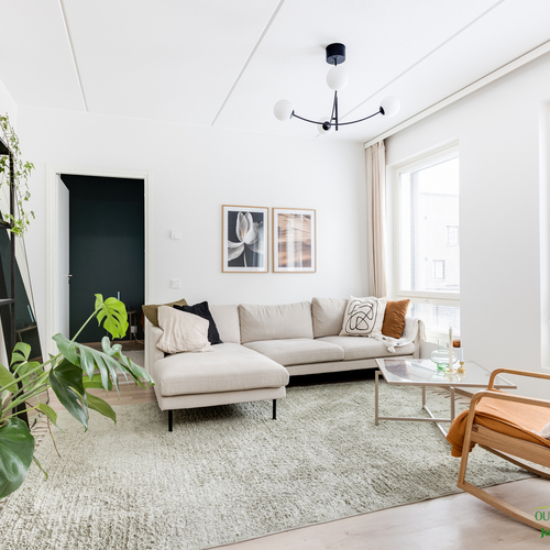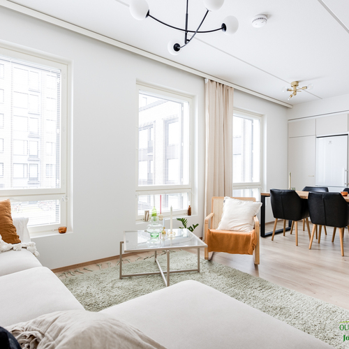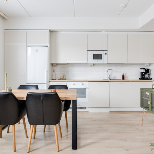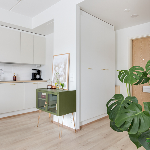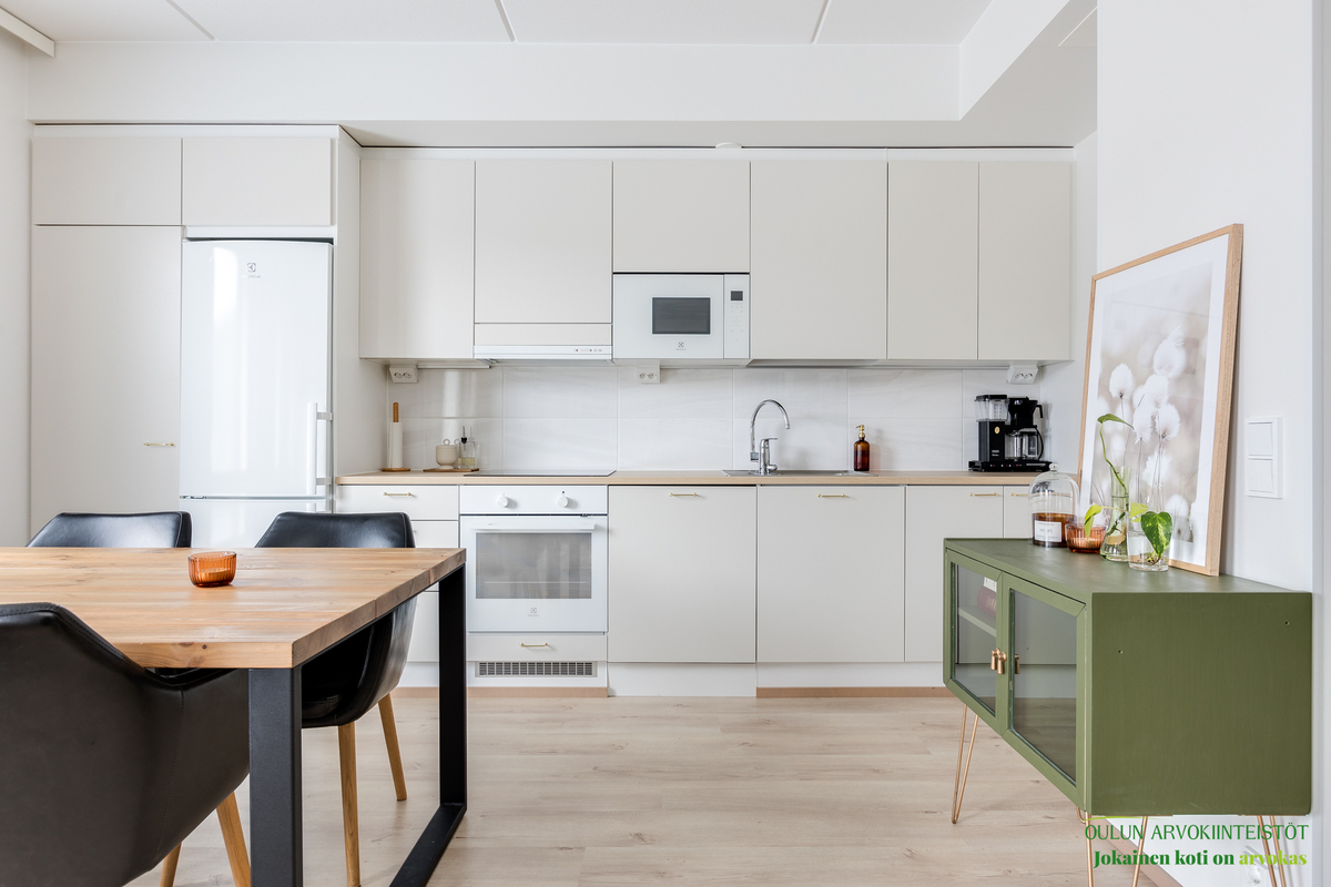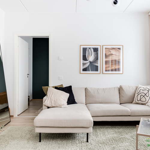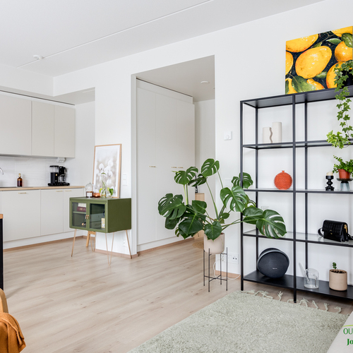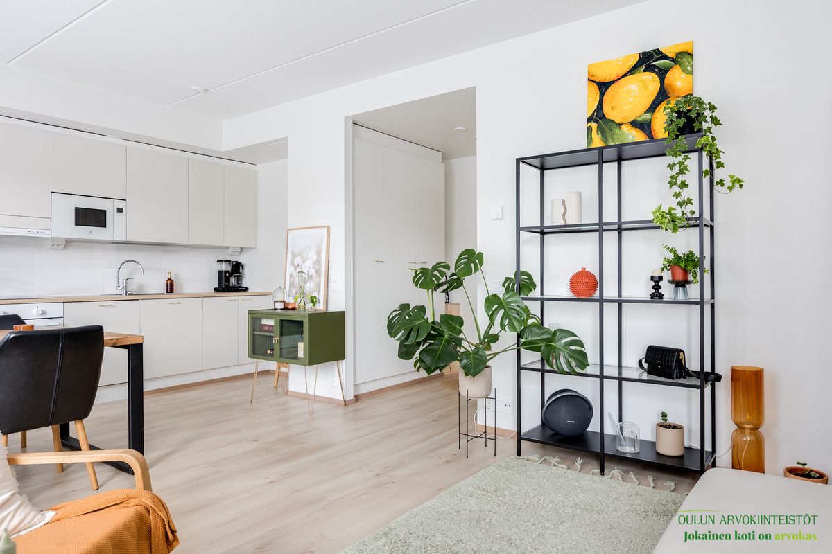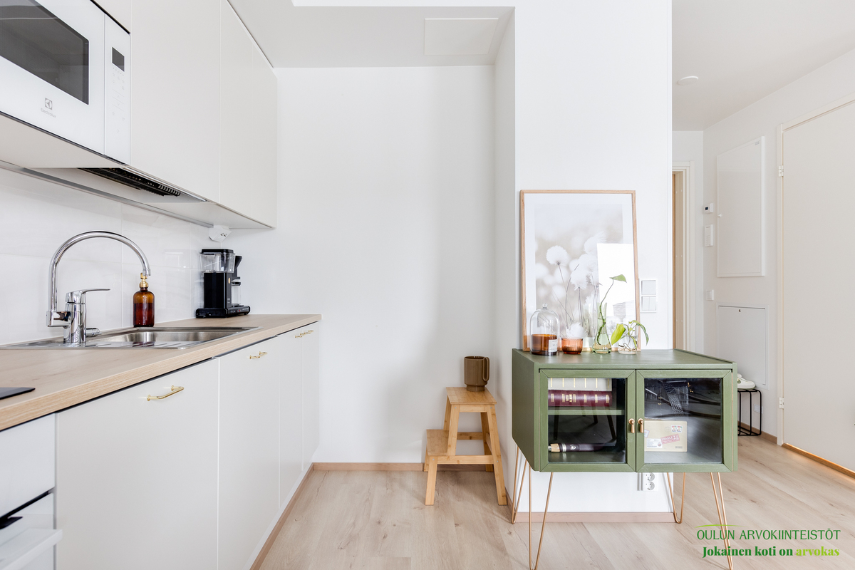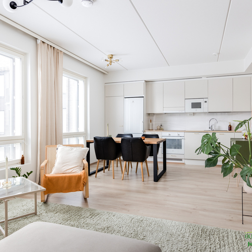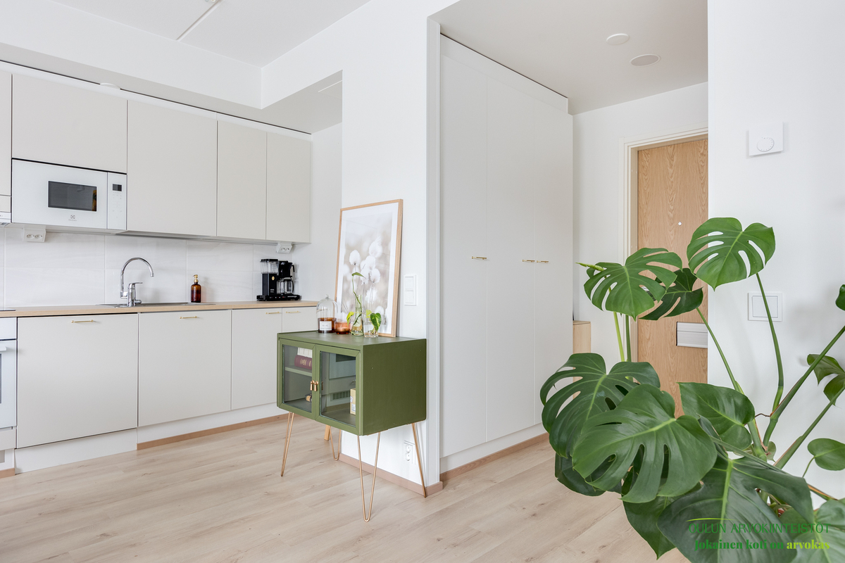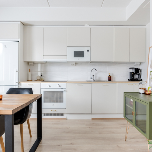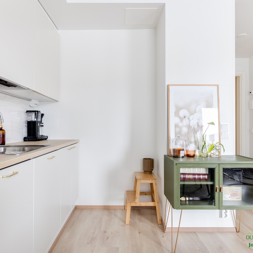 Asunnon neliöt on käytetty viisaasti, ja 51,50 m² tuntuu tilavalta ja avaralta harmonisen pohjaratkaisun ansiosta. Keittiössä katseet kiinnittyvät tyylikkäisiin kultaisiin vetimiin, jotka tuovat ripauksen luksusta moderniin sisustukseen. Vaaleat pinnat ja tarkkaan valitut materiaalit luovat rauhoittavan tunnelman, joka jatkuu kaikkialle asunnossa. Avokeittiö yhdistyy saumattomasti olohuoneeseen, luoden avaran ja kutsuvan tilan oleskeluun.