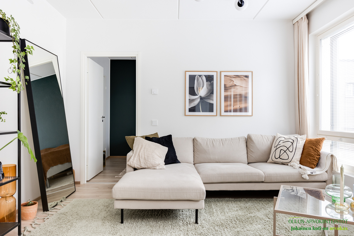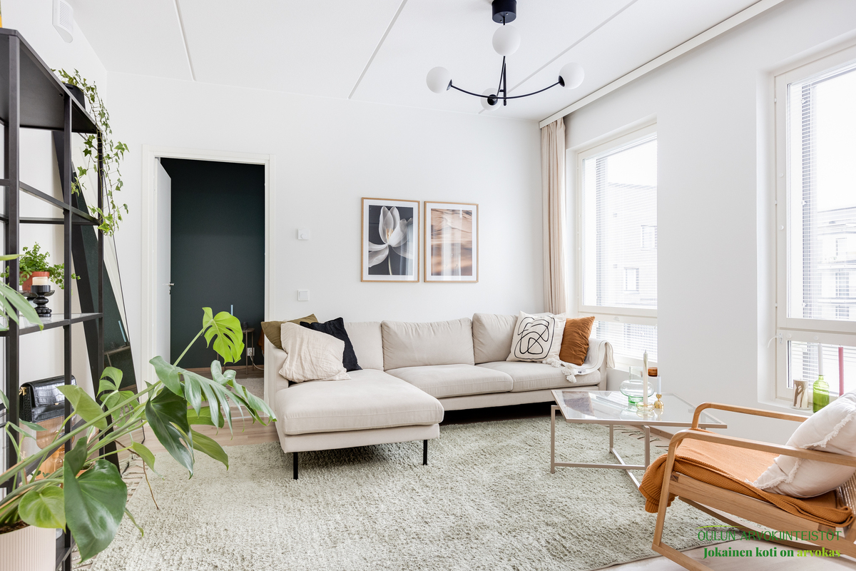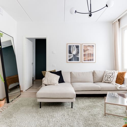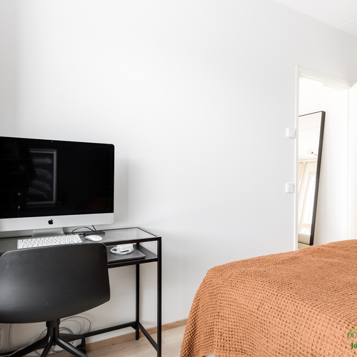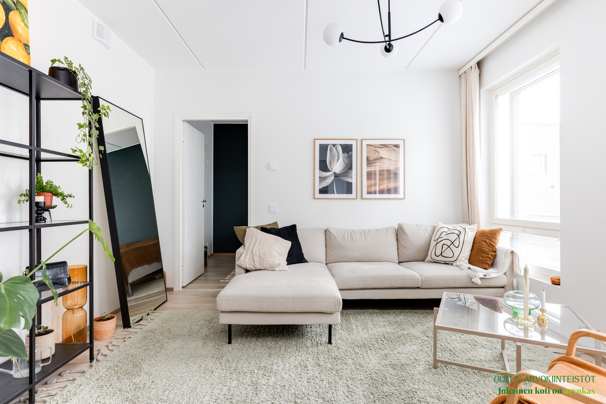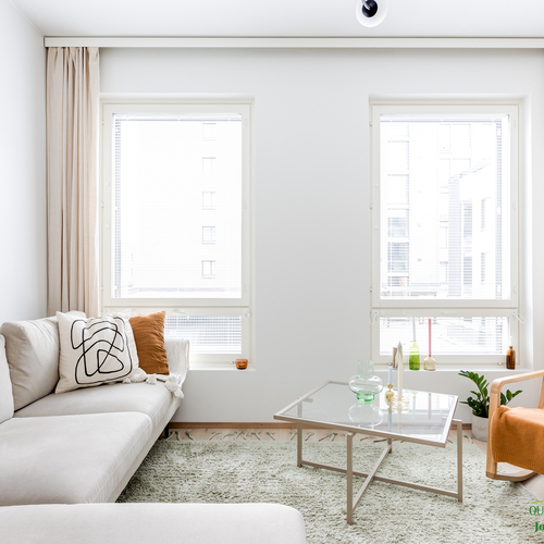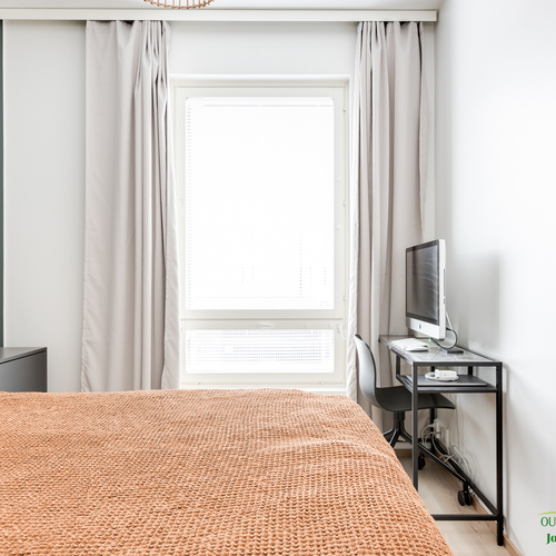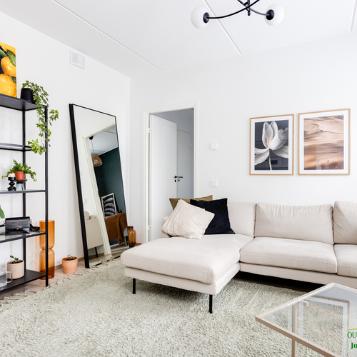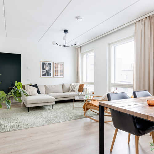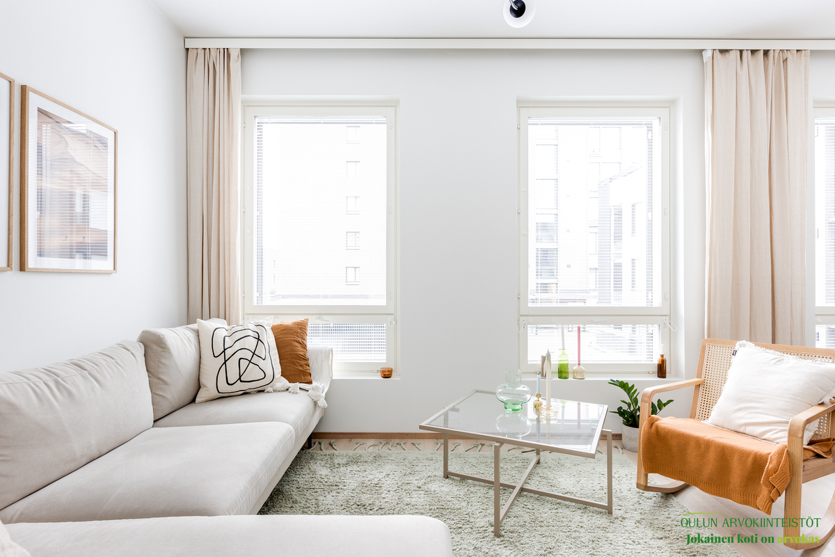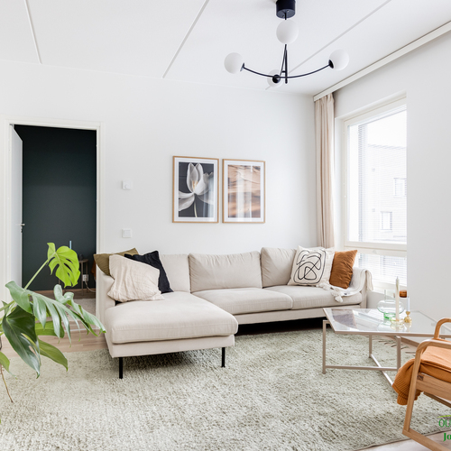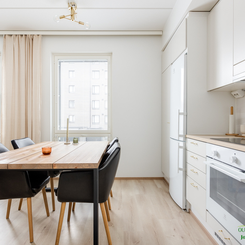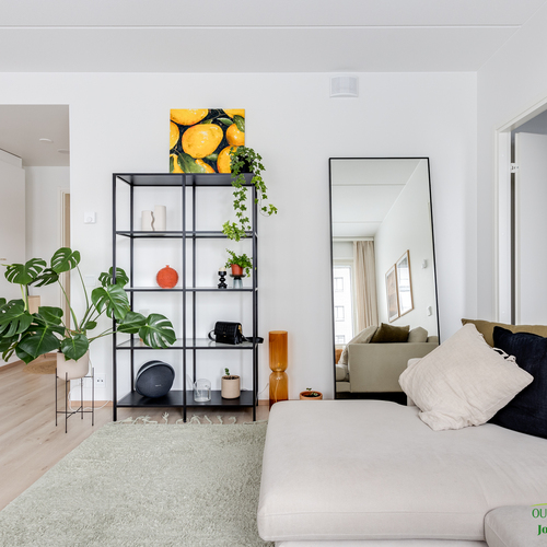 Asunnon neliöt on käytetty viisaasti, ja 51,50 m² tuntuu tilavalta ja avaralta harmonisen pohjaratkaisun ansiosta. Keittiössä katseet kiinnittyvät tyylikkäisiin kultaisiin vetimiin, jotka tuovat ripauksen luksusta moderniin sisustukseen. Vaaleat pinnat ja tarkkaan valitut materiaalit luovat rauhoittavan tunnelman, joka jatkuu kaikkialle asunnossa. Avokeittiö yhdistyy saumattomasti olohuoneeseen, luoden avaran ja kutsuvan tilan oleskeluun.