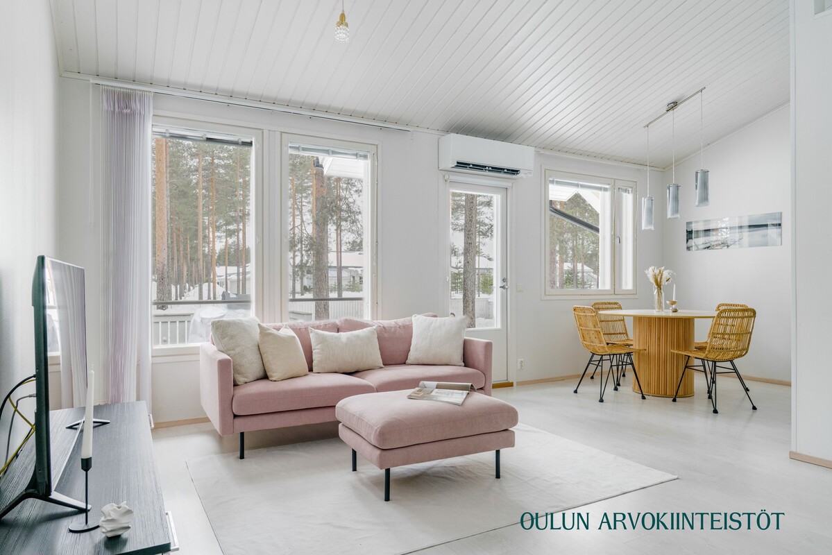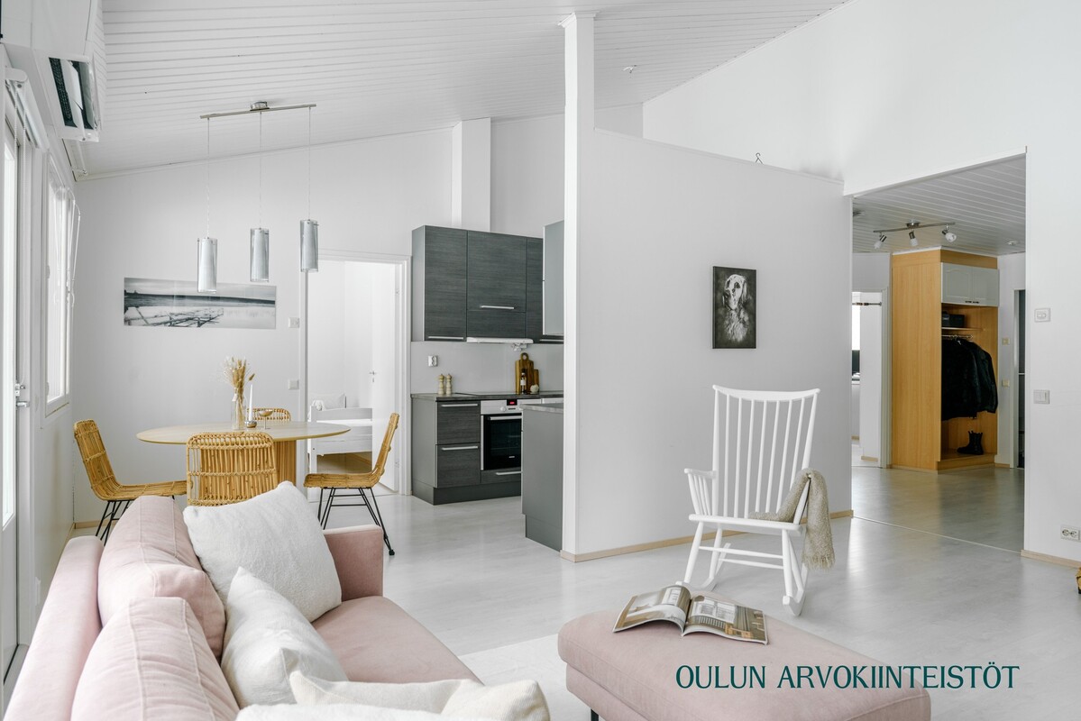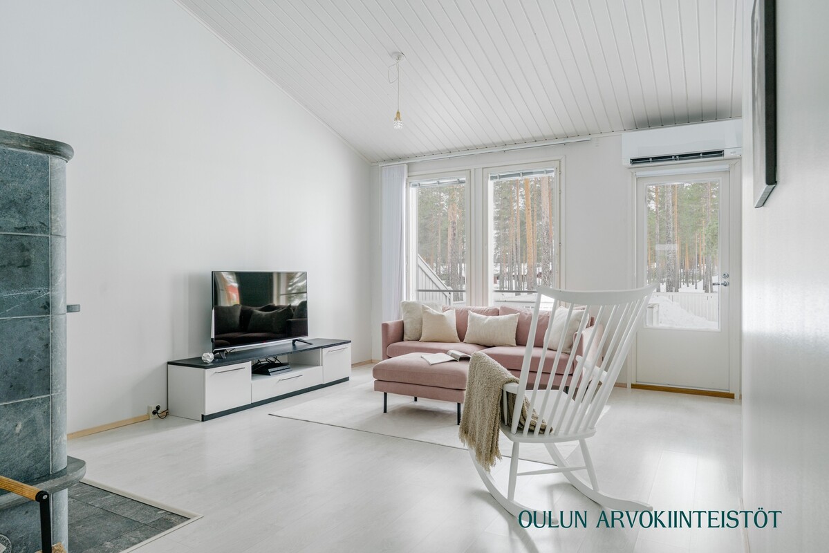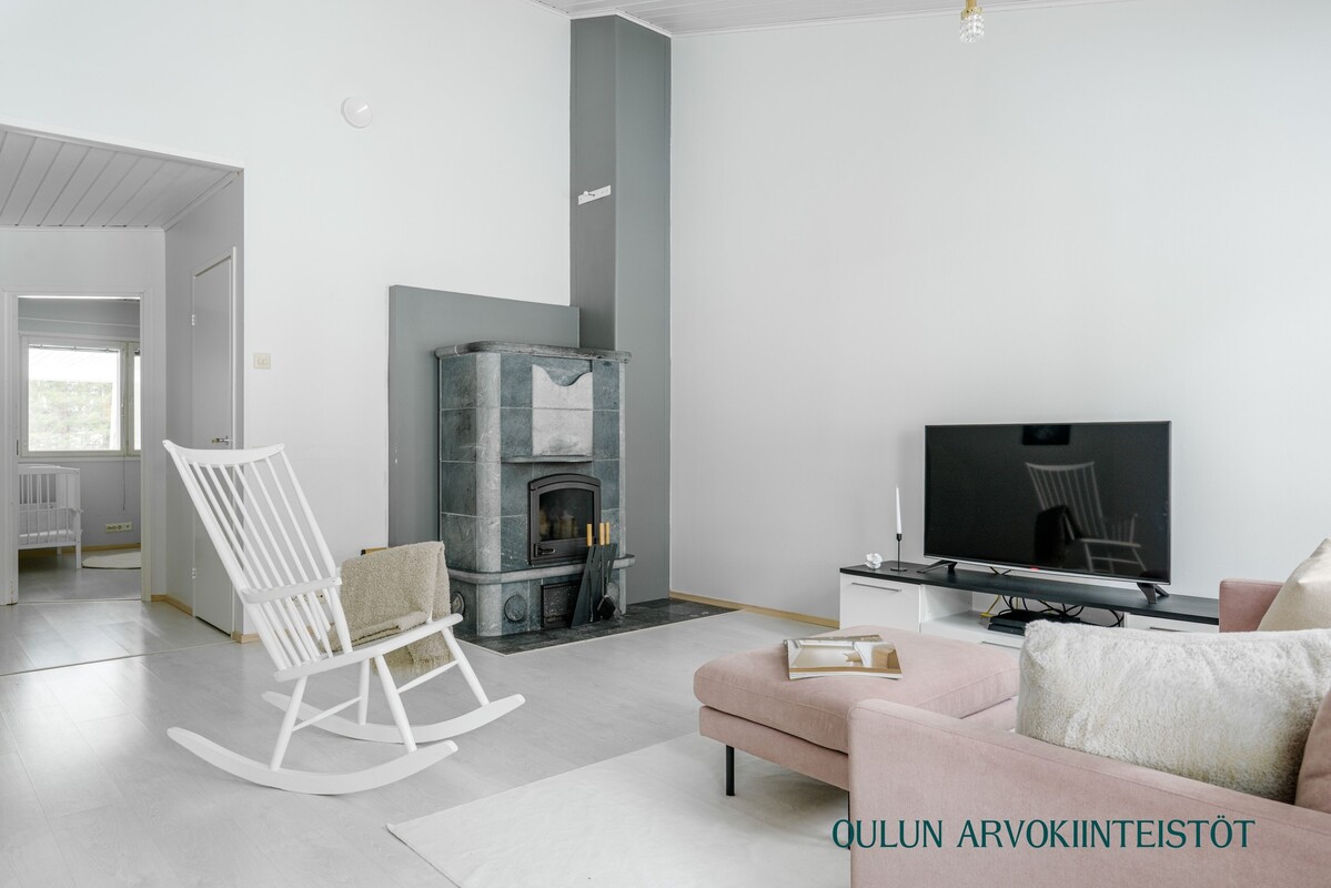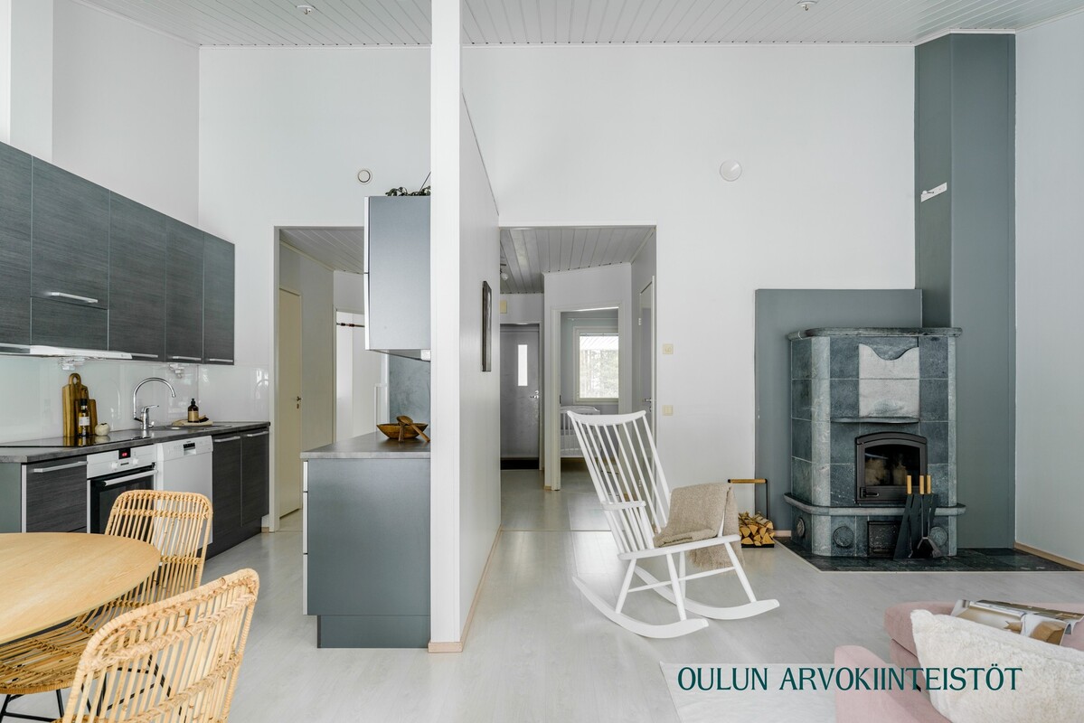 Kodissa on kolme makuuhuonetta, tilava olohuone sekä keittiö ruokailutiloineen. Olohuoneen korkea tila ja suuret ikkunat tuovat mukavasti valoa sisälle ja varaava takka luo tunnelmaa sekä auttaa lämmityskuluissa. Lisäksi asumismukavuutta lisää ilmalämpöpumppu.