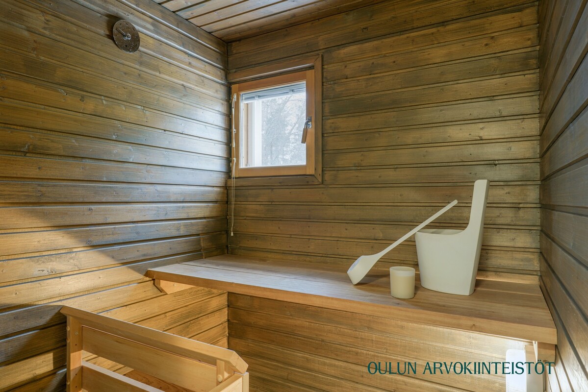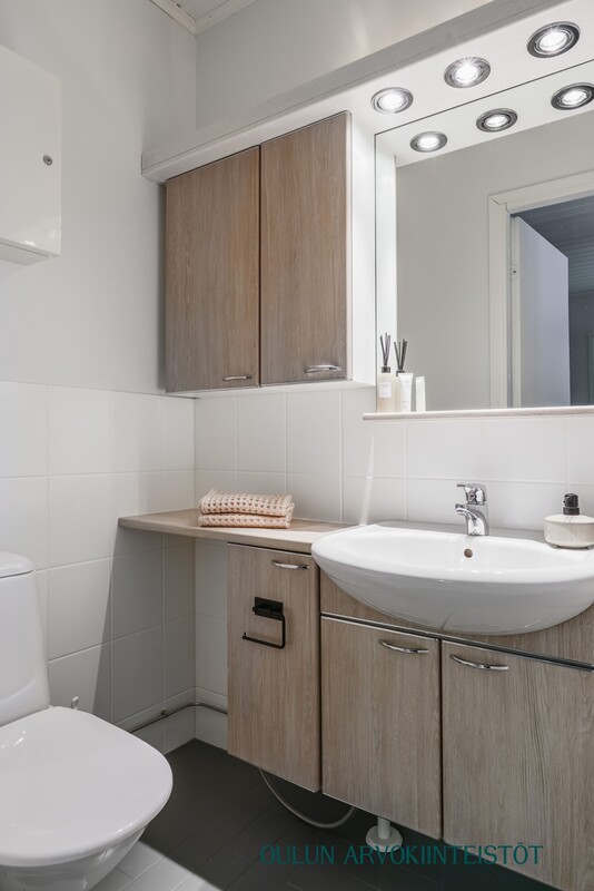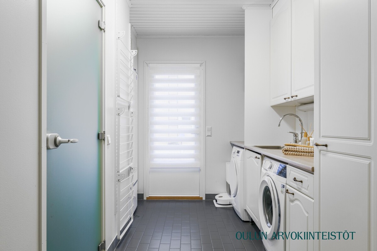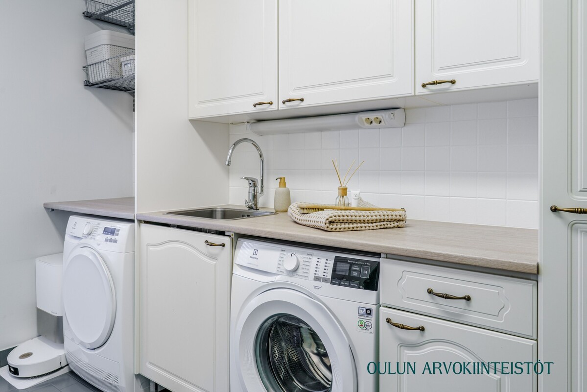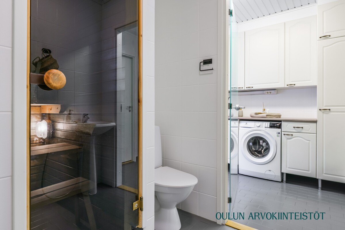 Arjen sujuvuutta tukee erillinen kodinhoitohuone, josta on käynti suoraan ulos. Kylpyhuoneen yhteydessä on toinen wc ja oma sauna sekä lisäksi kodissa myös on erillinen wc.