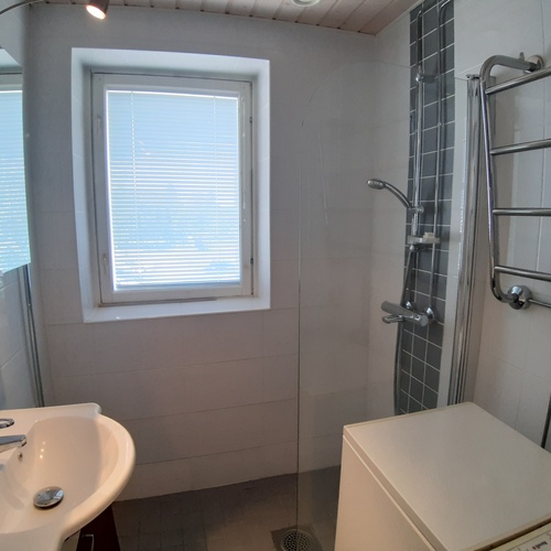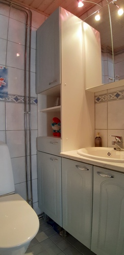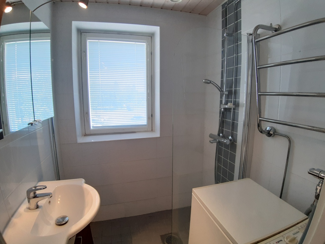 Varusteet: suihkuseinä, pesukoneliitäntä, allaskaappi, peilikaappi, peili, kylpyhuonekaapistot, pesukone, kiinteät valaisimet