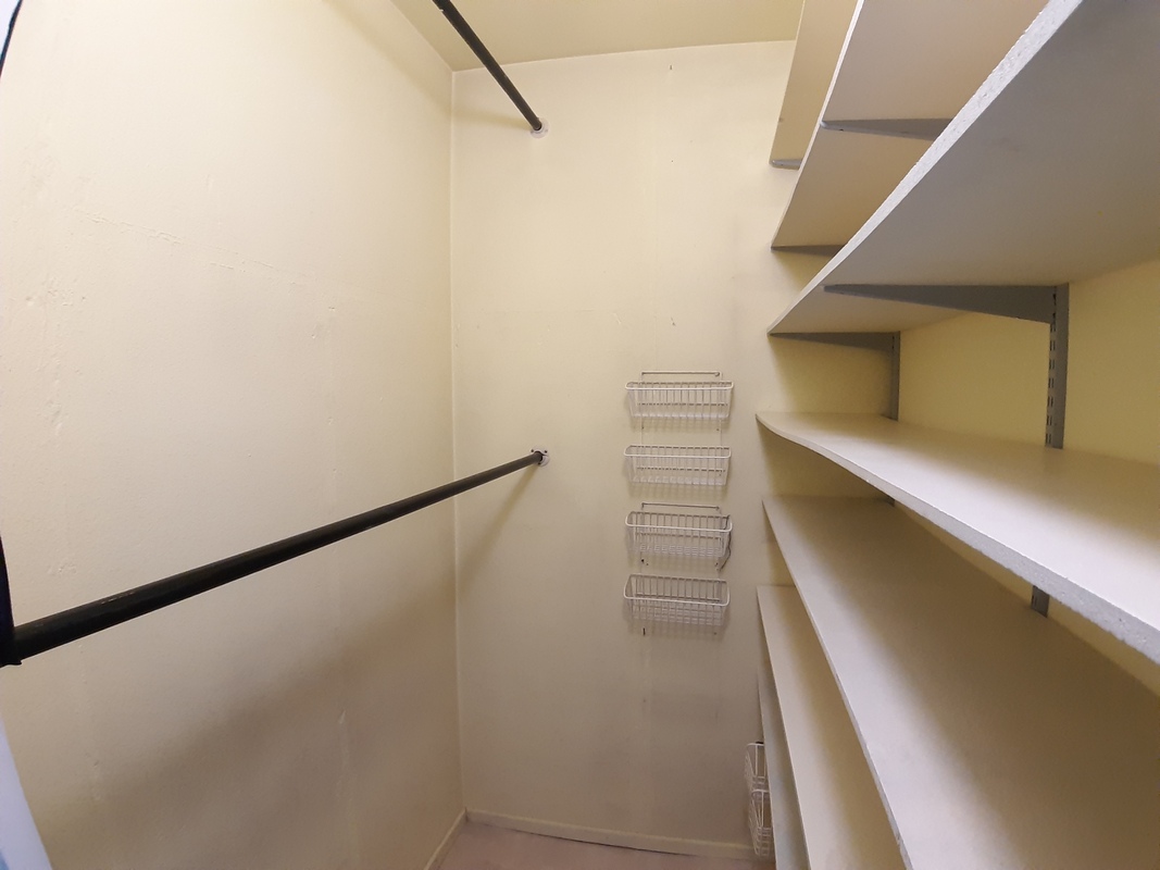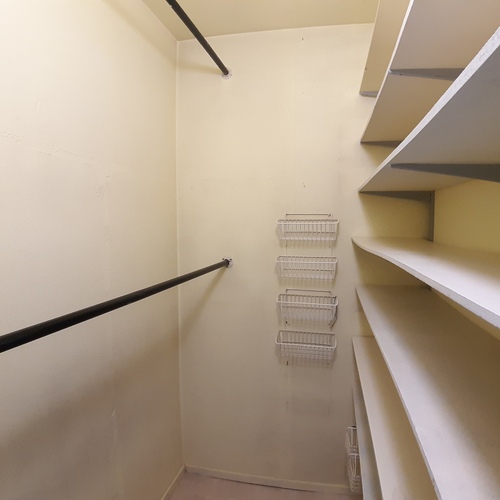 Makuuhuone 2: Seinät tapetti/maalattubetoni. Betonilattia muovimatolla. Noin 3 m² vaatehuone toisen makuuhuoneen yhteydessä.