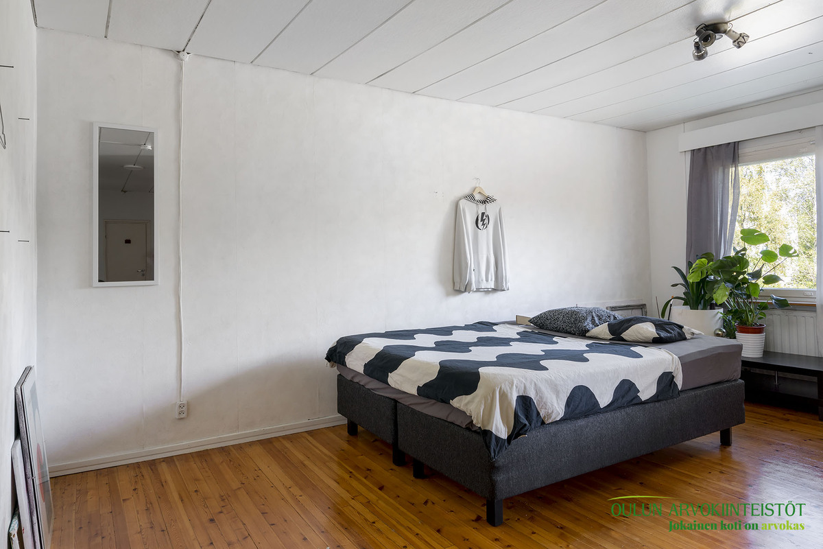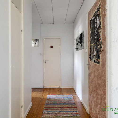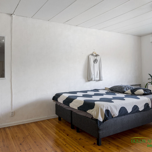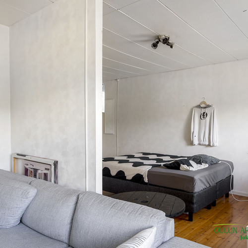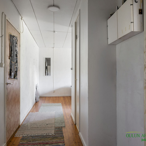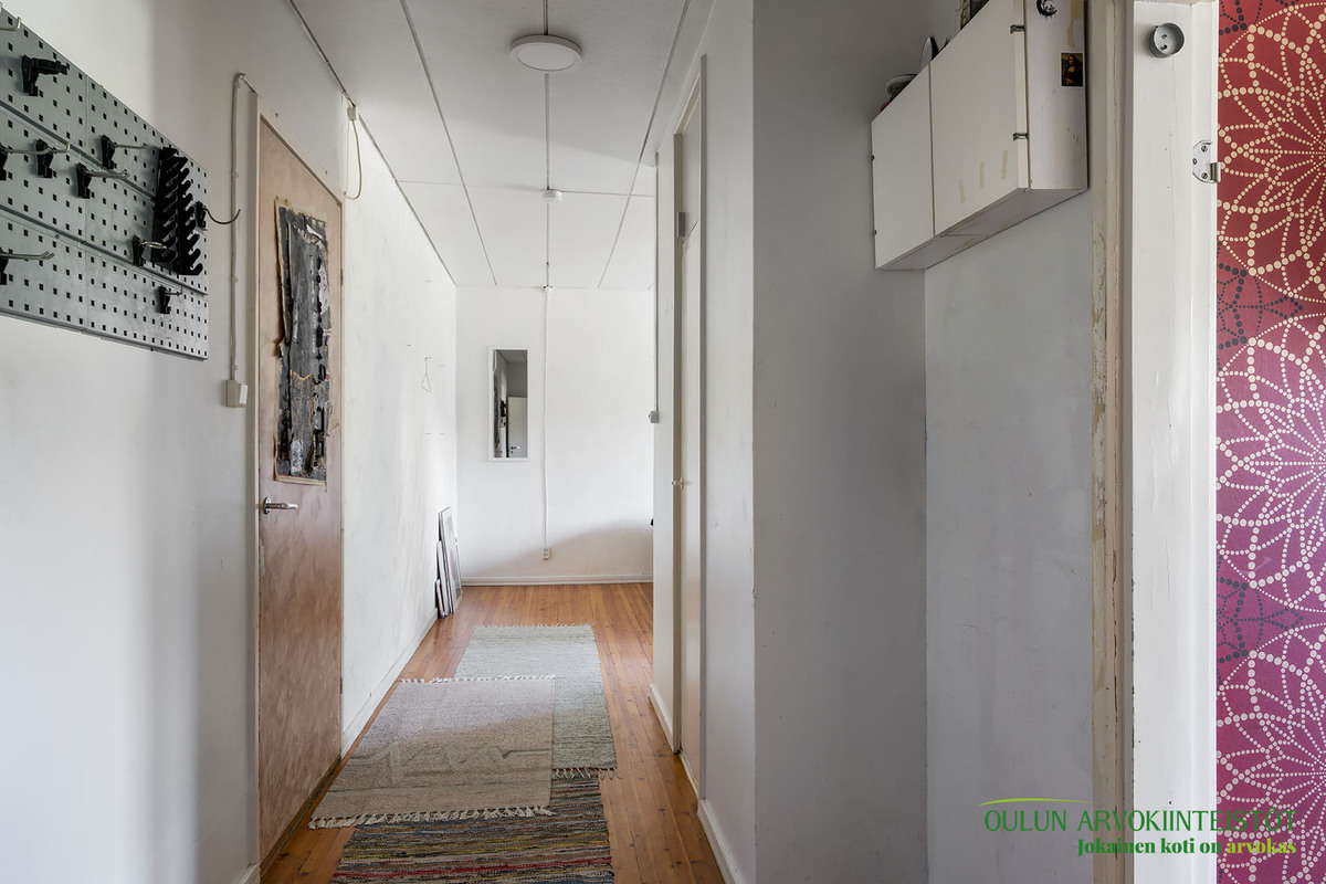 läpitalon asunto, huoneet saavat luonnonvaloa. Laminaattilattia ja vaaleat maalipinnat tekevät tilasta rauhallisen ja helposti sisustettavan.