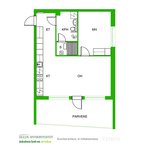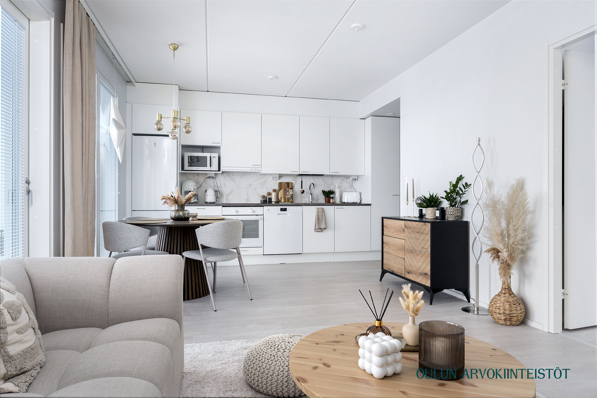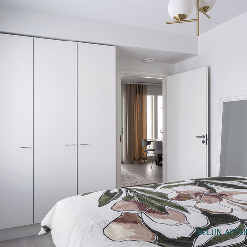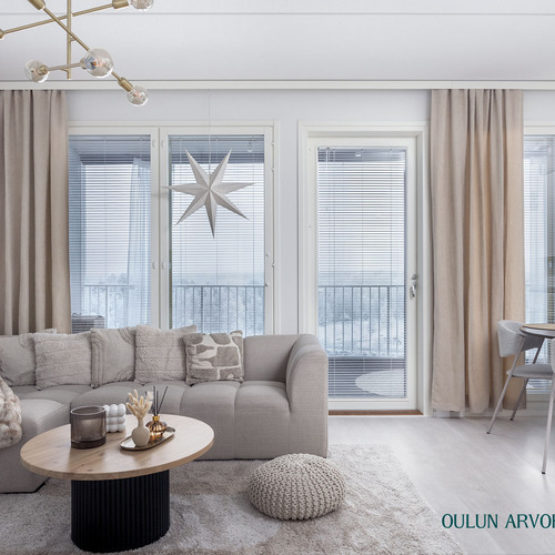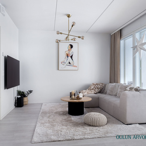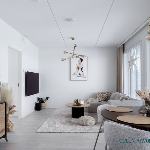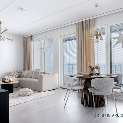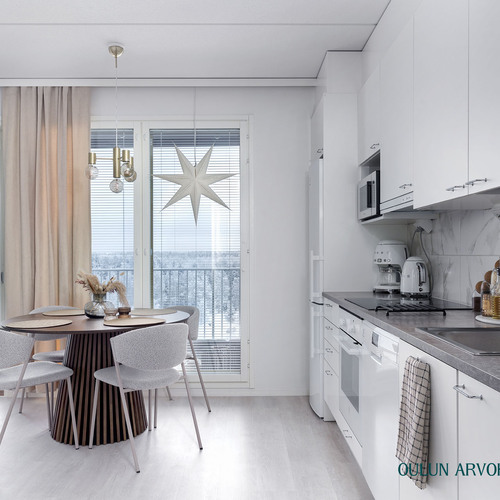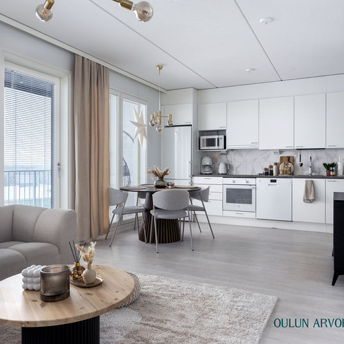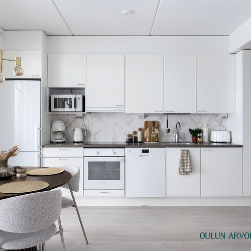 Asunnon pohjaratkaisu on toimiva ja nykyaikainen. Olohuone ja keittiö muodostavat yhtenäisen, avaran kokonaisuuden, joka kutsuu viihtymään. Keittiö on tyylikäs ja ajattoman vaalea, varustettuna laadukkailla kodinkoneilla ja hyvillä säilytysratkaisuilla. Ruokailutila asettuu luontevasti ikkunan ääreen, jossa arjen ja juhlan hetket saavat valoa ja näkymiä.