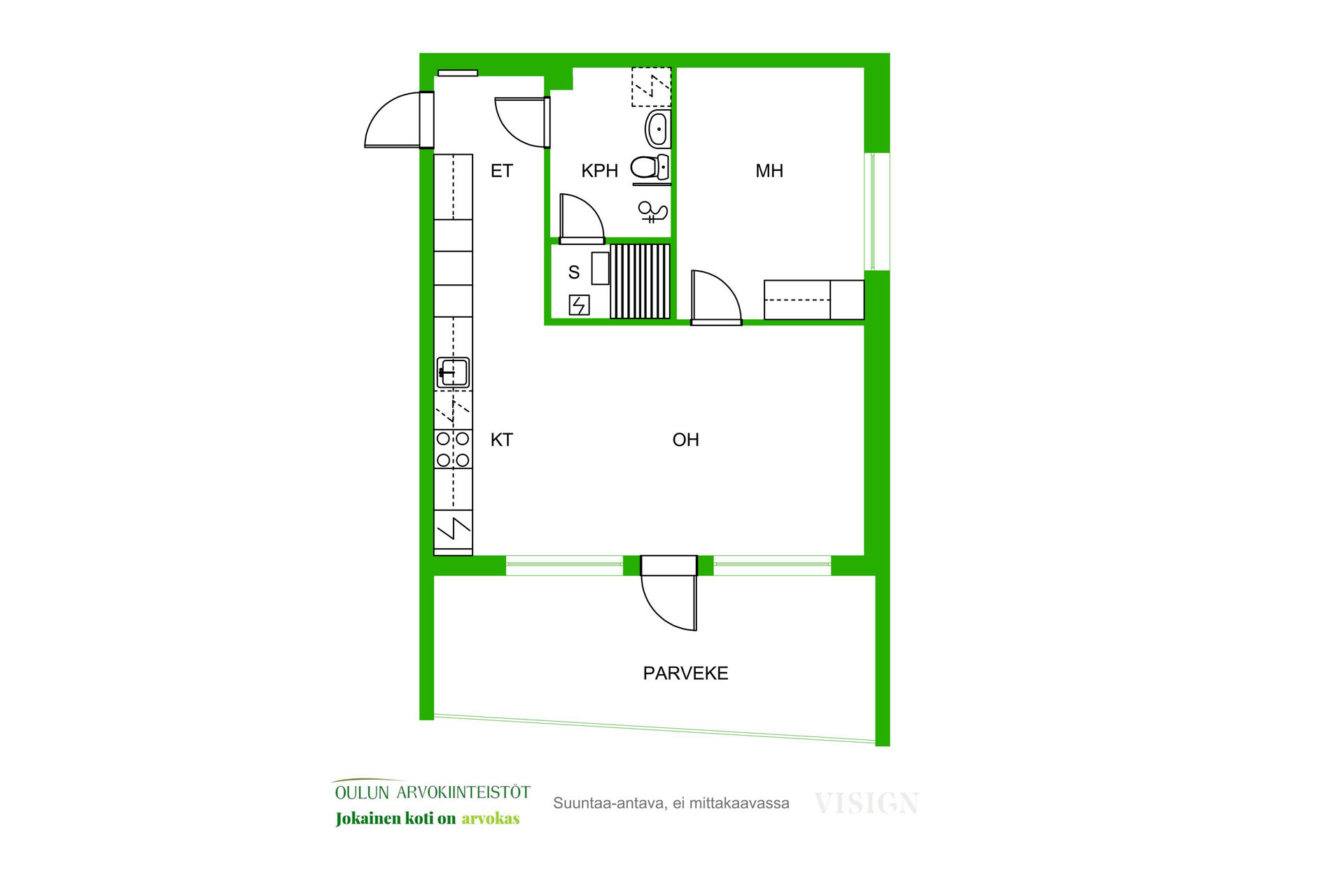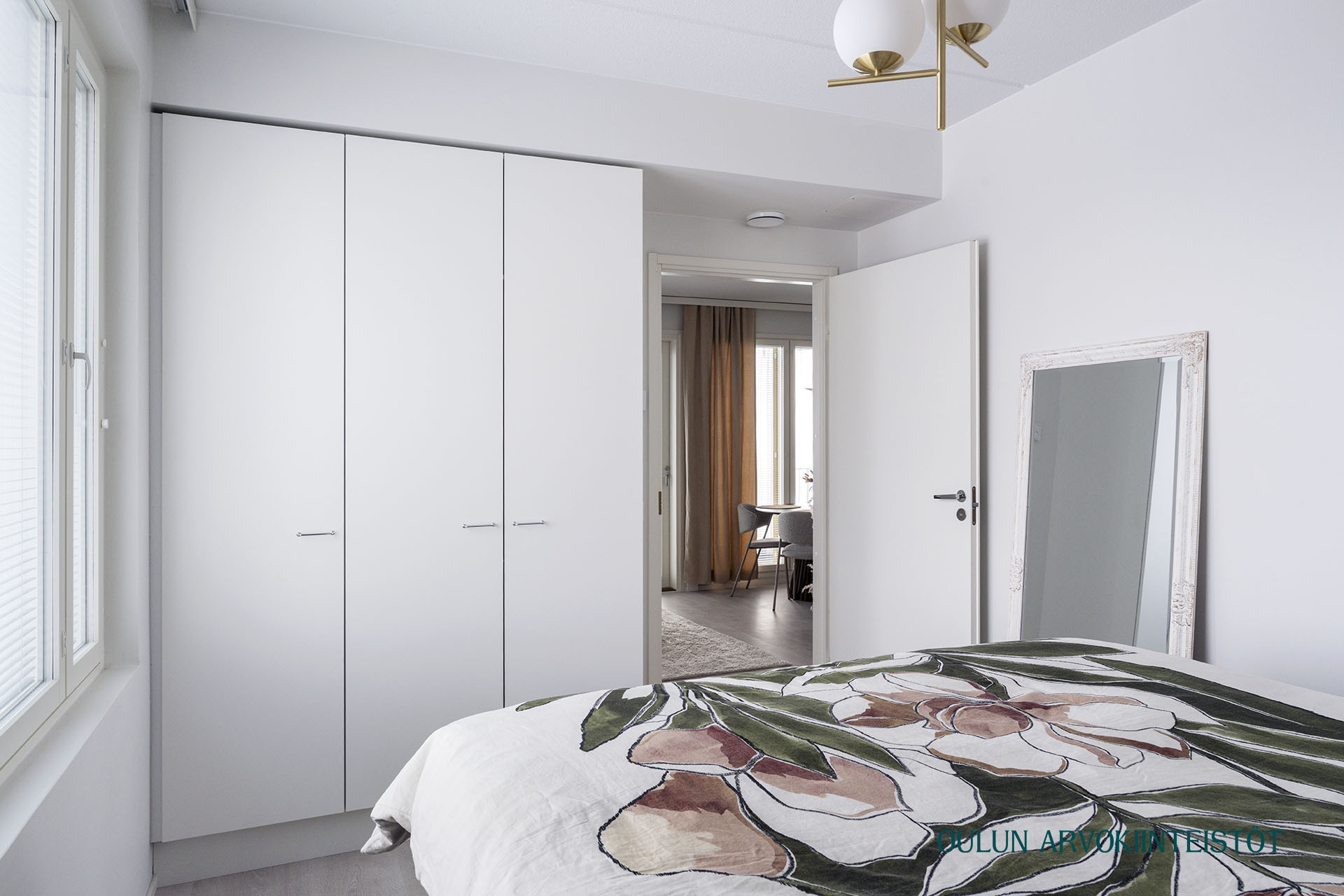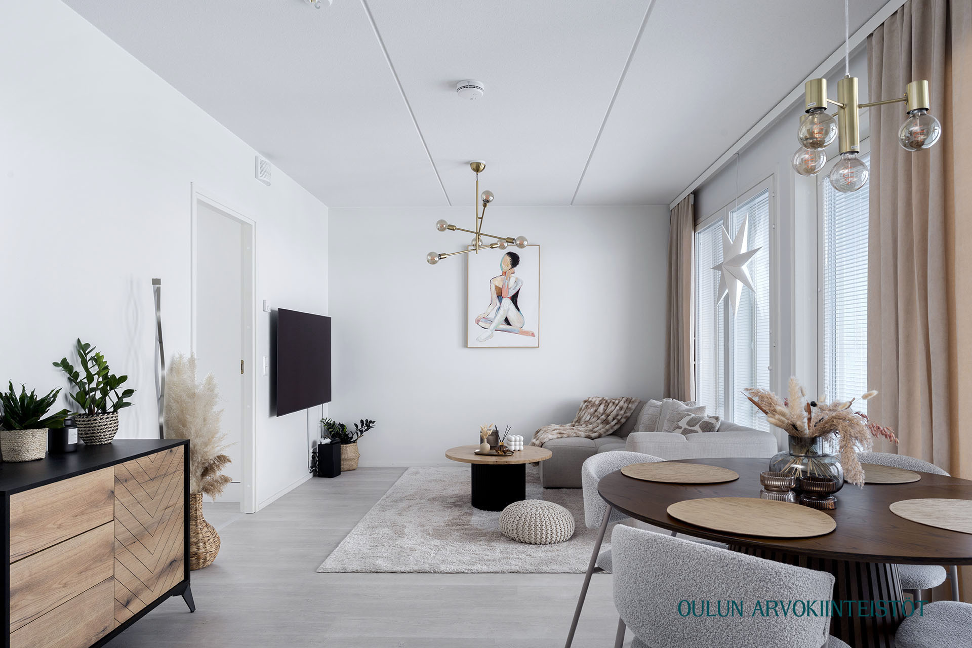 Asunnon pohjaratkaisu on toimiva ja nykyaikainen. Olohuone ja keittiö muodostavat yhtenäisen, avaran kokonaisuuden, joka kutsuu viihtymään. Keittiö on tyylikäs ja ajattoman vaalea, varustettuna laadukkailla kodinkoneilla ja hyvillä säilytysratkaisuilla. Ruokailutila asettuu luontevasti ikkunan ääreen, jossa arjen ja juhlan hetket saavat valoa ja näkymiä.
