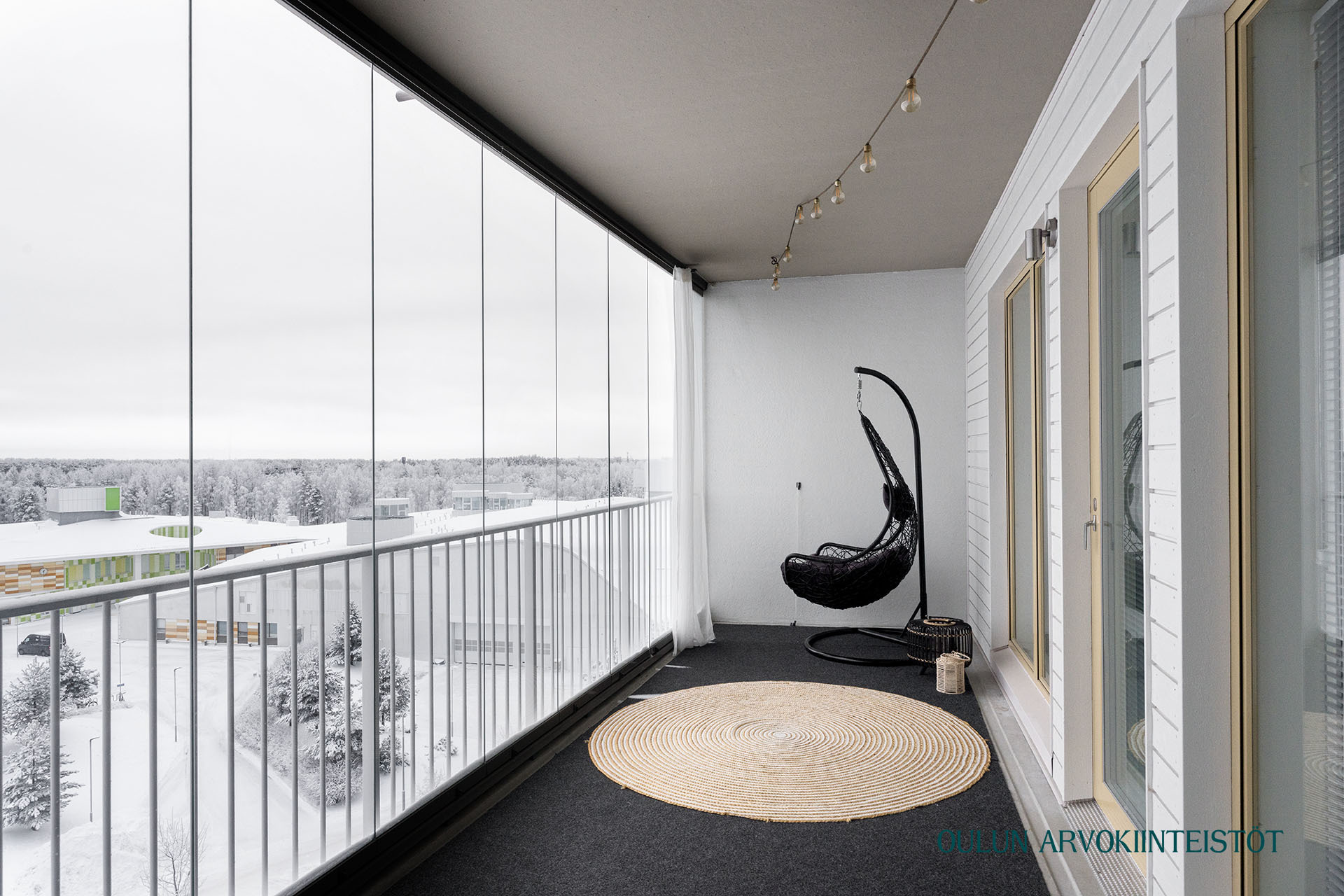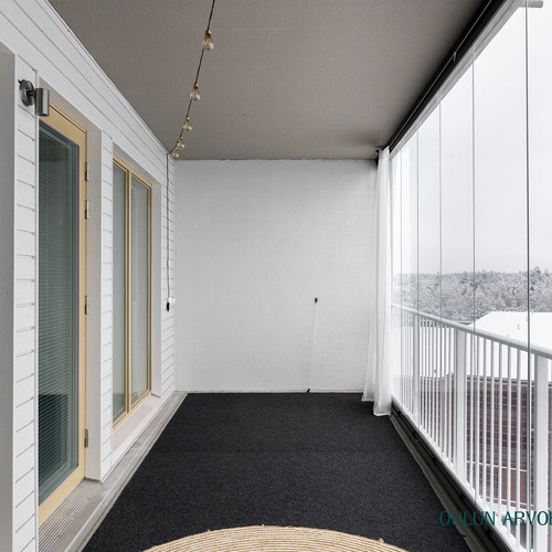 Olohuoneesta on käynti lasitetulle parvekkeelle, joka toimii lisähuoneena aikaisesta keväästä pitkälle syksyyn. Parvekkeelta avautuvat rauhalliset ja avarat maisemat tekevät siitä täydellisen paikan aamukahville tai rentoutumiselle.
