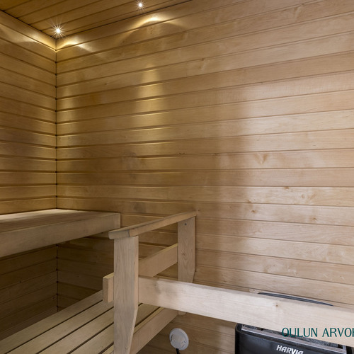 Makuuhuoneessa on hyvin säilytystilaa ja rauhallinen tunnelma. Tyylikäs kylpyhuone hurmaa moderneilla materiaaleilla, laadukkailla kalusteilla sekä omalla saunalla, joka tuo arkeen ripauksen luksusta.