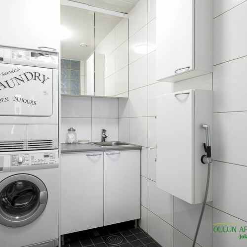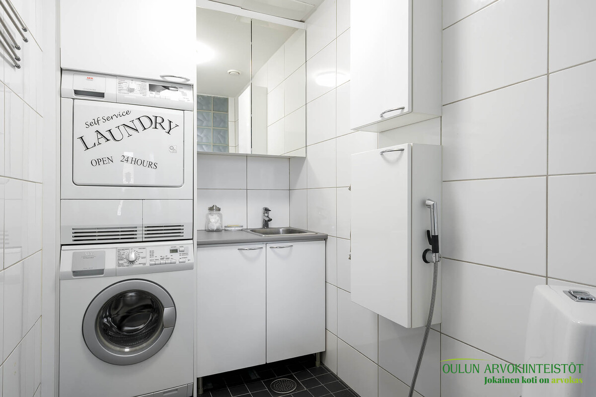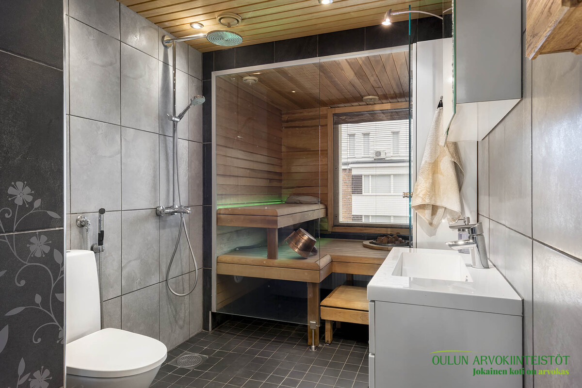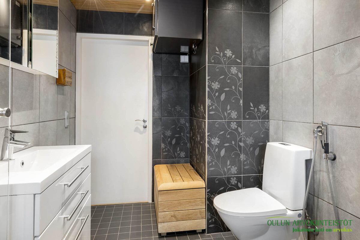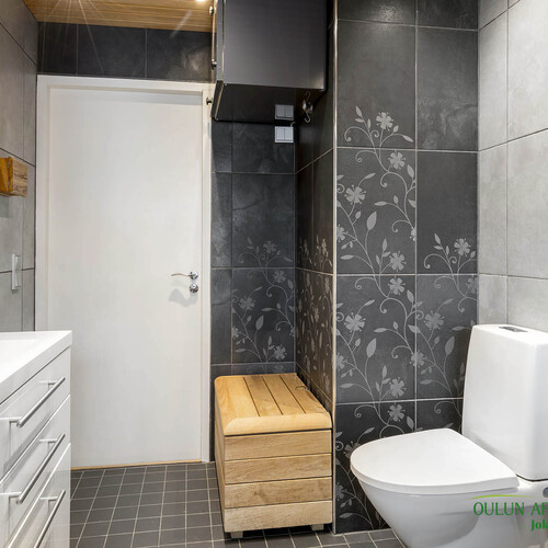 Varusteet: lattiaan asennettu WC, bidee, lattialämmitys, lattiakaivo, allaskaappi, peilikaappi, pesukoneliitäntä
