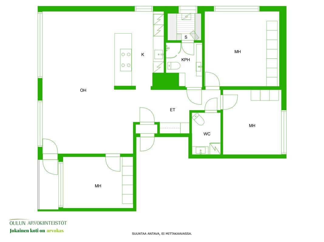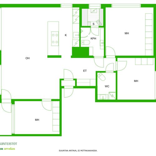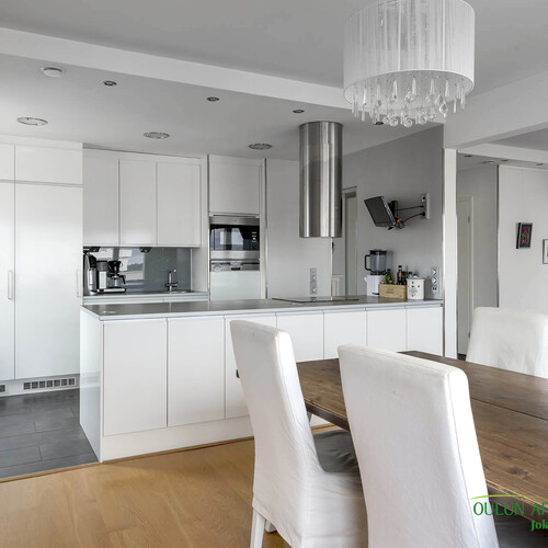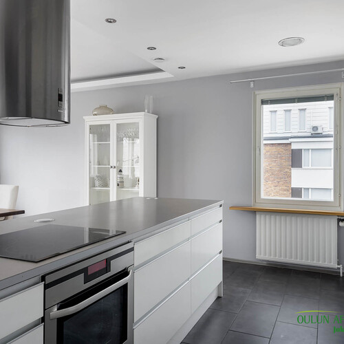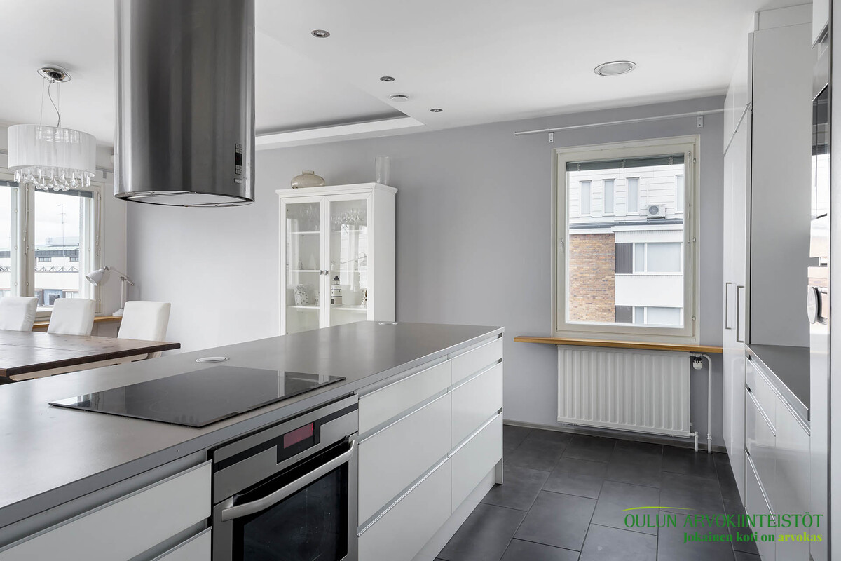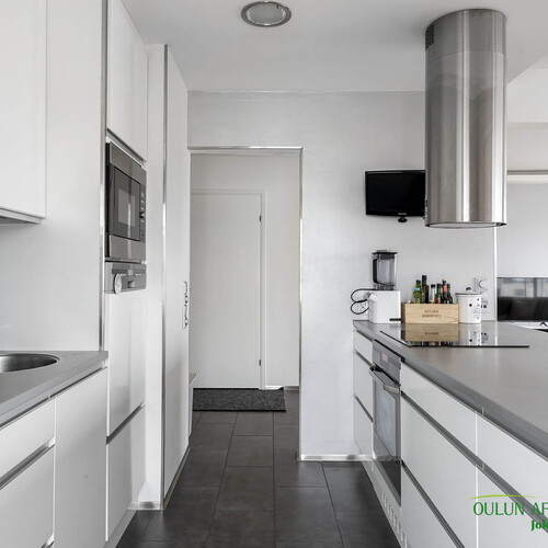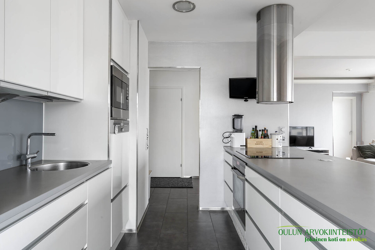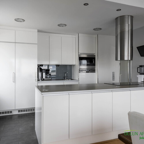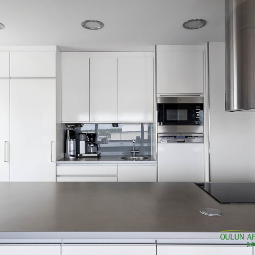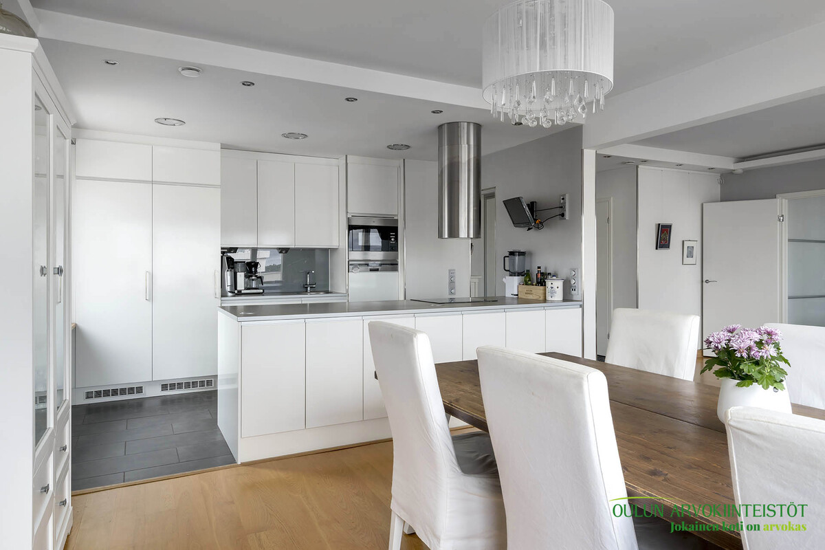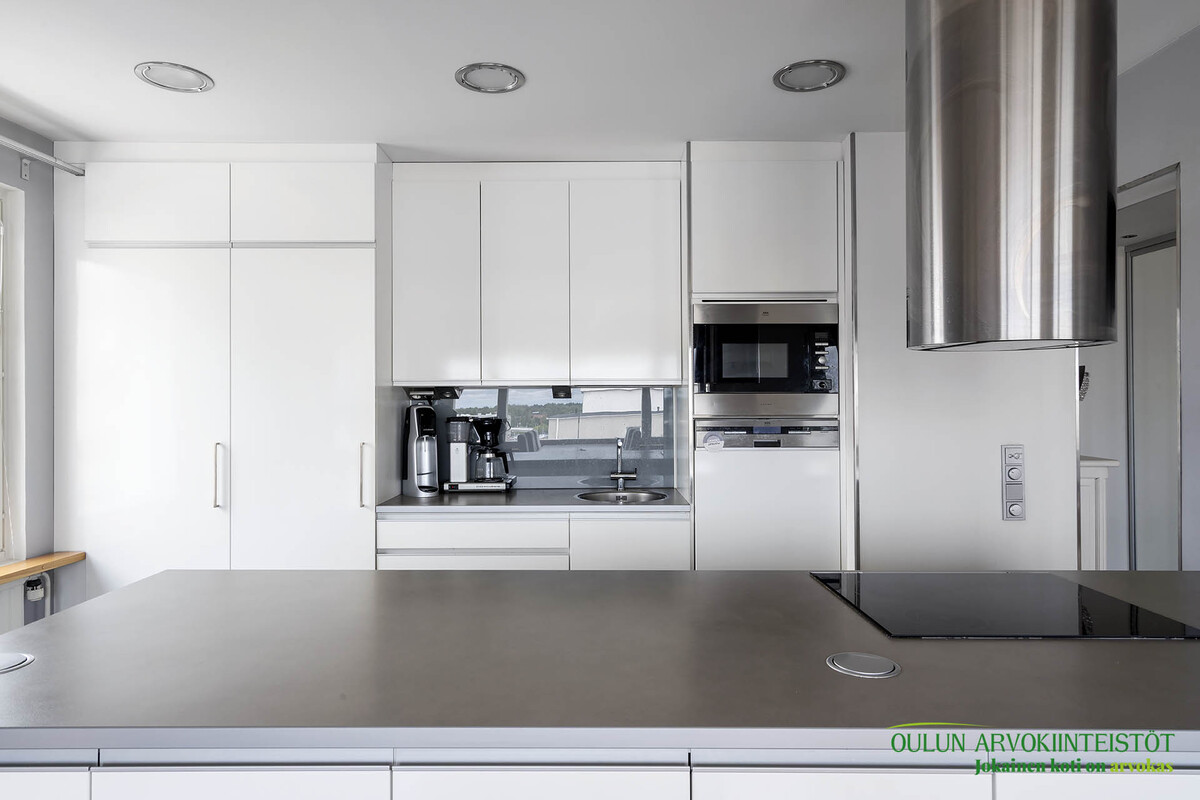 Varusteet: jääkaappi, pakastin, integroidut kodinkoneet, integroitu astianpesukone, induktioliesi, erillisuuni, liesituuletin hormilla, mikroaaltouuni