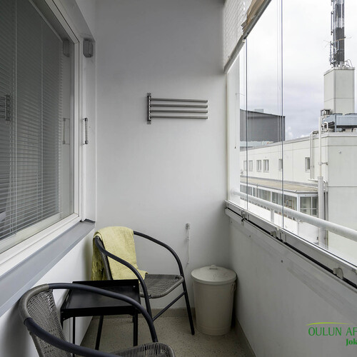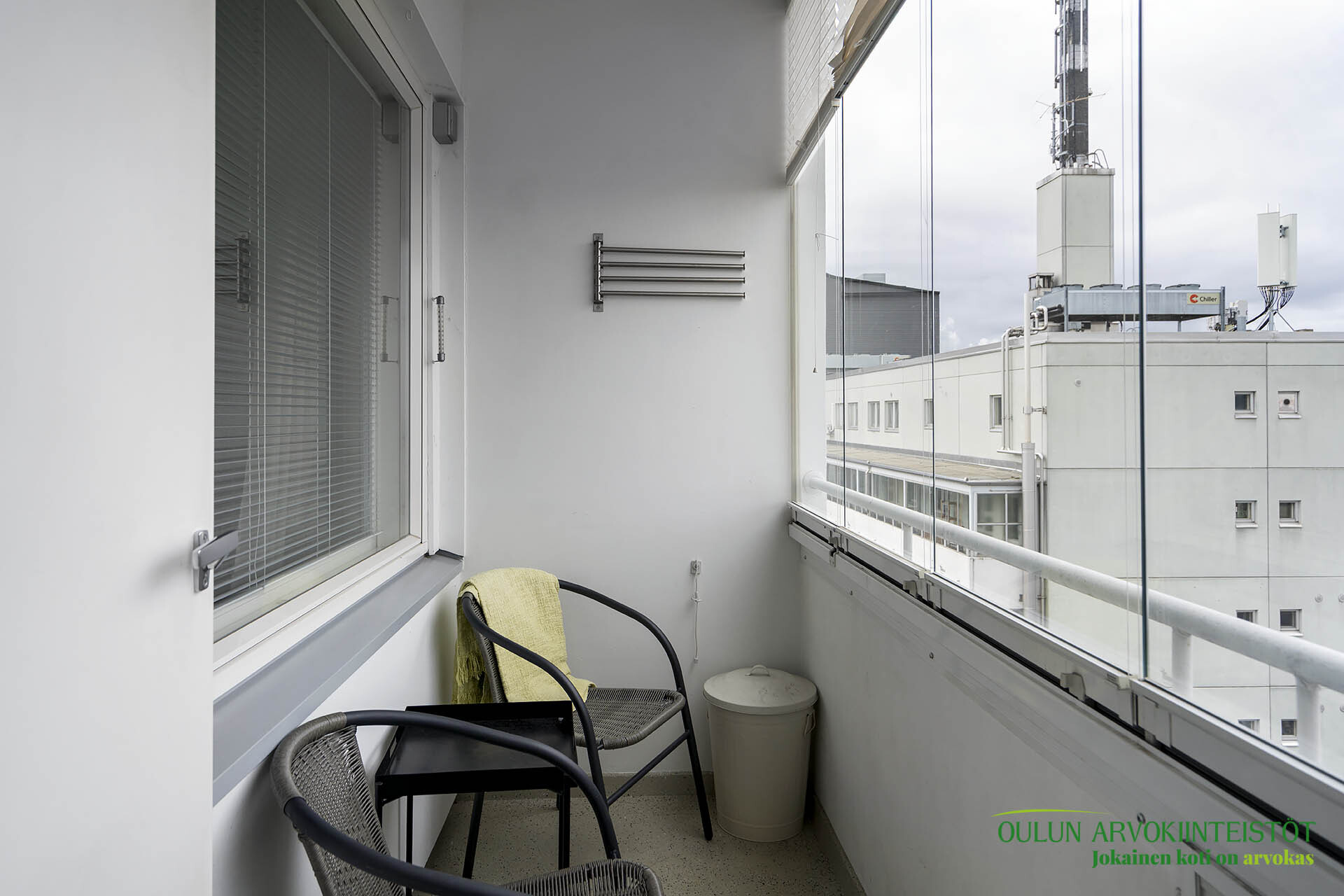 Lasitettu parveke ja verhot.