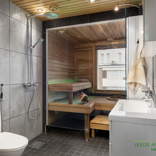 Varusteet: suihku, lattialämmitys, kiinteät valaisimet, allaskaappi, peilikaappi
