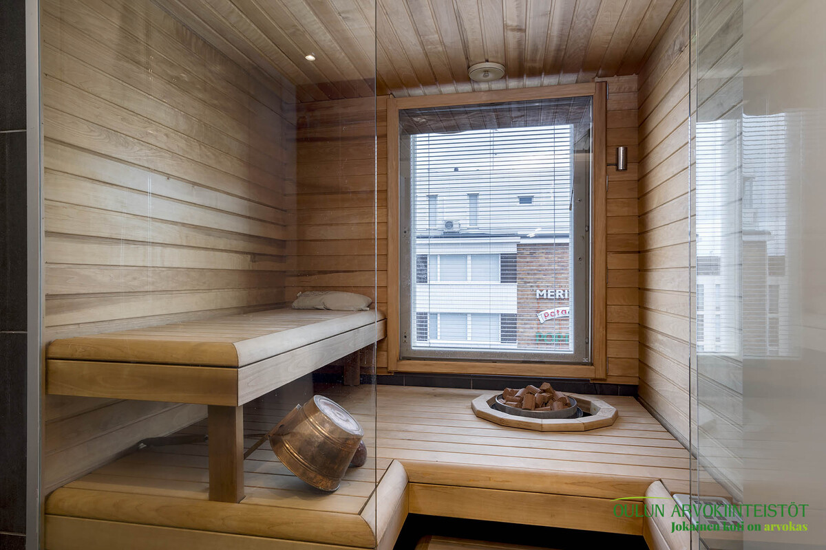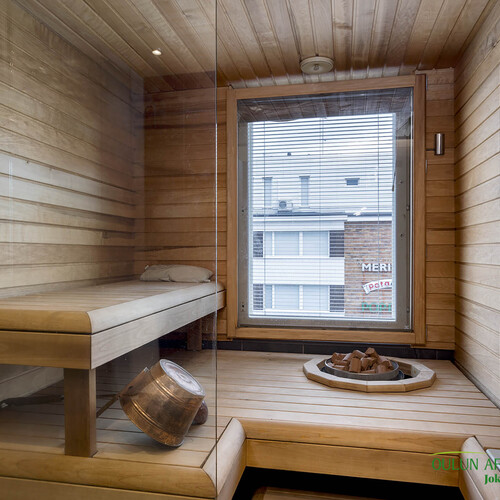 -Moderni sauna lasiseinällä ja ikkunalla