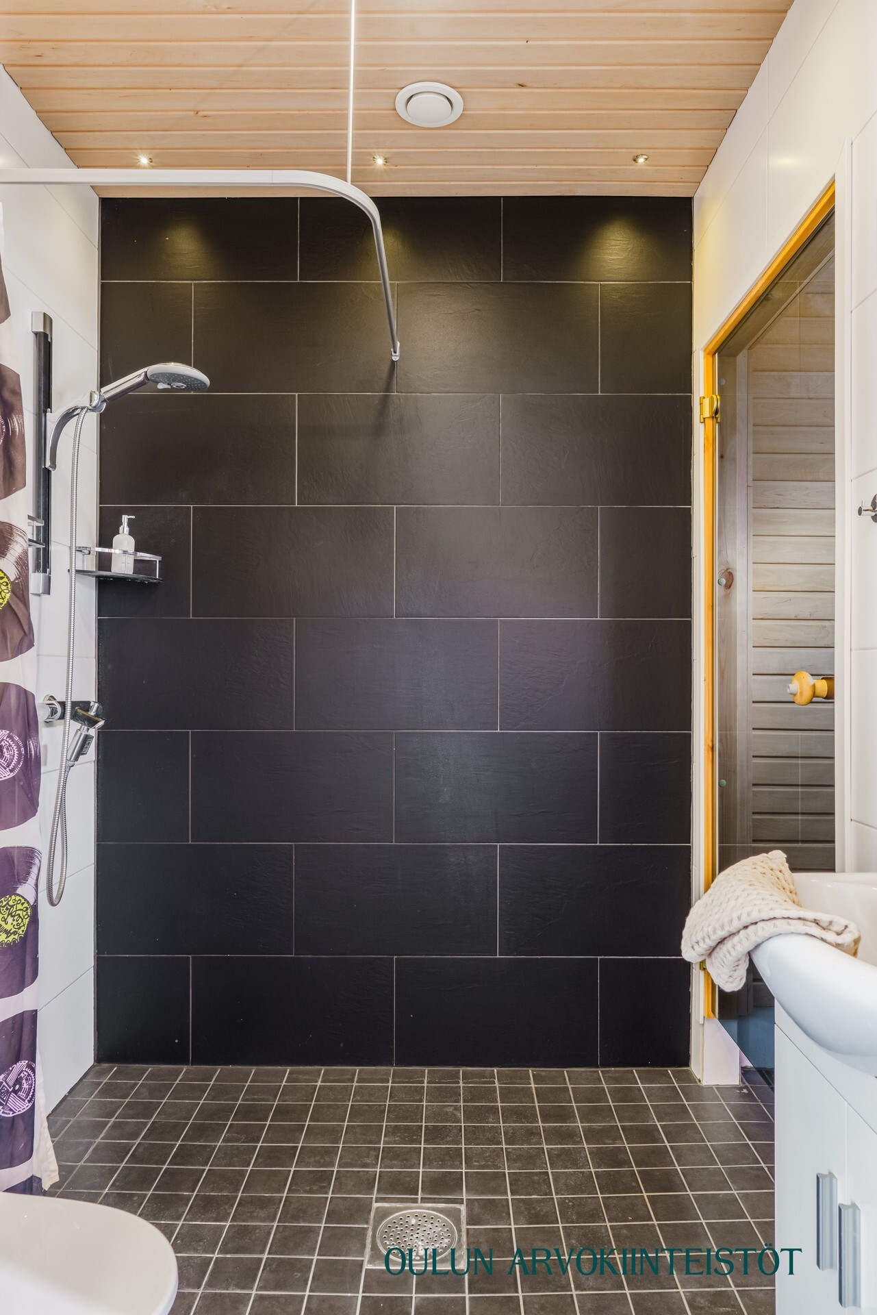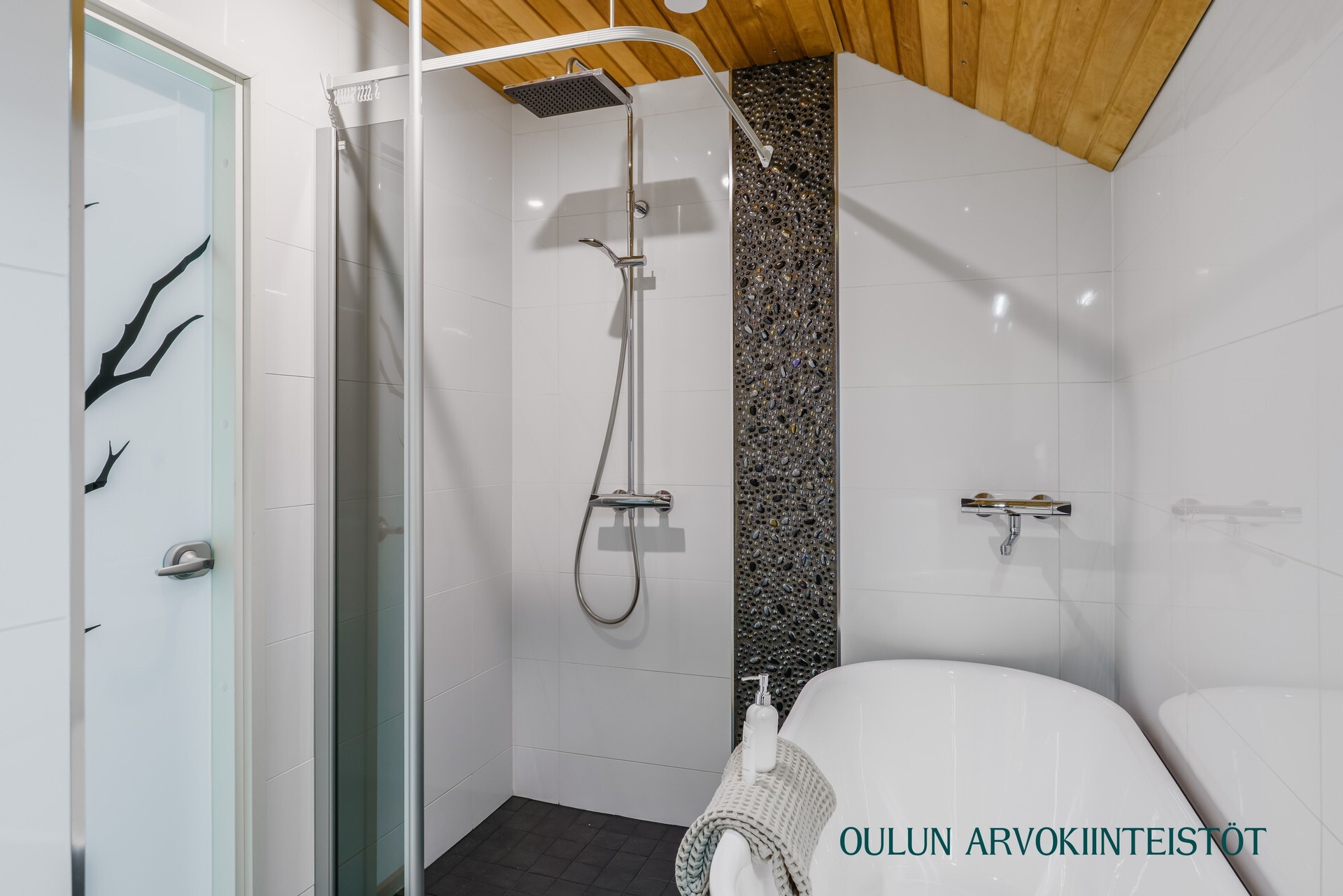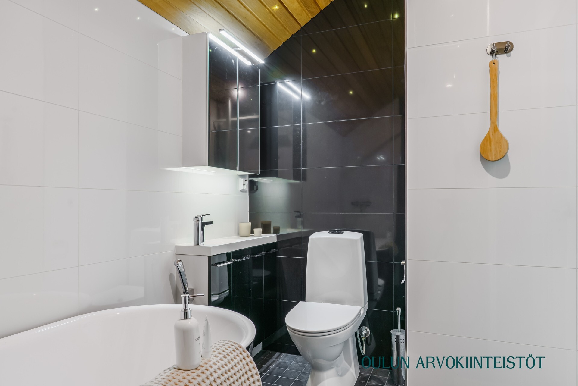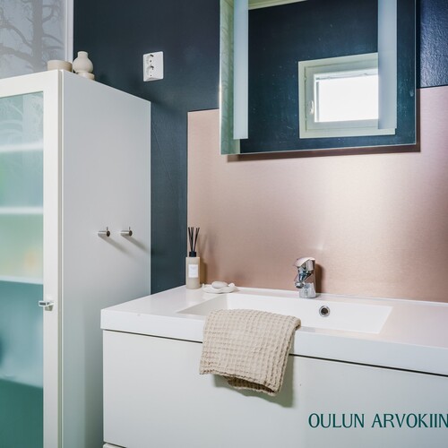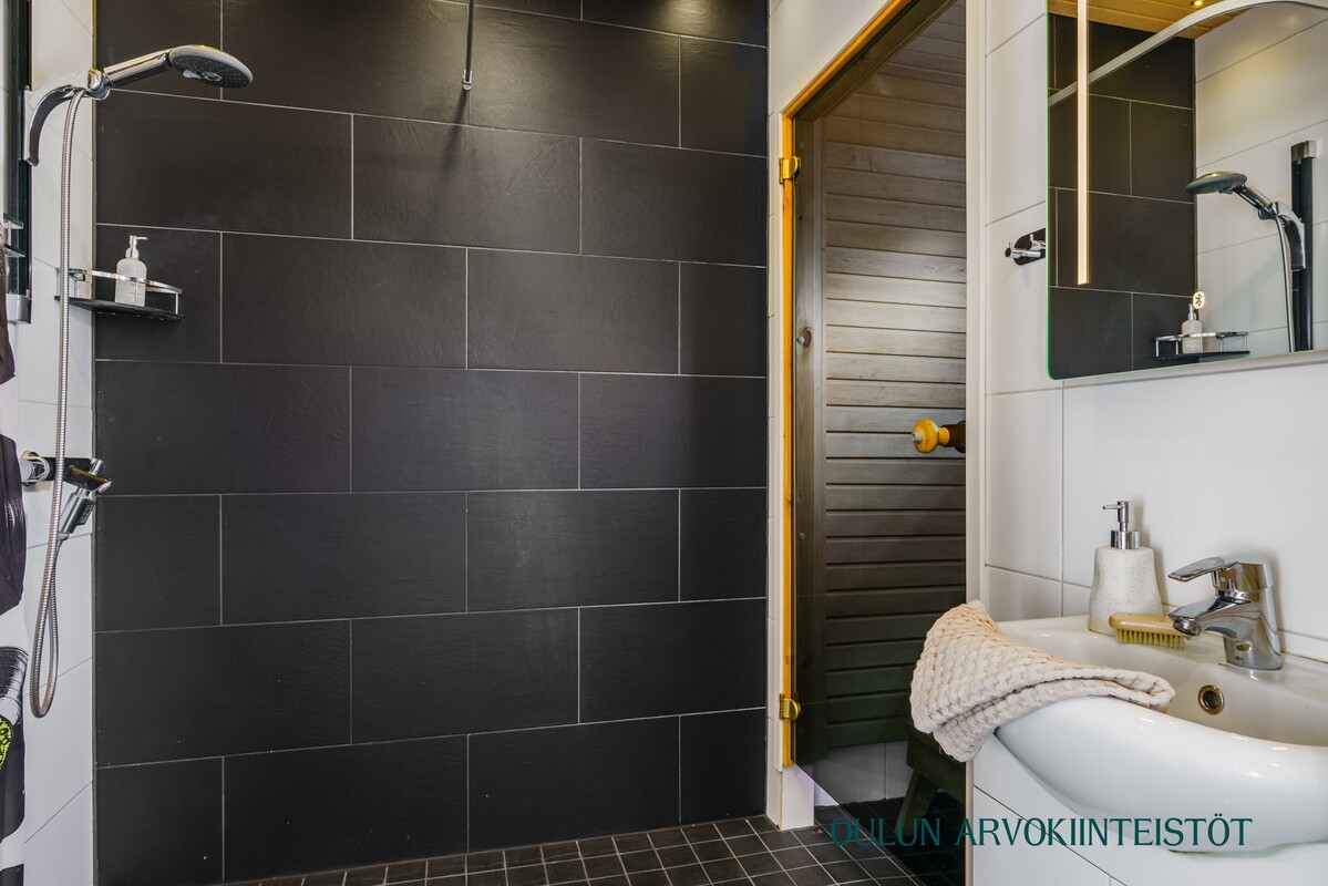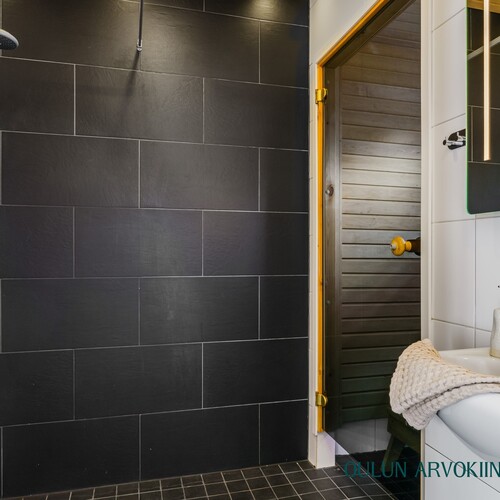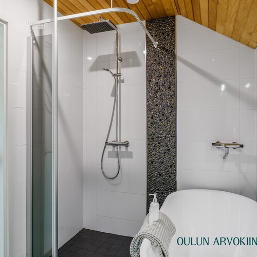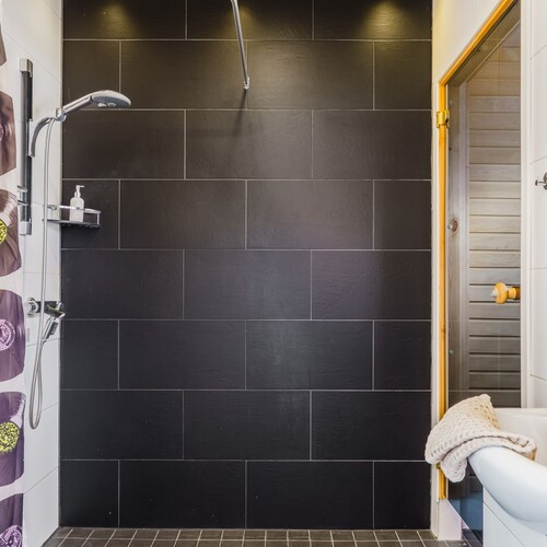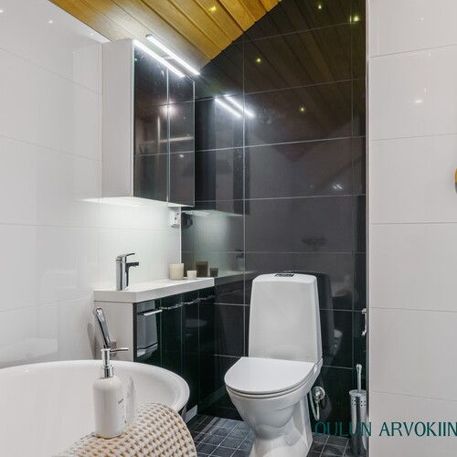 2.krs: Yläkerran kylpyhuoneessa yhdistyvät moderni ilme ja rauhallinen tunnelma. Vaaleat pinnat sekä tumma tehosteseinä luovat tyylikkään kokonaisuuden. Tilassa on suihku, wc sekä kaunis kylpyamme, joka tarjoaa mahdollisuuden rentouttaviin kylpyhetkiin.