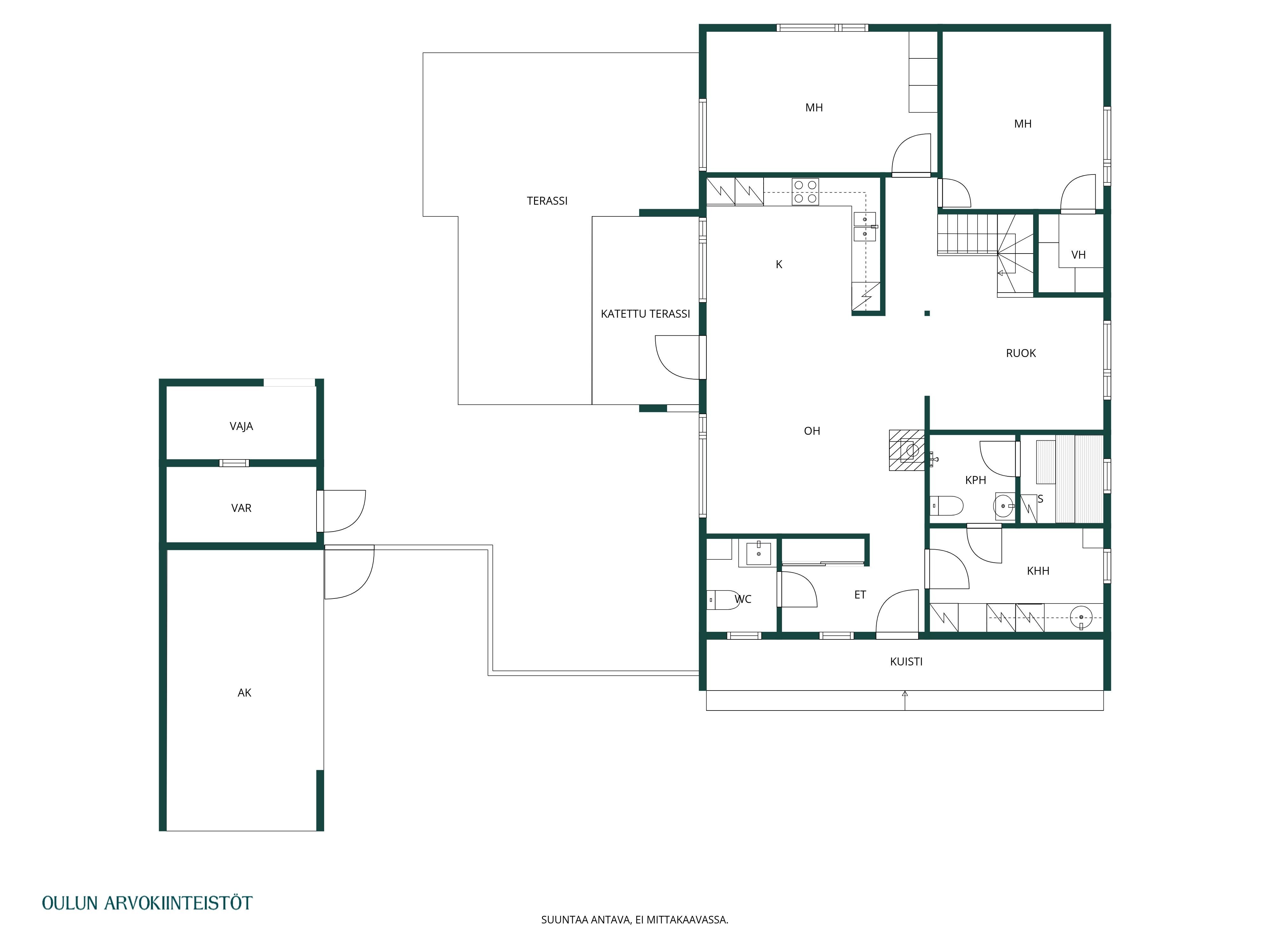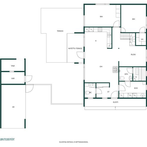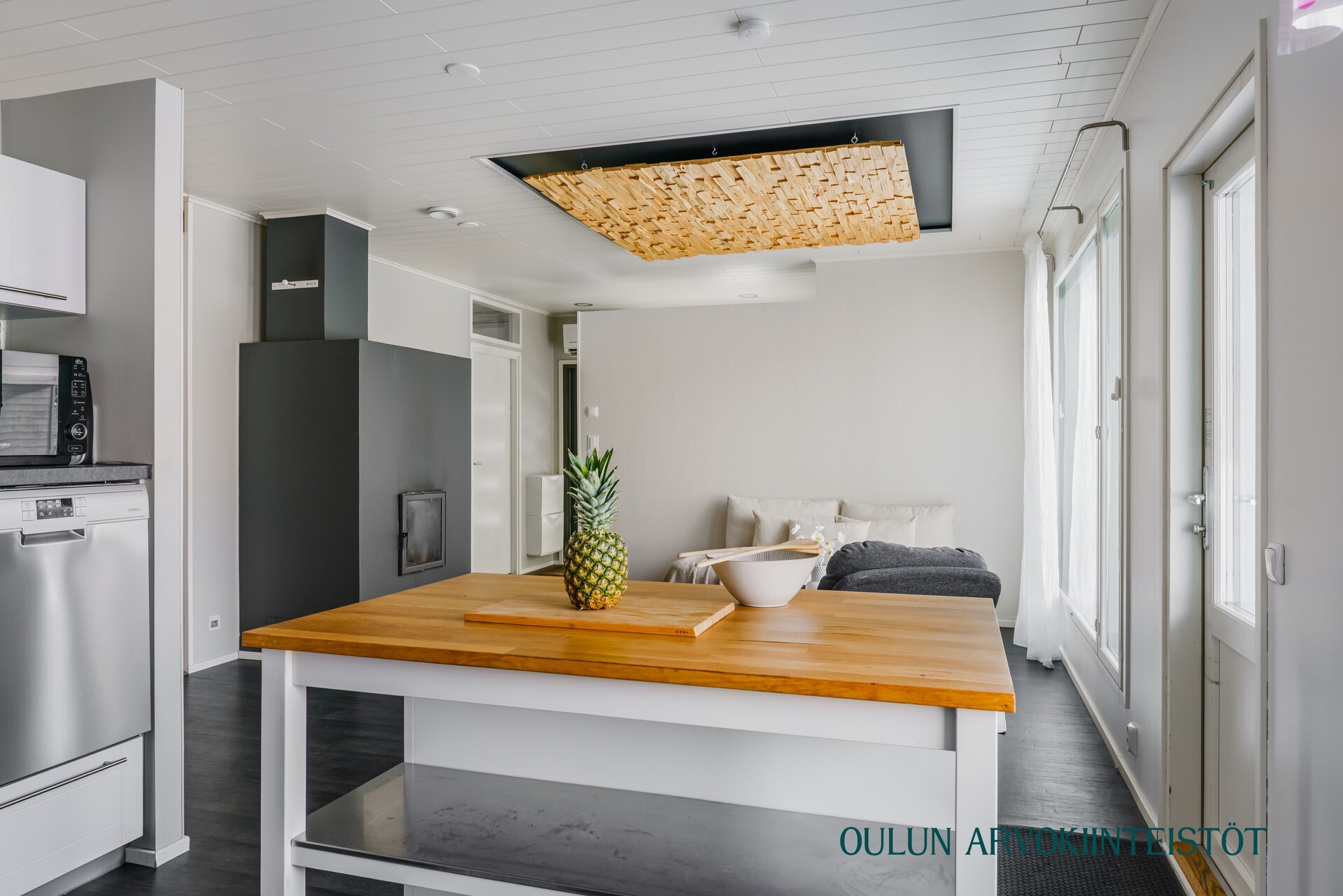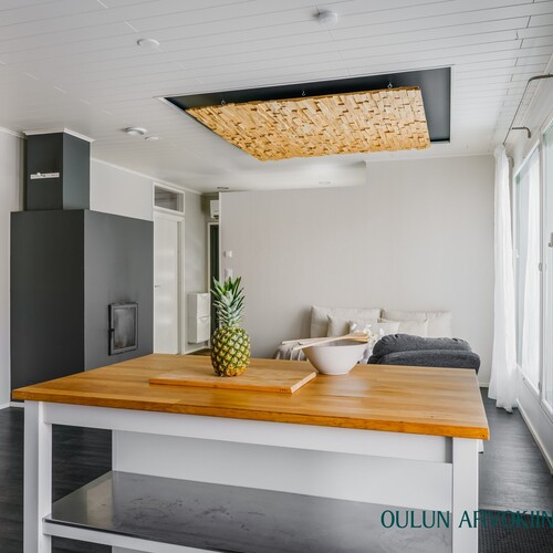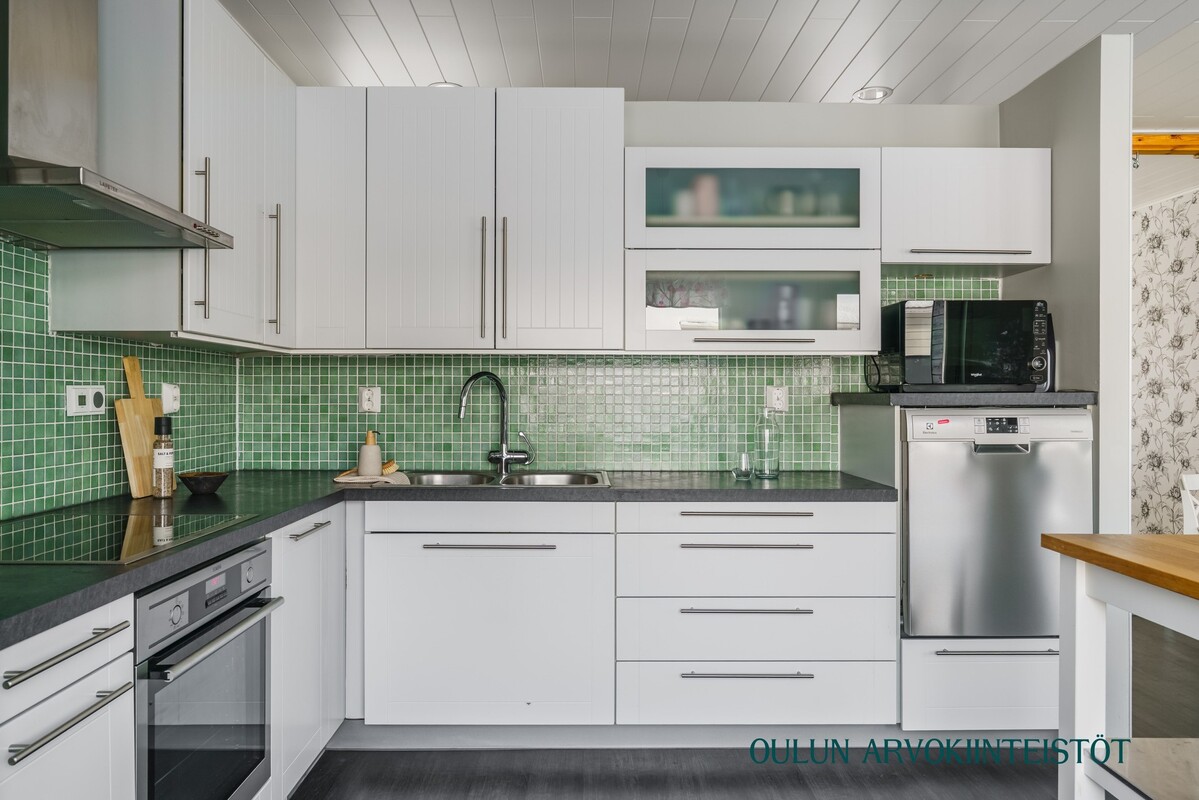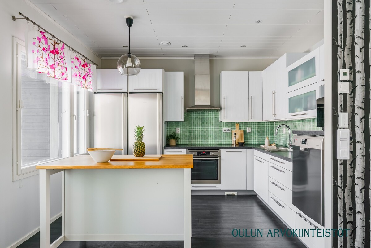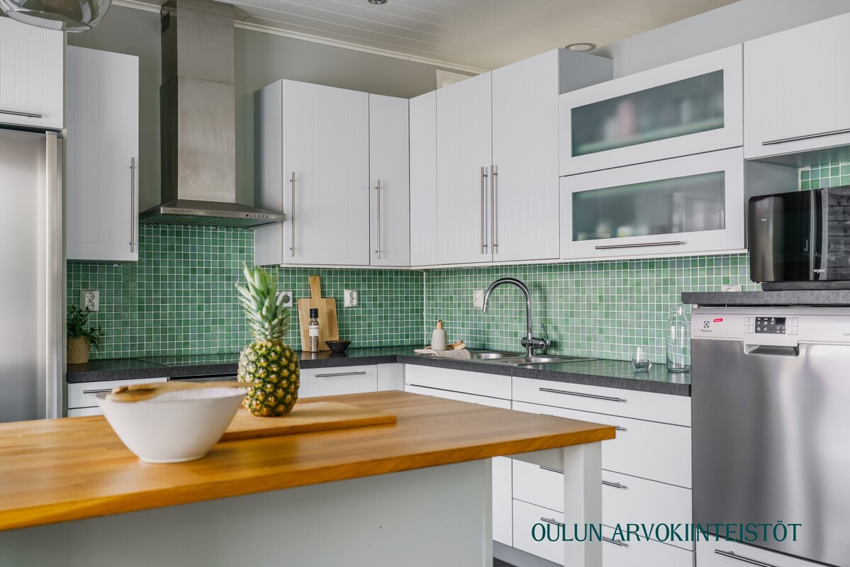 Varusteet: jääkaappi, pakastin, irralliset saarekkeet, induktioliesi, erillisuuni, kiinteät valaisimet, liesituuletin hormilla, integroitu astianpesukone