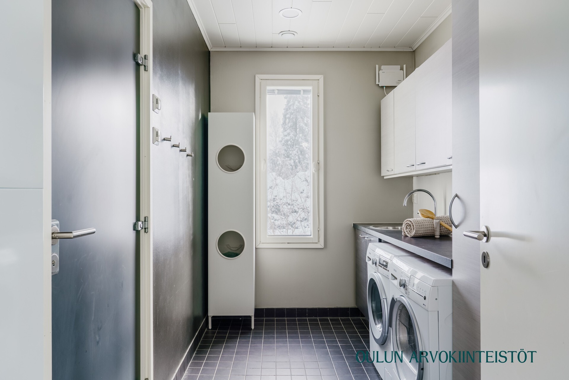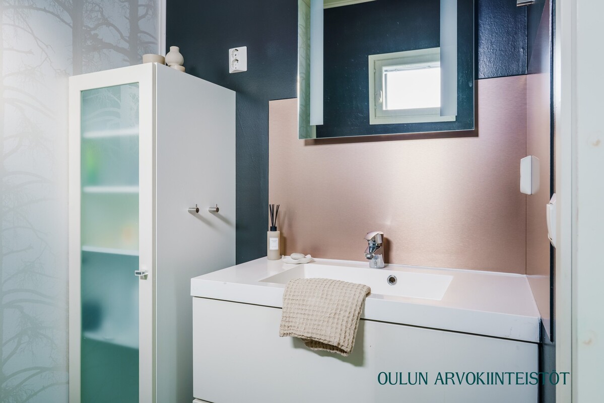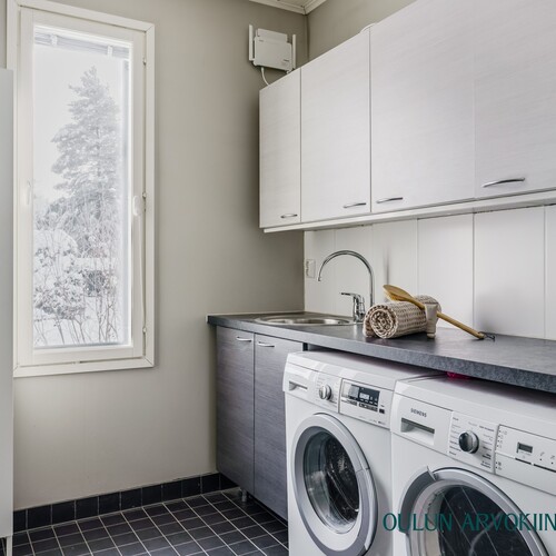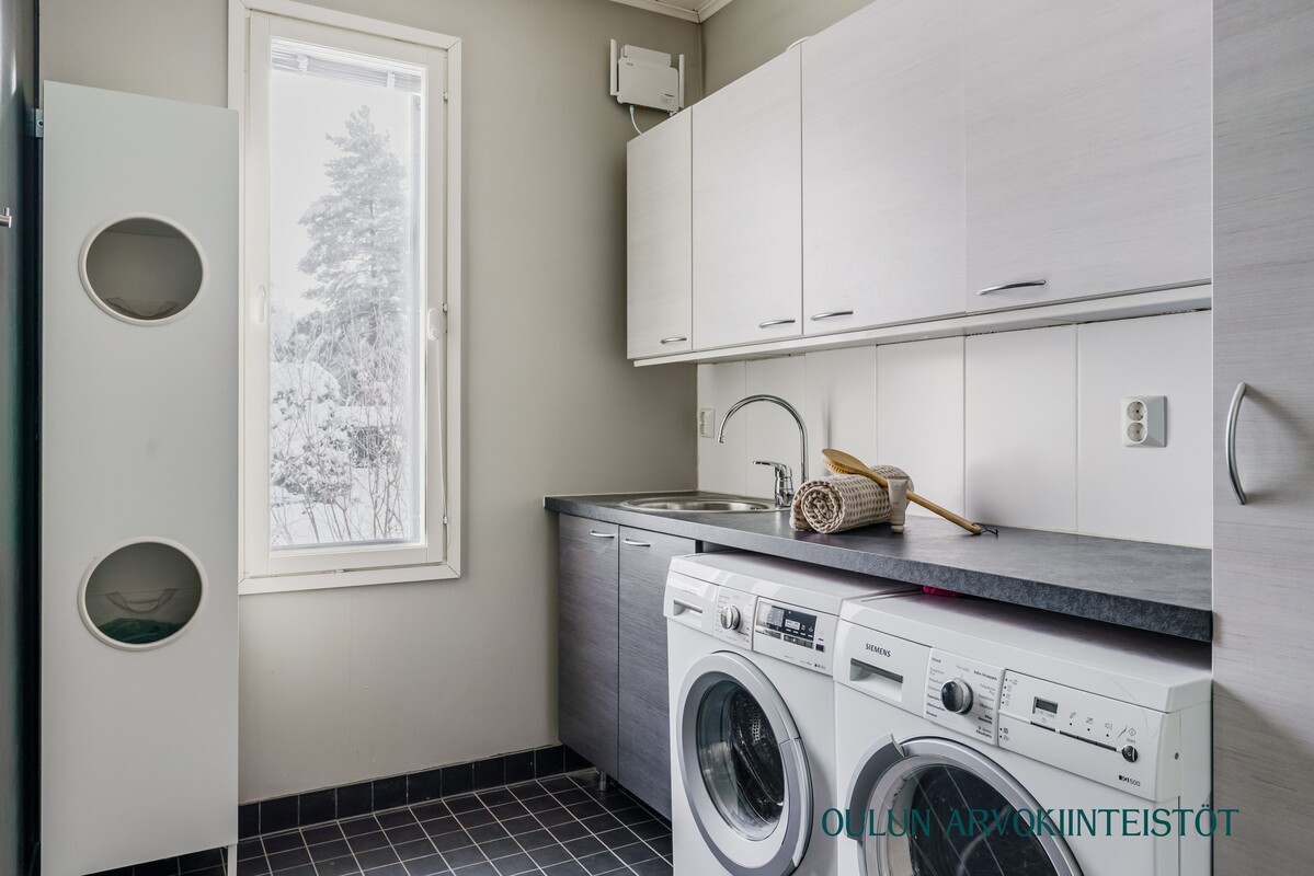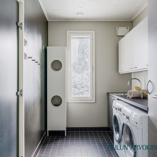 Varusteet: lattiakaivo, pyykkikaapit, pesuallas, pöytätaso, lattialämmitys, pesukoneliitäntä
