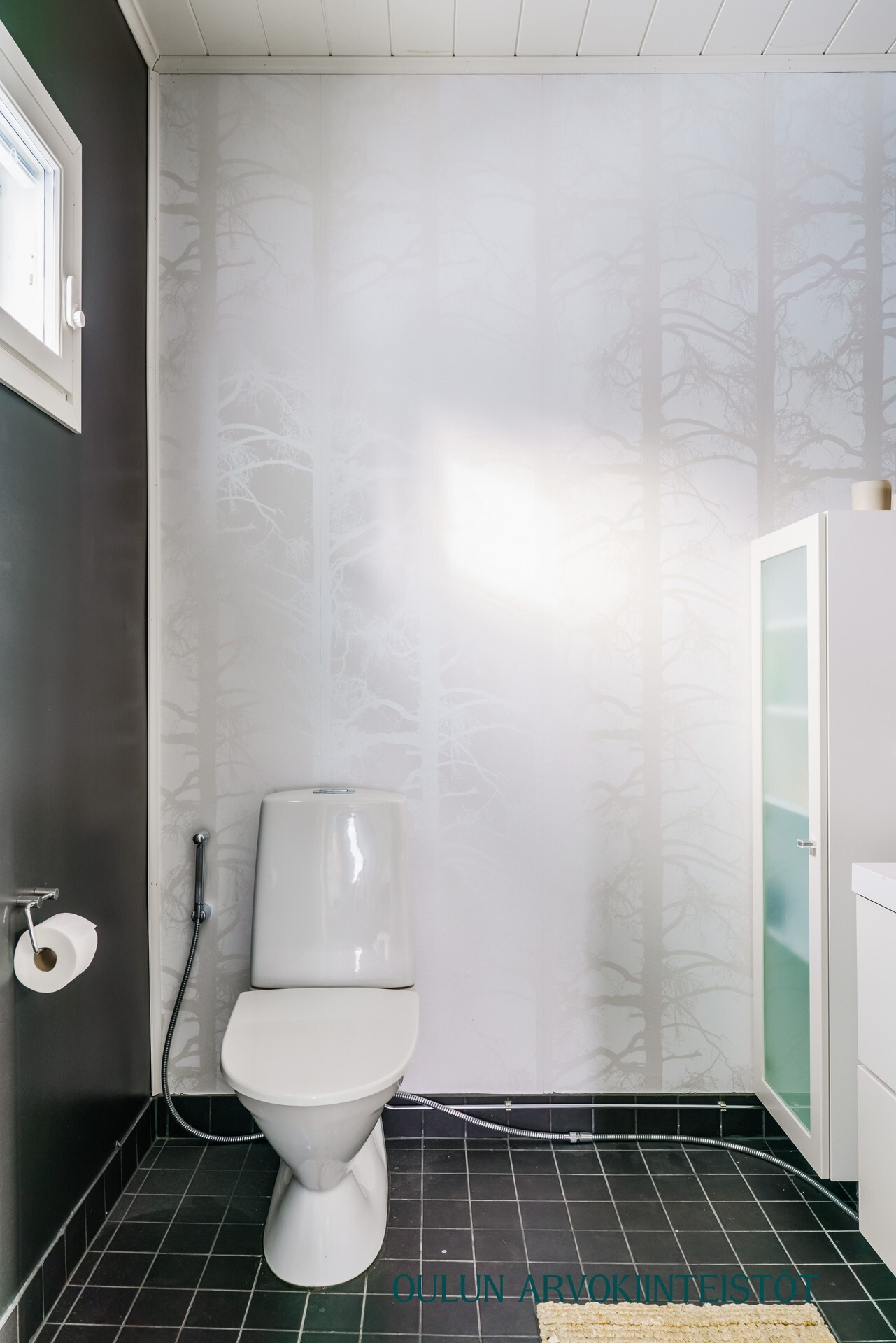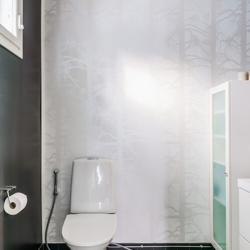 Varusteet: lattiaan asennettu WC, bidee, lattialämmitys, lattiakaivo, peili, allaskaappi
